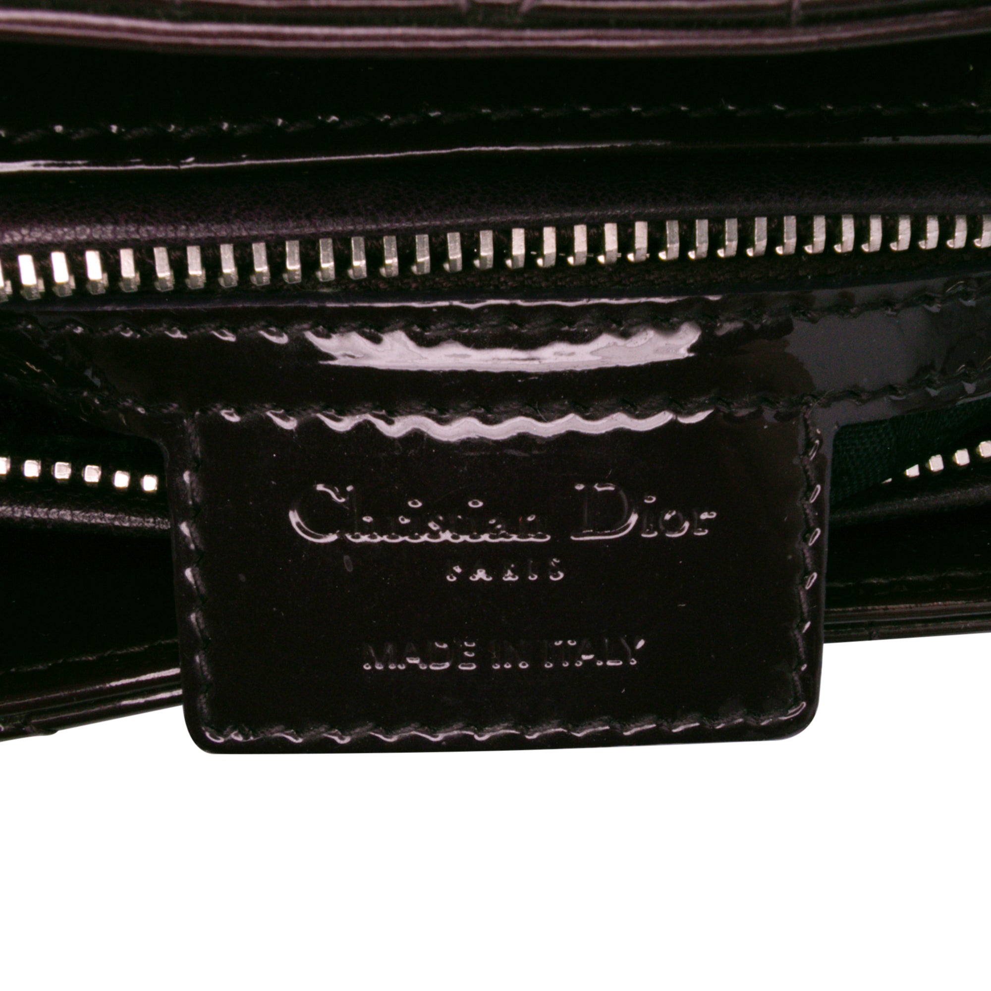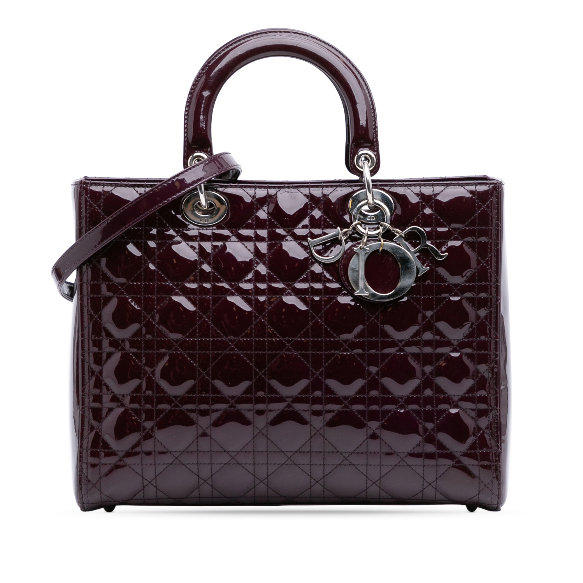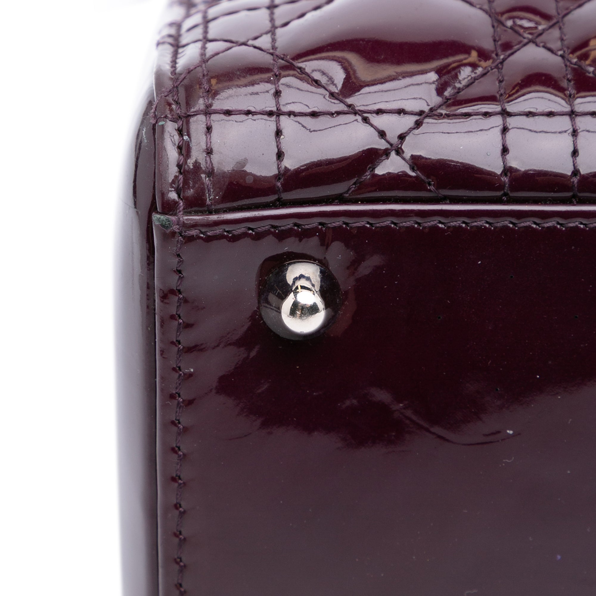 The Lady Dior features a quilted patent leather body, rolled top handles, a detachable flat leather strap, a top zip closure, and an interior zip pocket. Retail Price: 6500.00