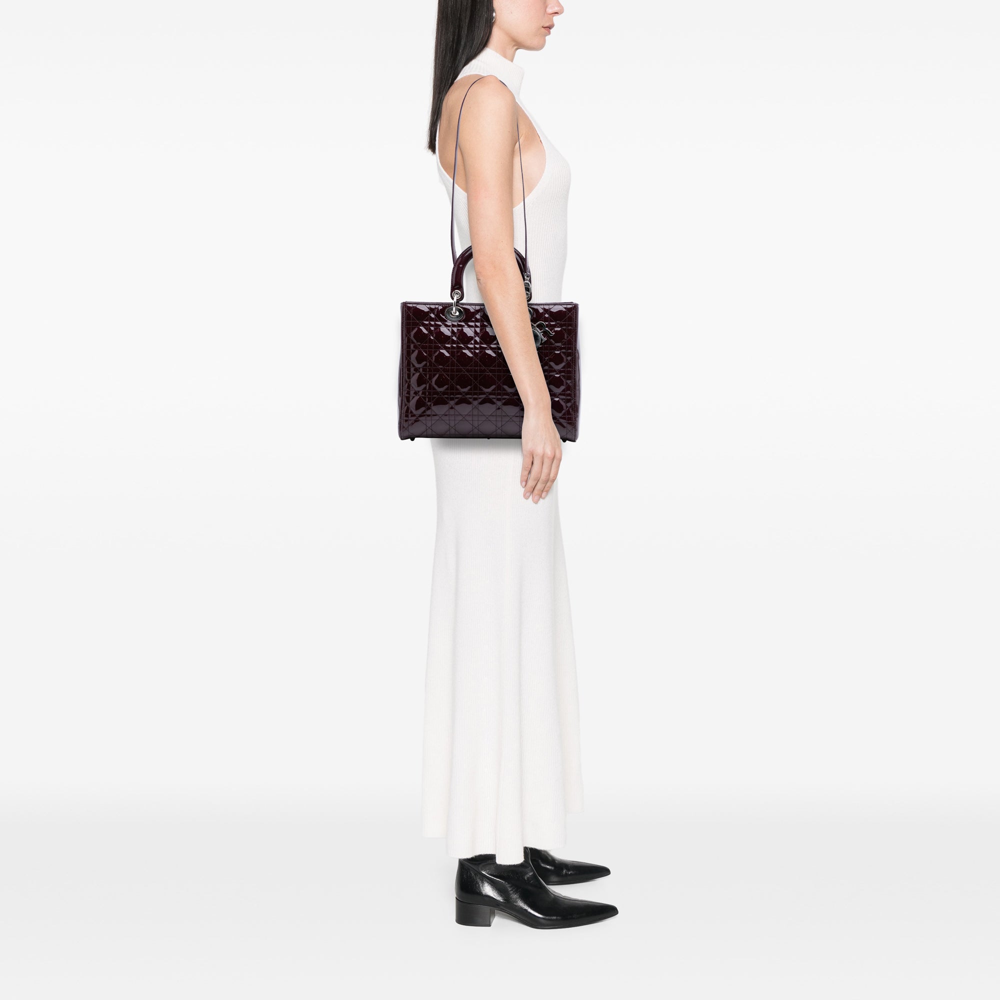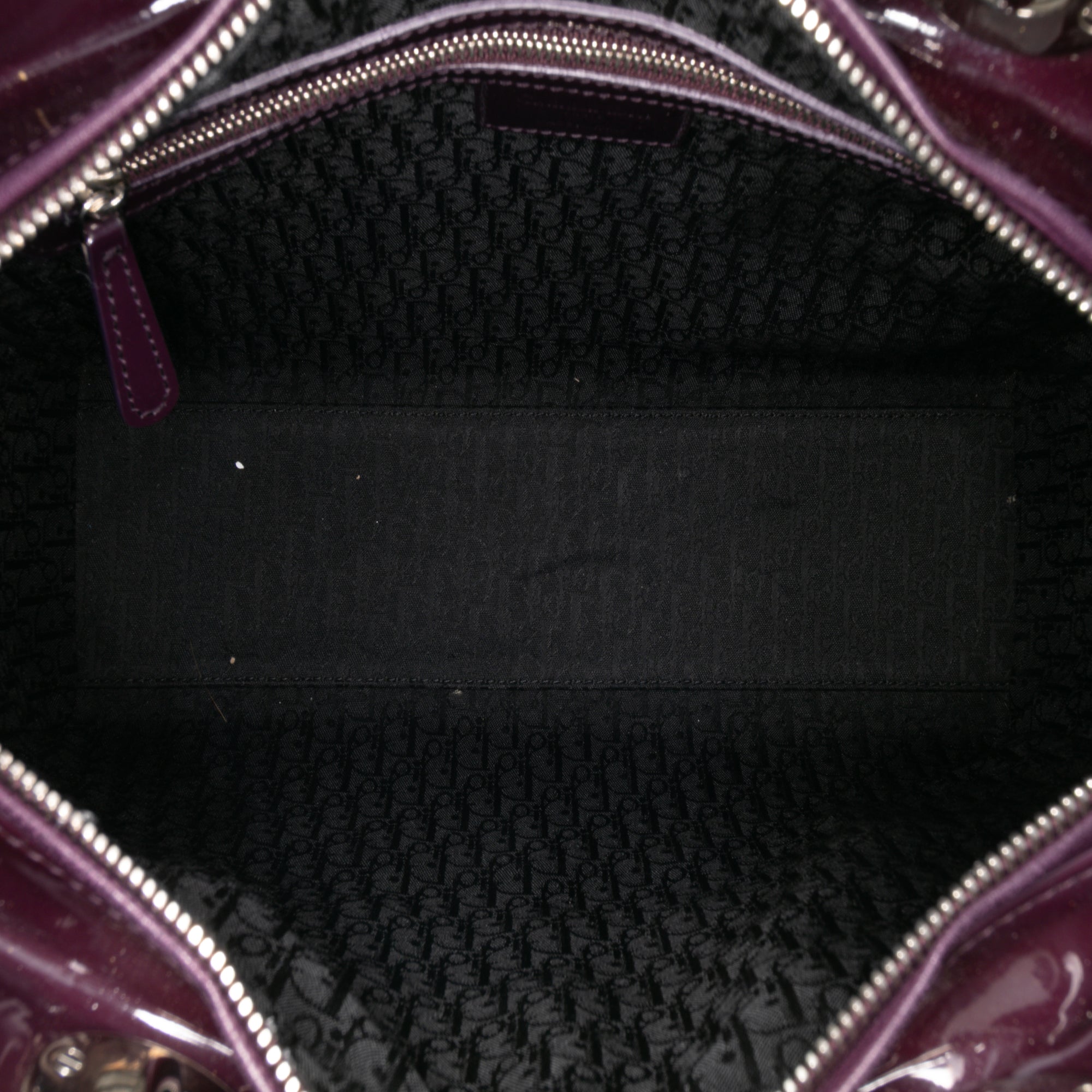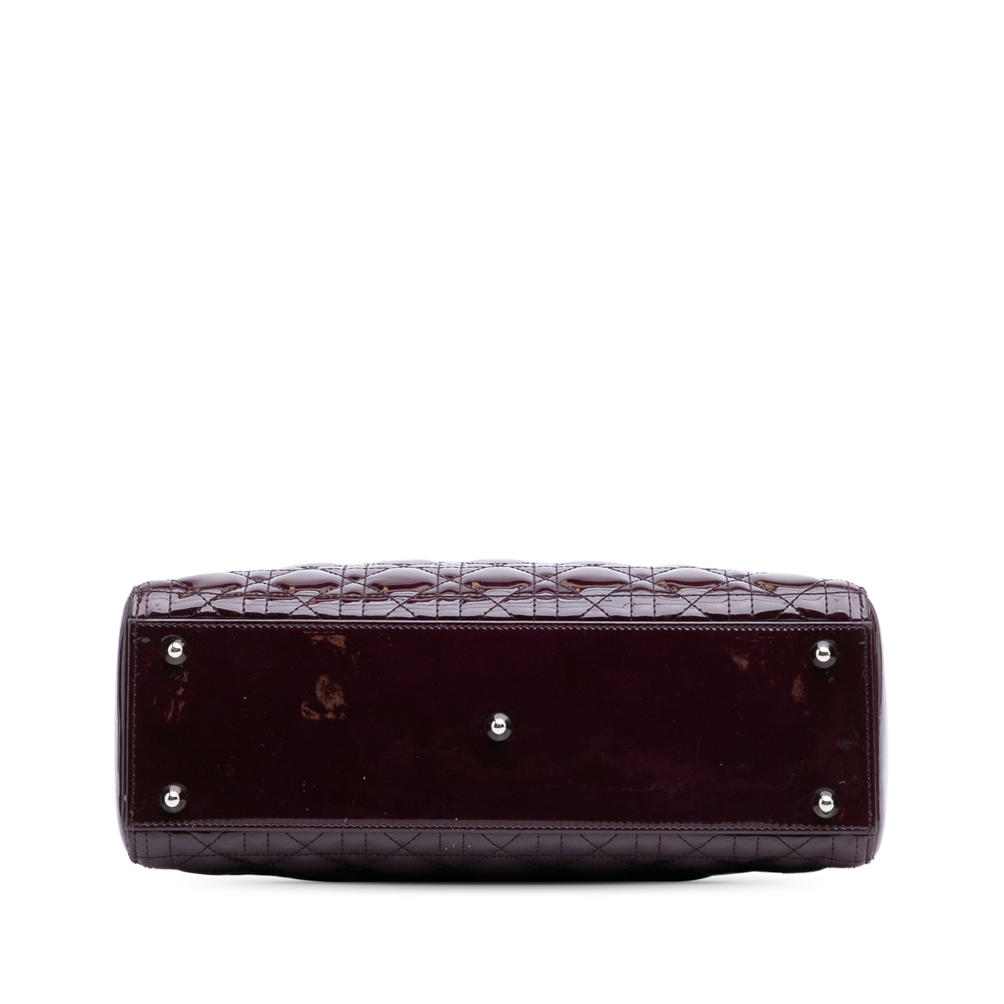 The Lady Dior features a quilted patent leather body, rolled top handles, a detachable flat leather strap, a top zip closure, and an interior zip pocket. Retail Price: 6500.00