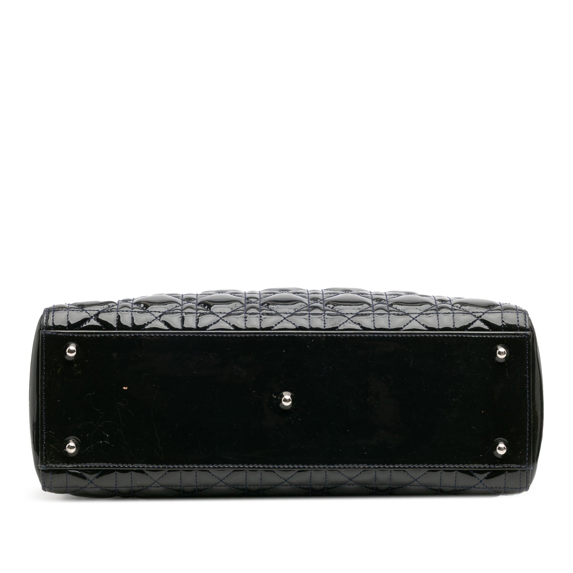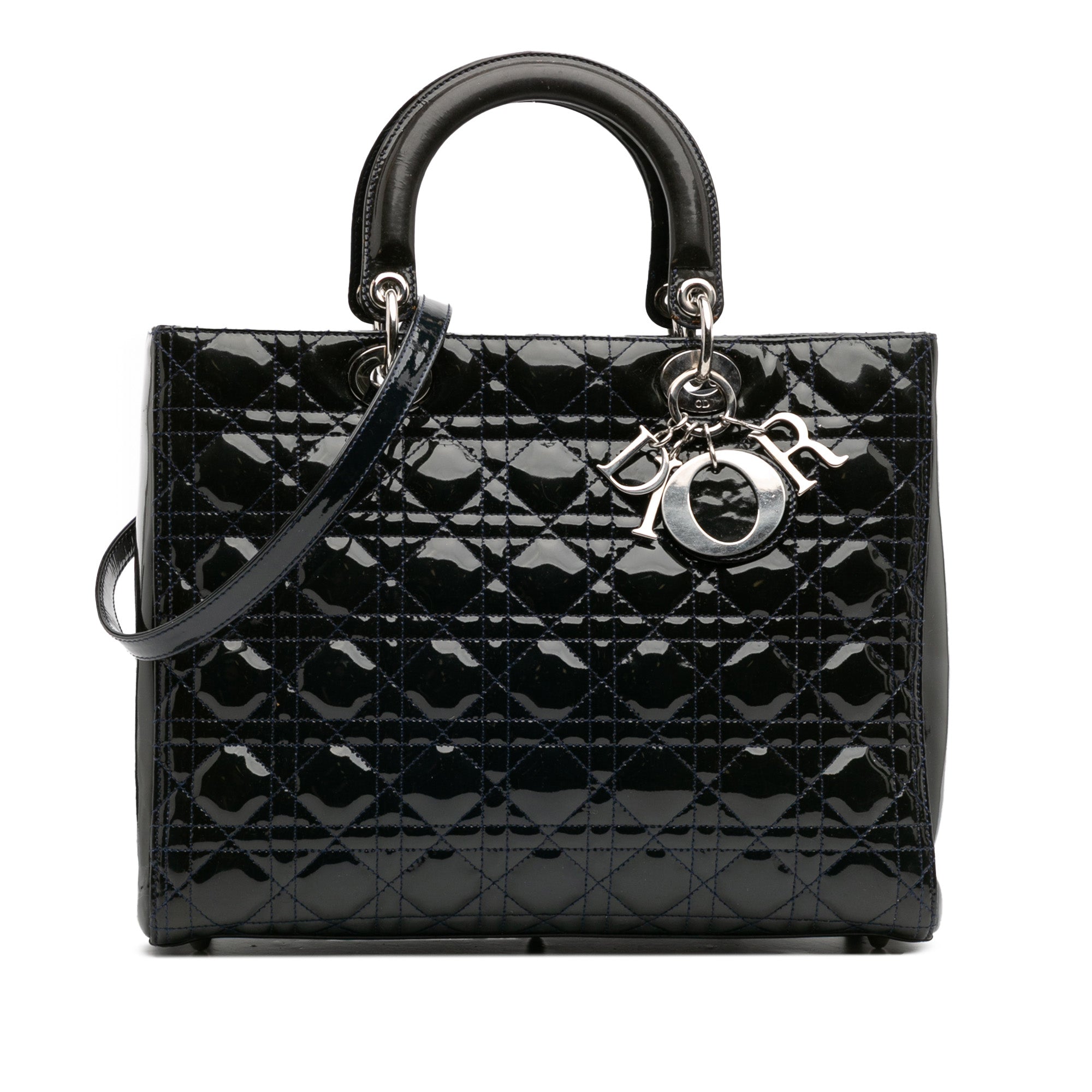 The Lady Dior features a quilted patent leather body, flat leather top handles, a detachable flat strap, a top zip closure, and an interior zip pocket. Retail Price: 6184.00