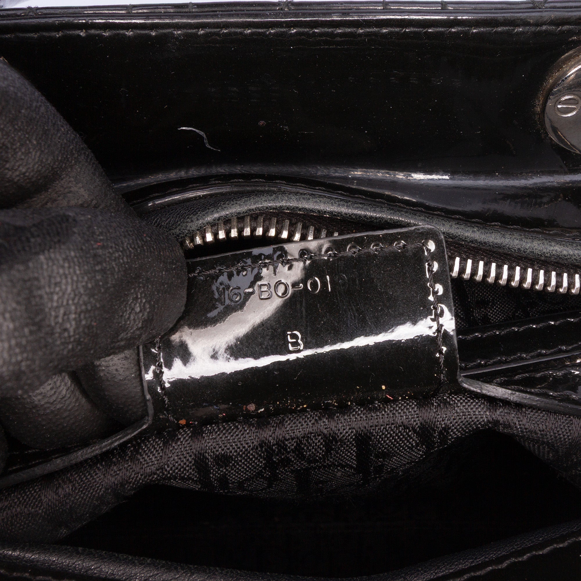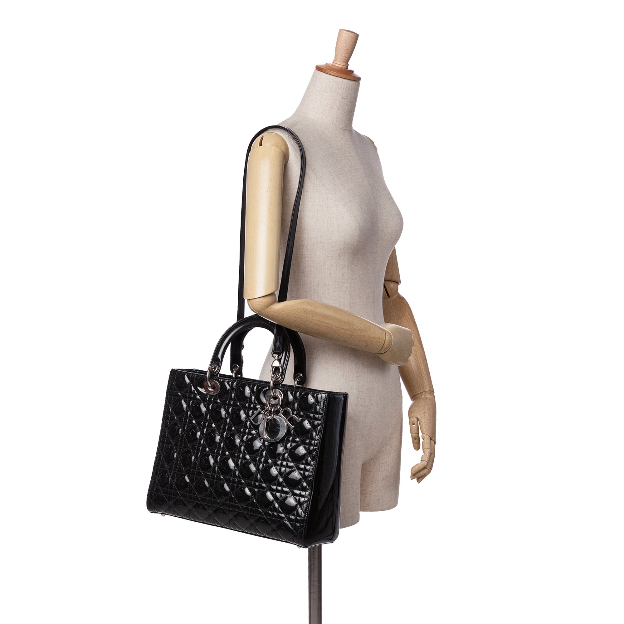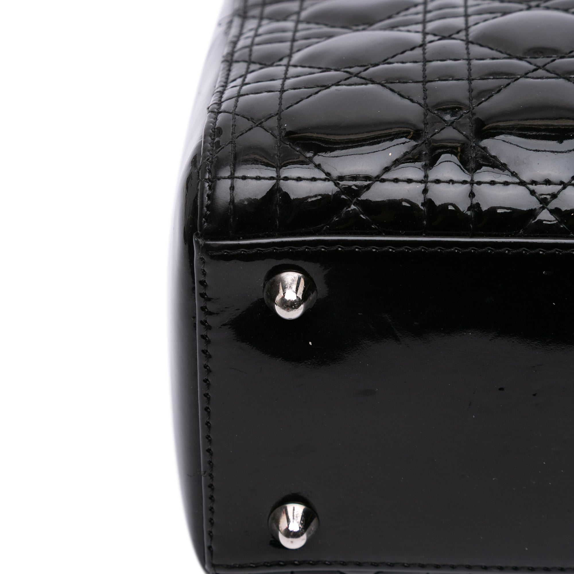 The Lady Dior features a quilted patent leather body, flat leather top handles, a detachable flat strap, a top zip closure, and an interior zip pocket. Retail Price: 6184.00