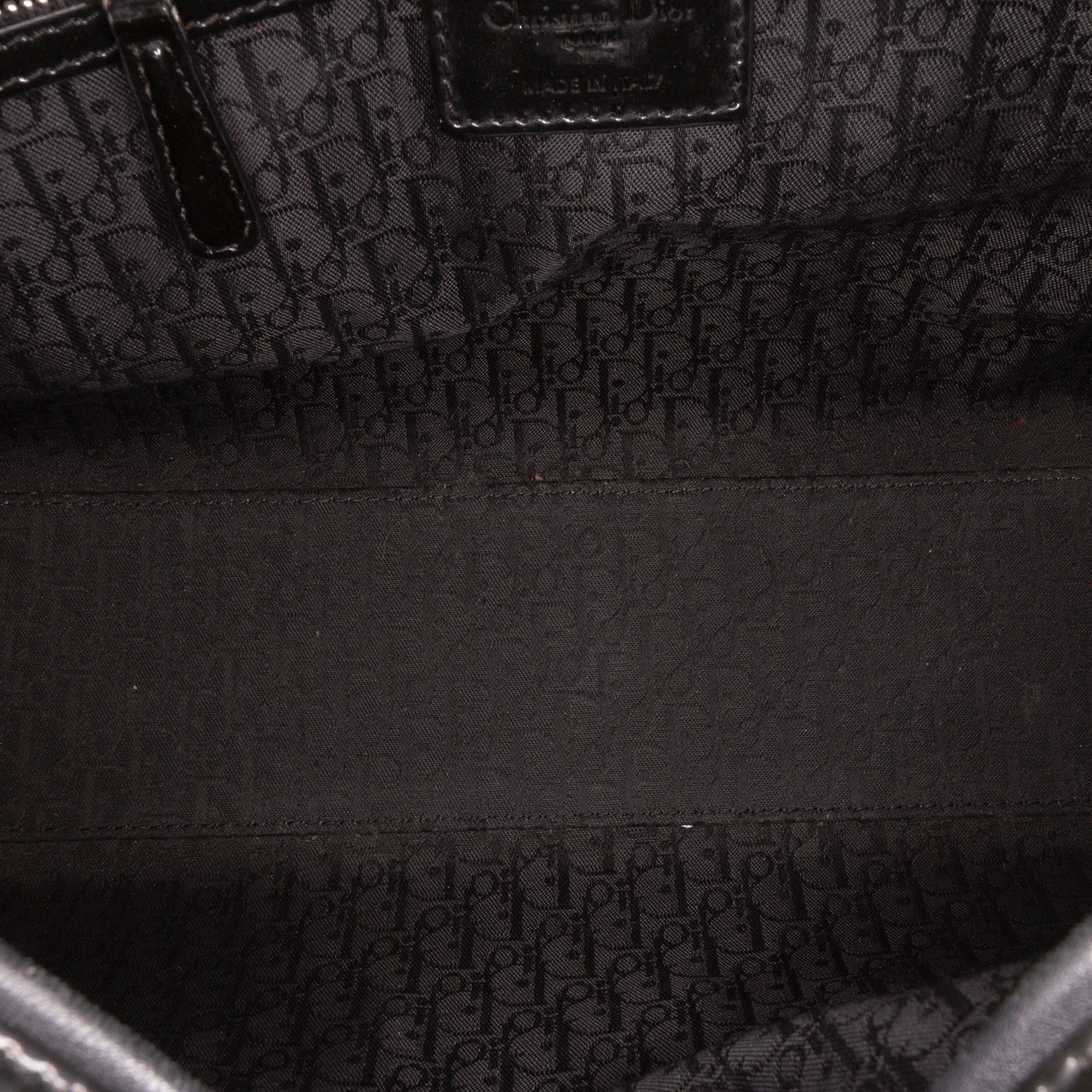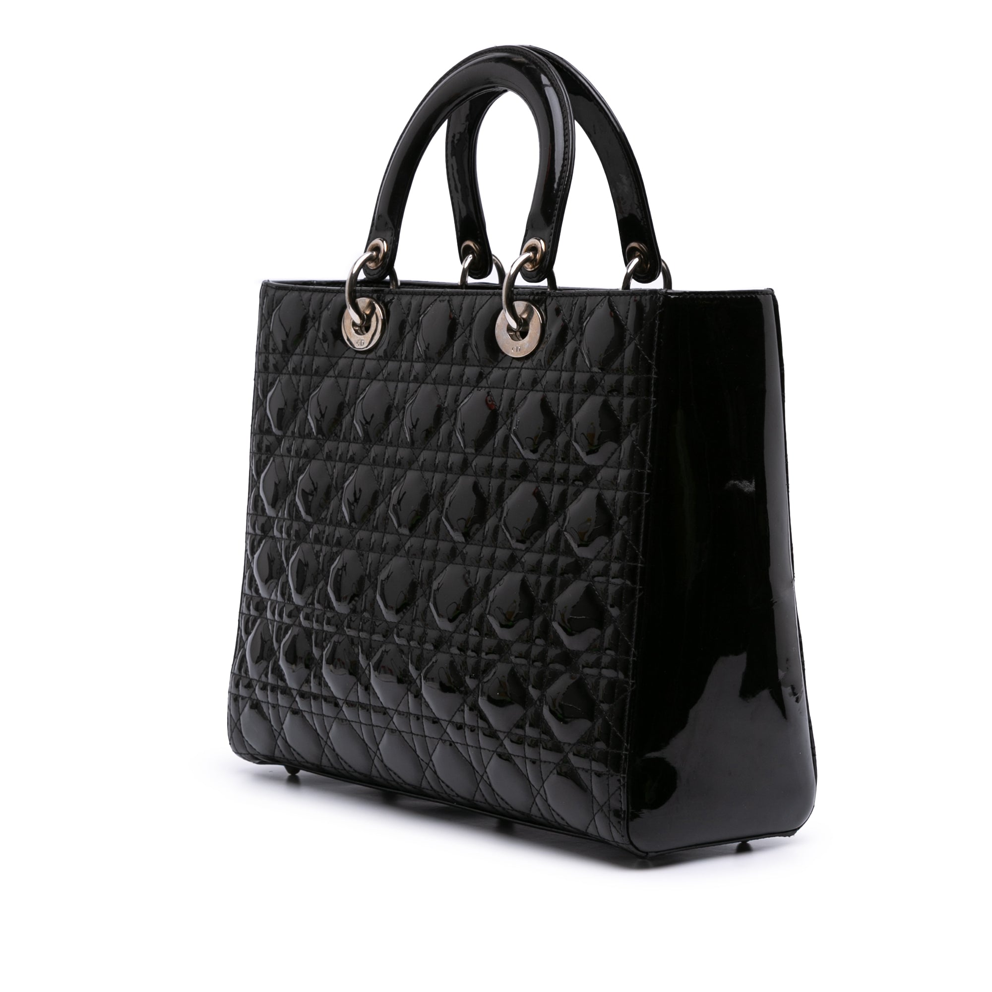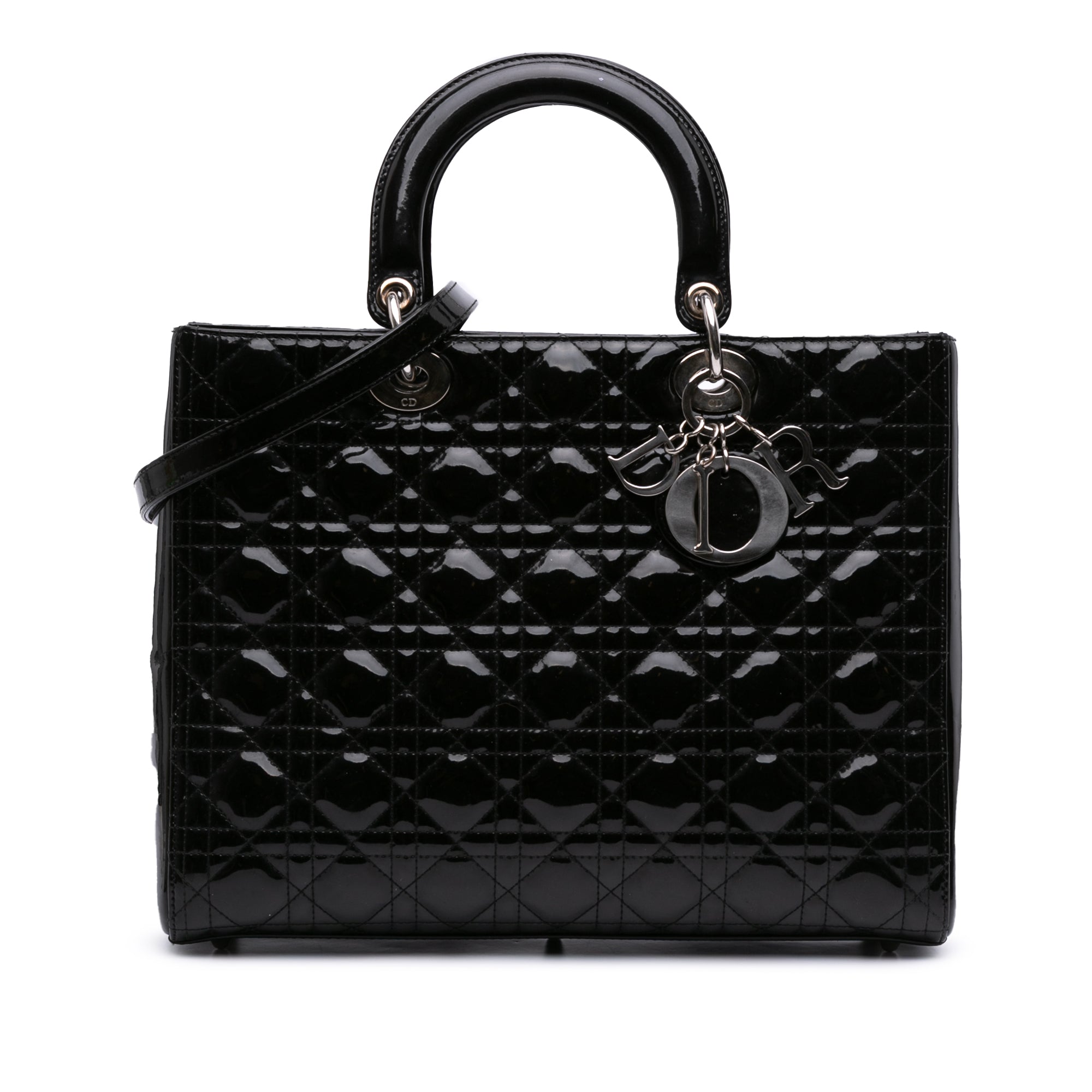 The Lady Dior features a quilted patent leather body, flat leather top handles, a detachable flat strap, a top zip closure, and an interior zip pocket. Retail Price: 6184.00