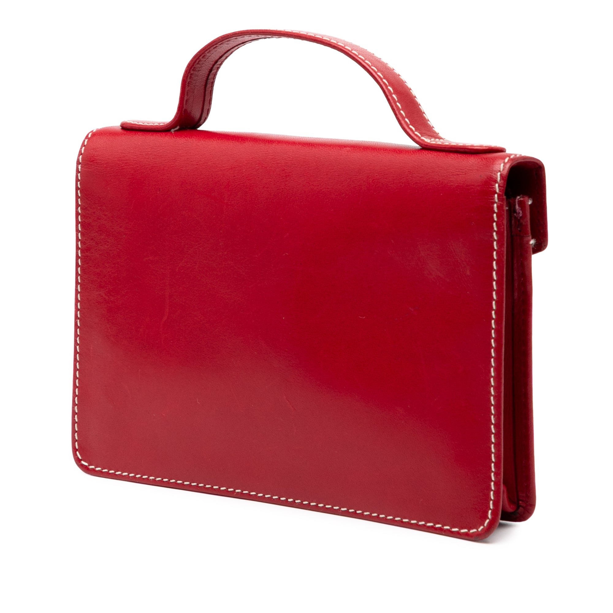 This handbag features a leather body, a flat leather top handle, a top flap with snap button closure, and interior pockets. Retail Price: 1044.00