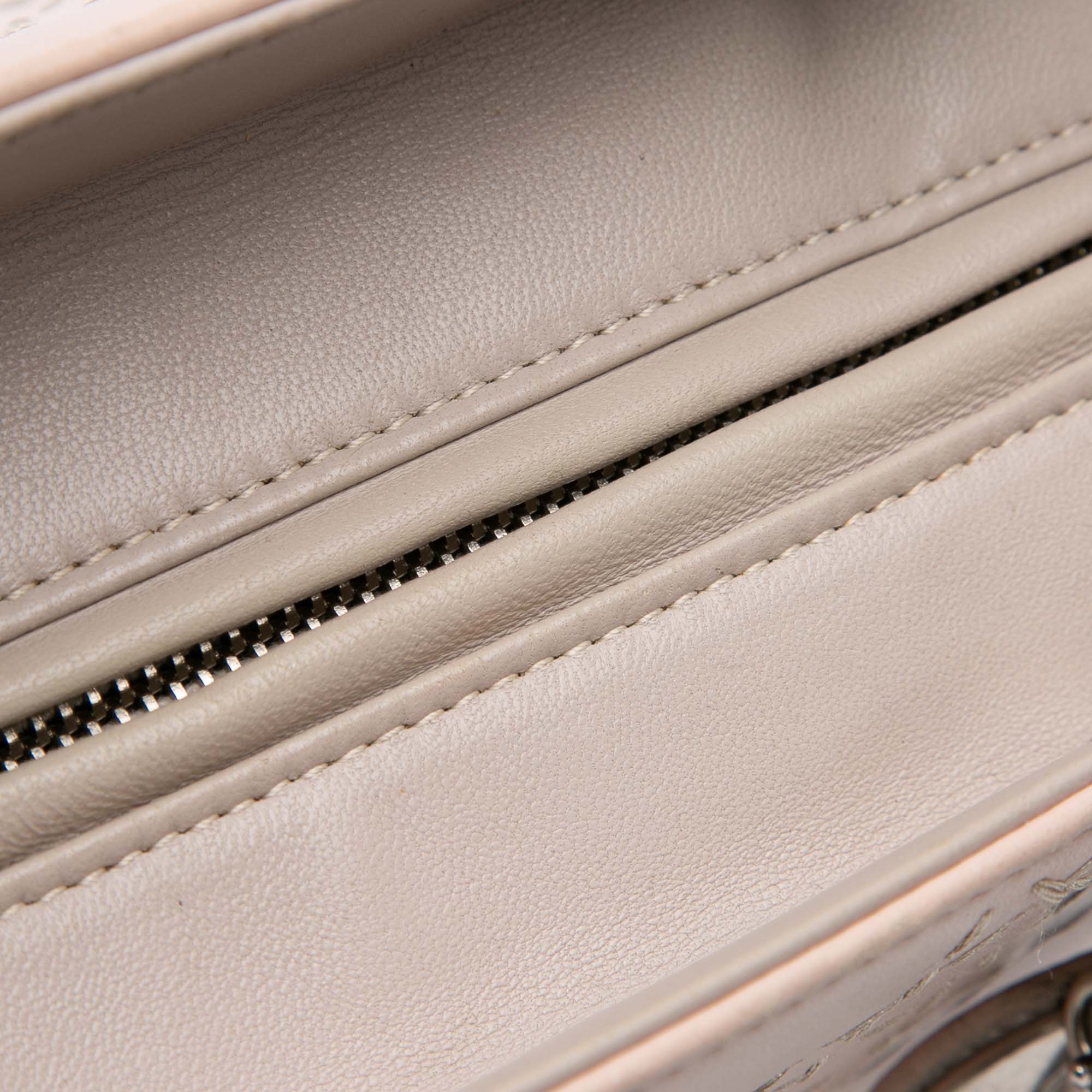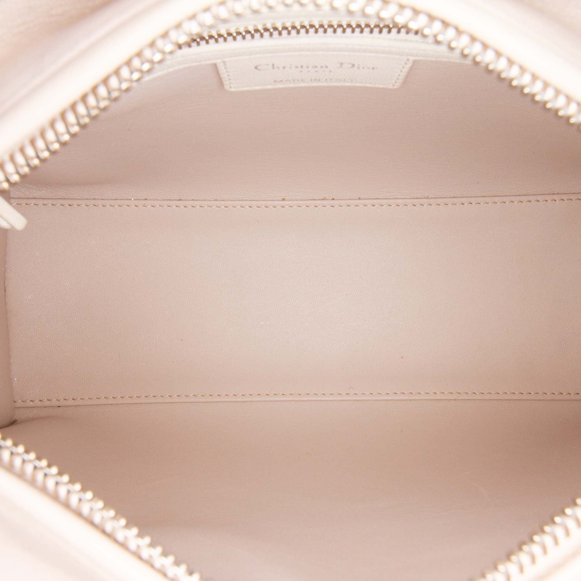 The Lady Dior features a stitched lambskin leather body, flat leather top handles, a detachable flat strap, a top zip closure, and an interior zip pocket. Retail Price: 6050.00