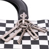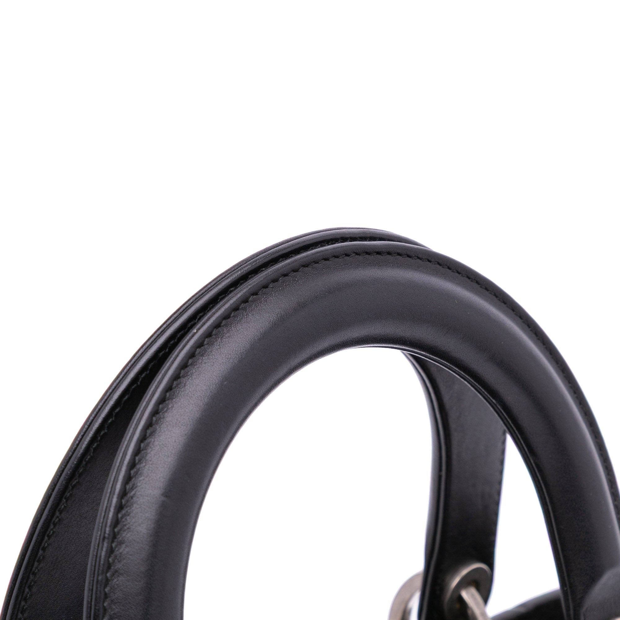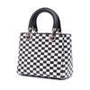 The Lady Dior features a leather body, flat leather handles, a detachable flat shoulder strap, a fold in flap closure, and interior zip and slip pockets. Retail Price: 4700.00