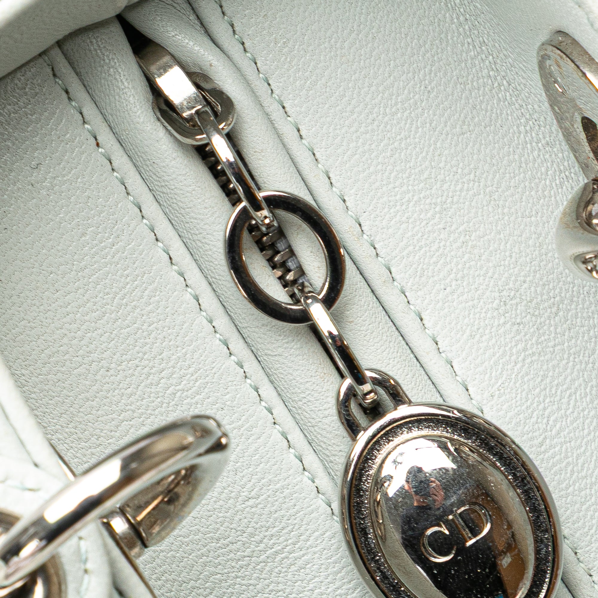 The Lady Dior satchel features an embroidered leather body, flat leather handles, a detachable flat leather strap, a top zip closure, and an interior zip pocket. Retail Price: 6100.00