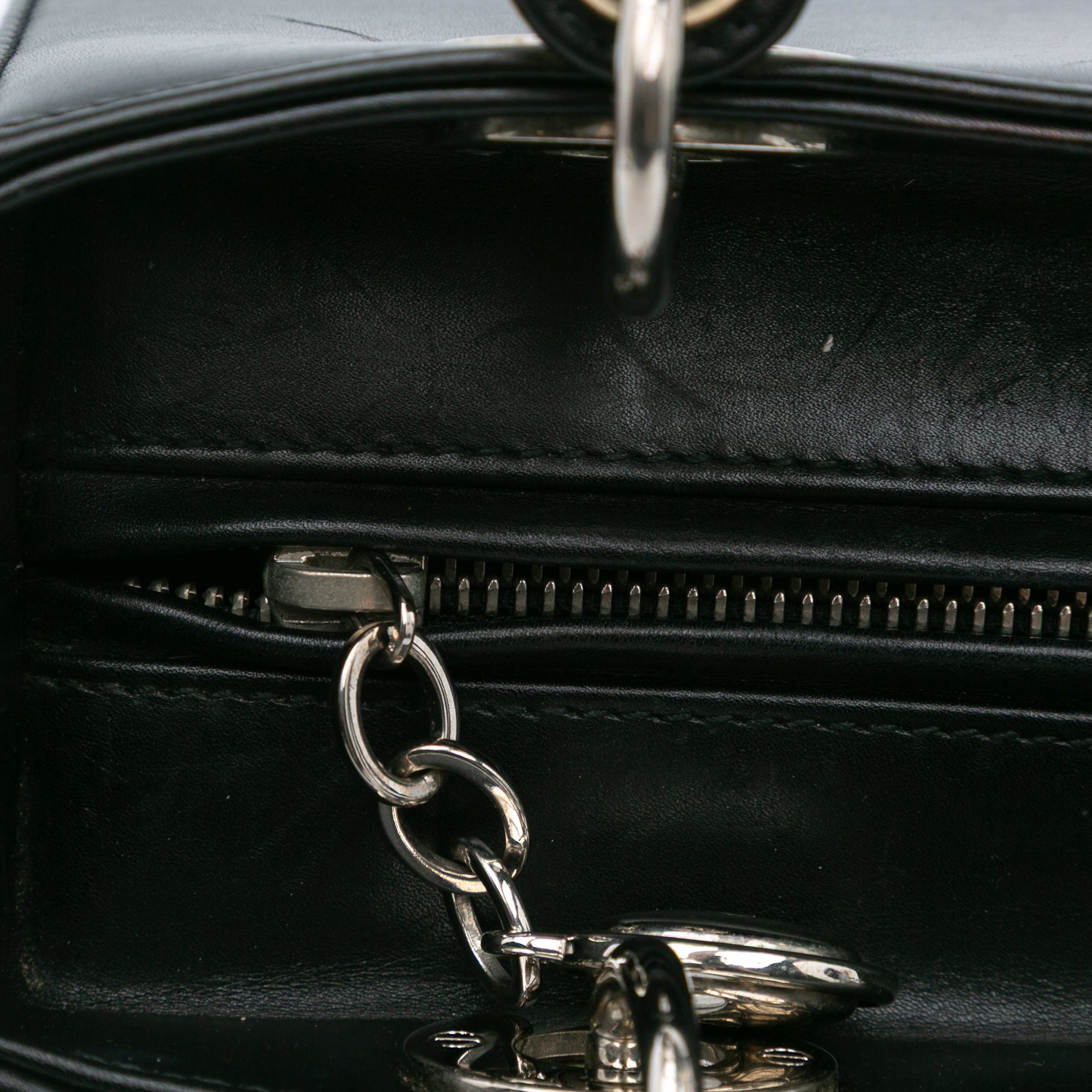 The Lady Dior features a leather body with patch embellishments, flat leather and metal top handles, a detachable flat leather strap, a top zip closure, and an interior zip pocket. Retail Price: 3100.00