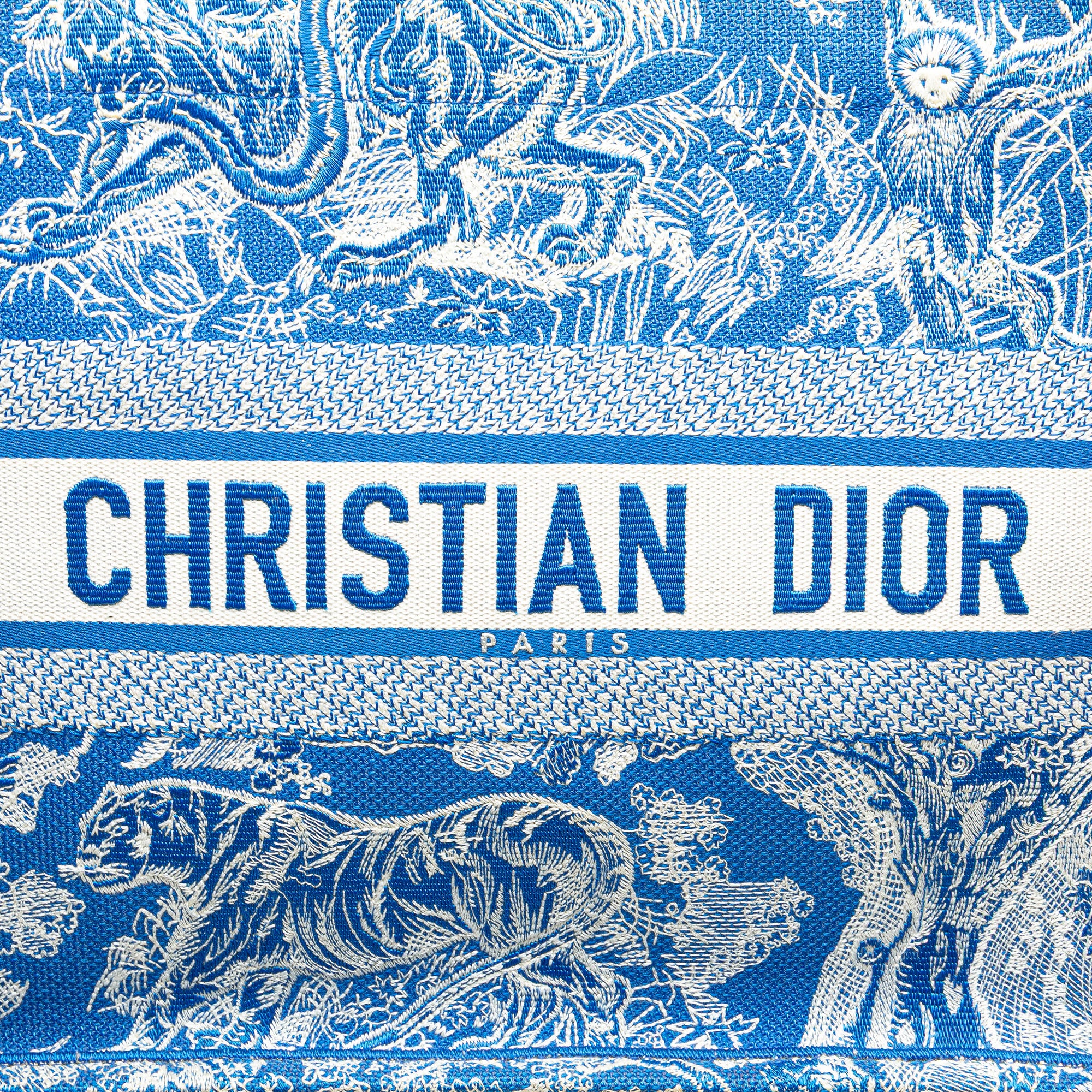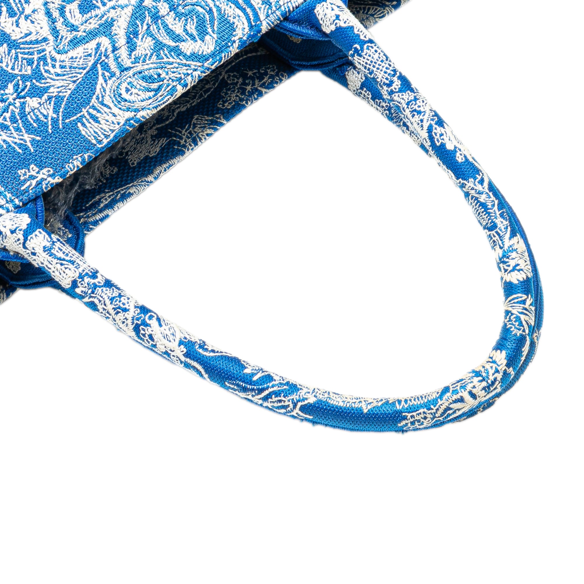 The Dioriviera Toile De Jouy Book Tote features an embroidered canvas body, rolled canvas handles, and an open top. Inclusion: authenticity card. Retail Price: 4200.00