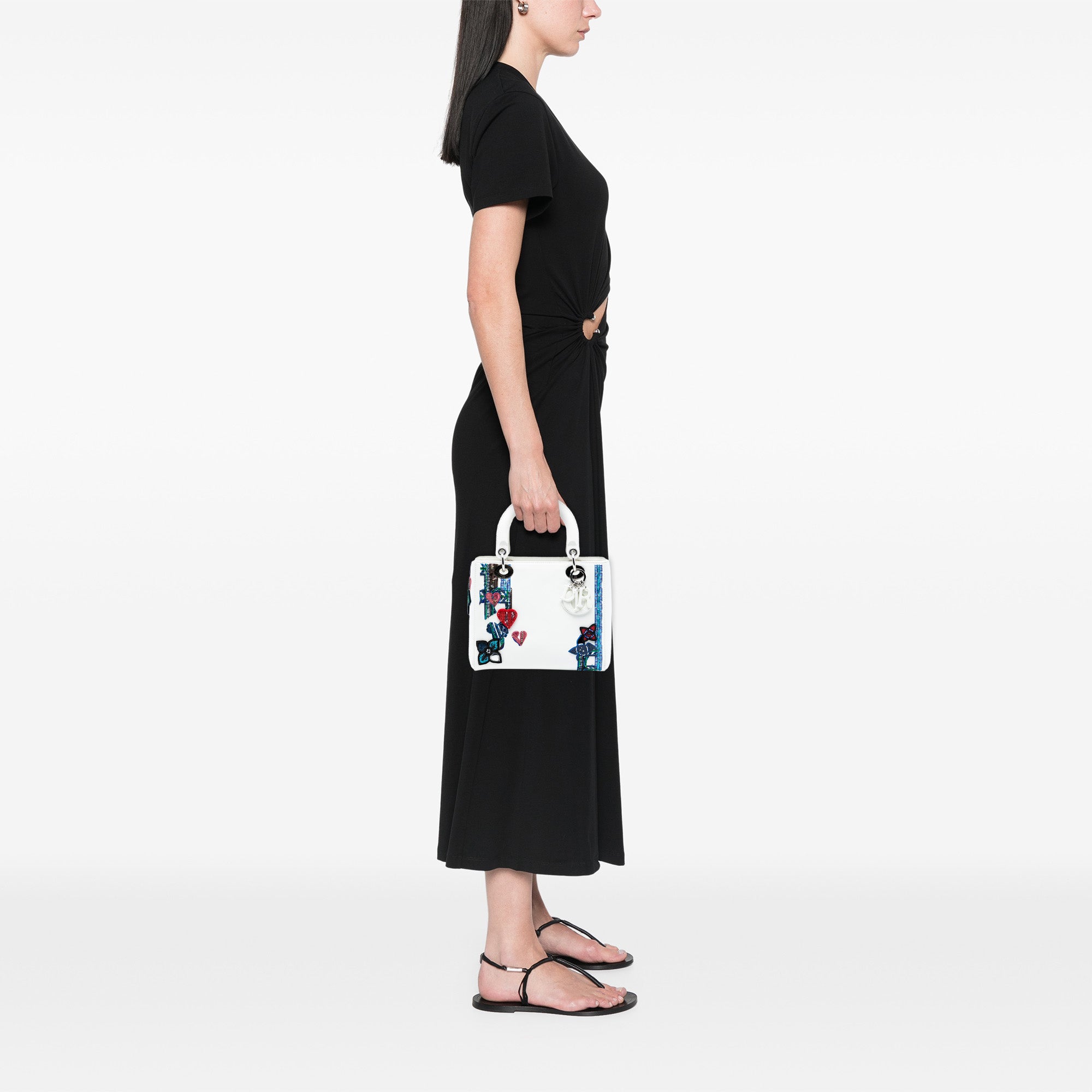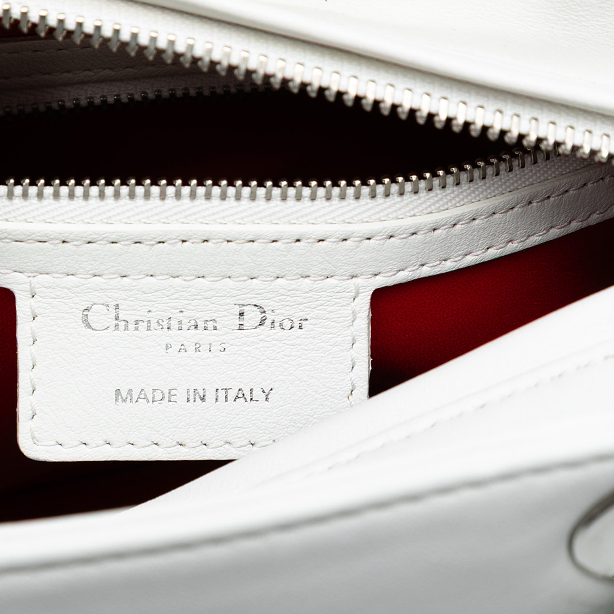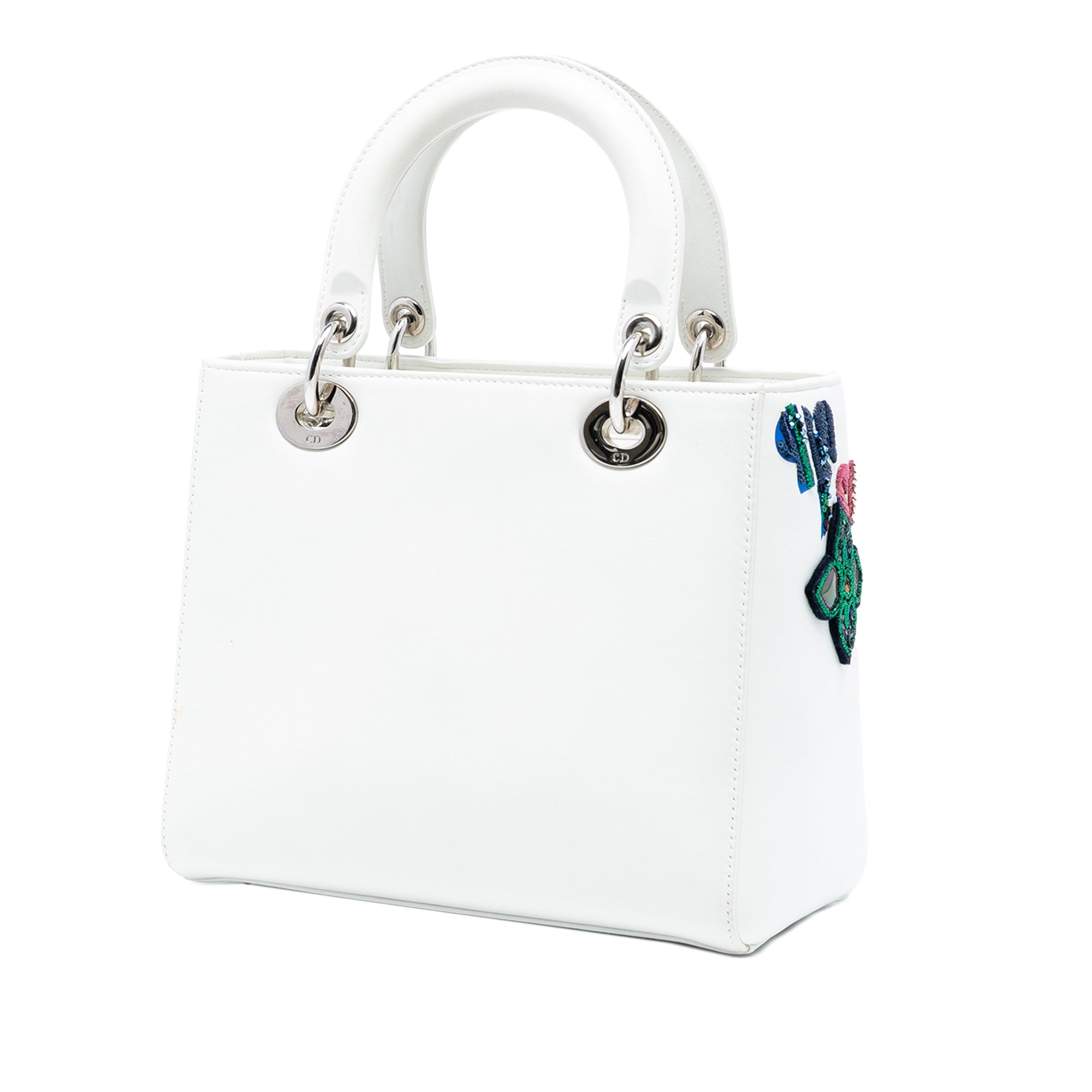 The Lady Dior features a leather body with embroidered details, flat leather top handles, a top zip closure, and an interior zip pocket. Retail Price: 4000.00