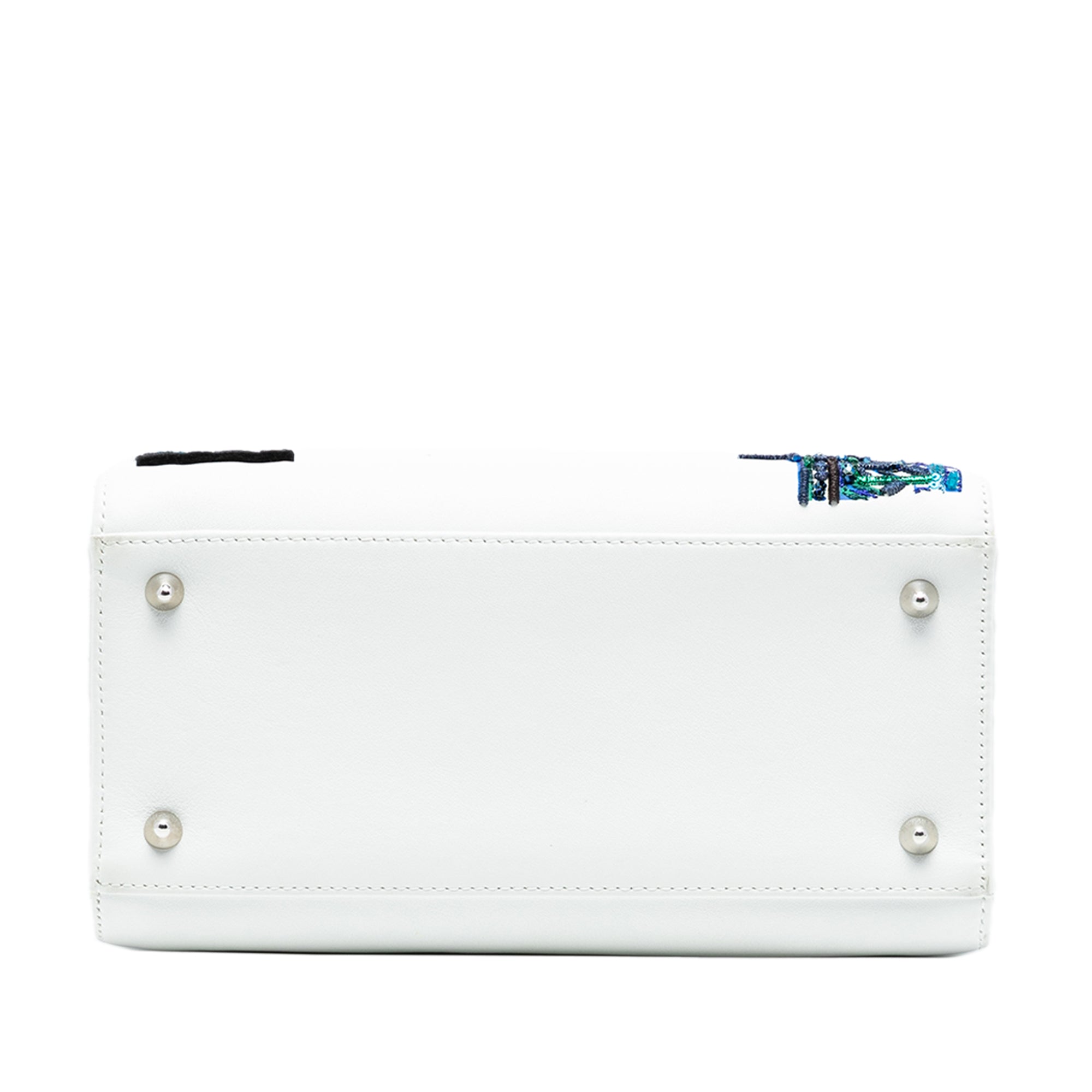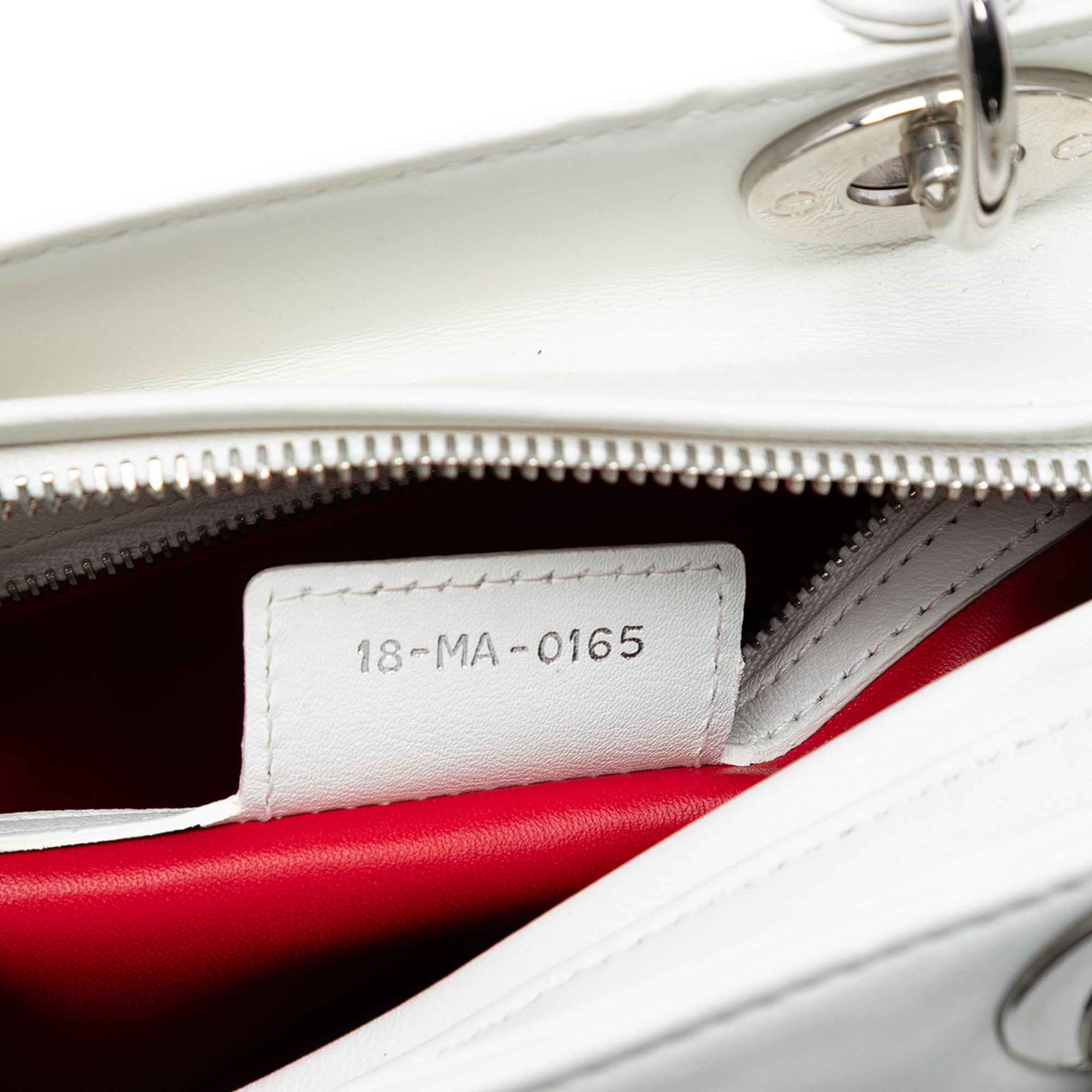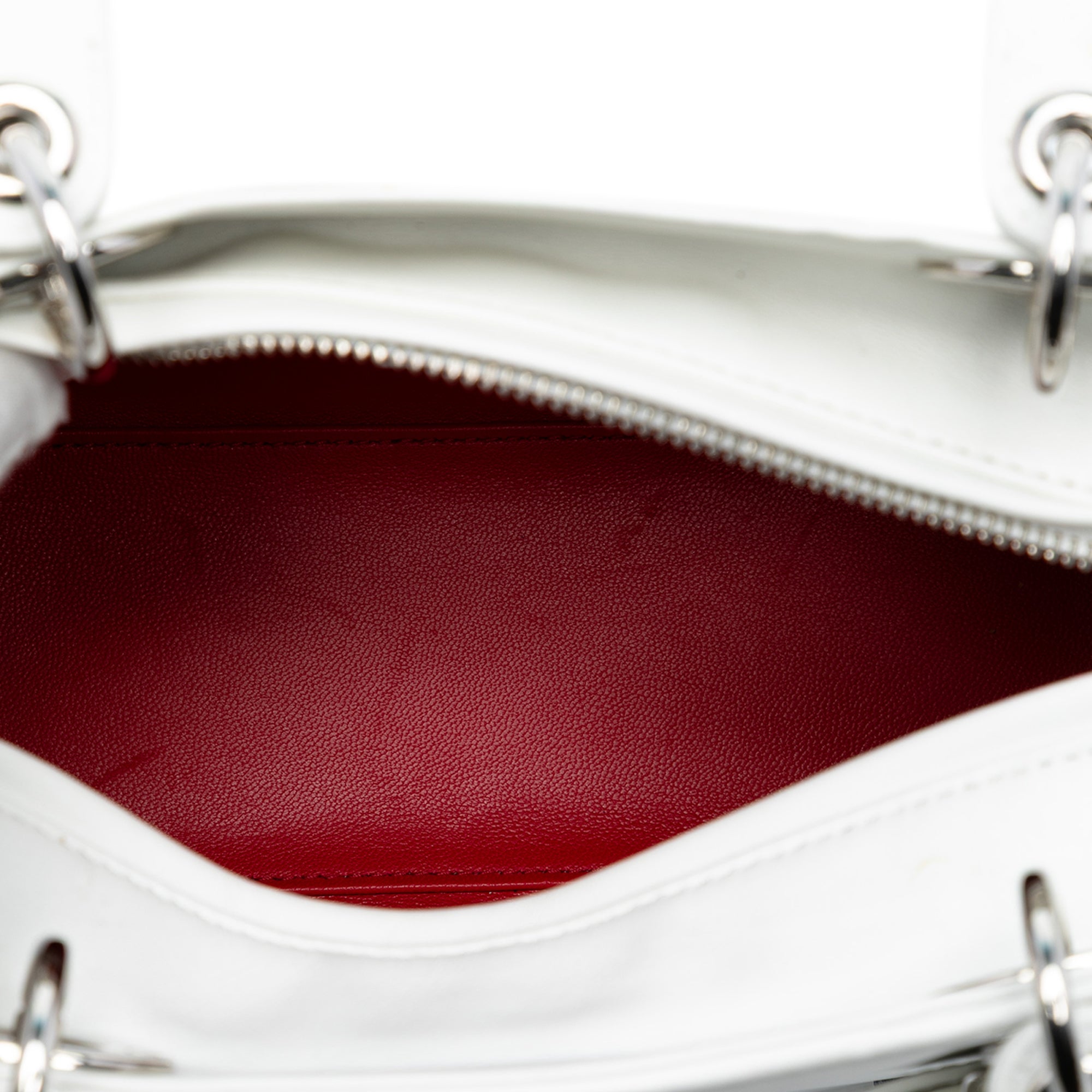 The Lady Dior features a leather body with embroidered details, flat leather top handles, a top zip closure, and an interior zip pocket. Retail Price: 4000.00