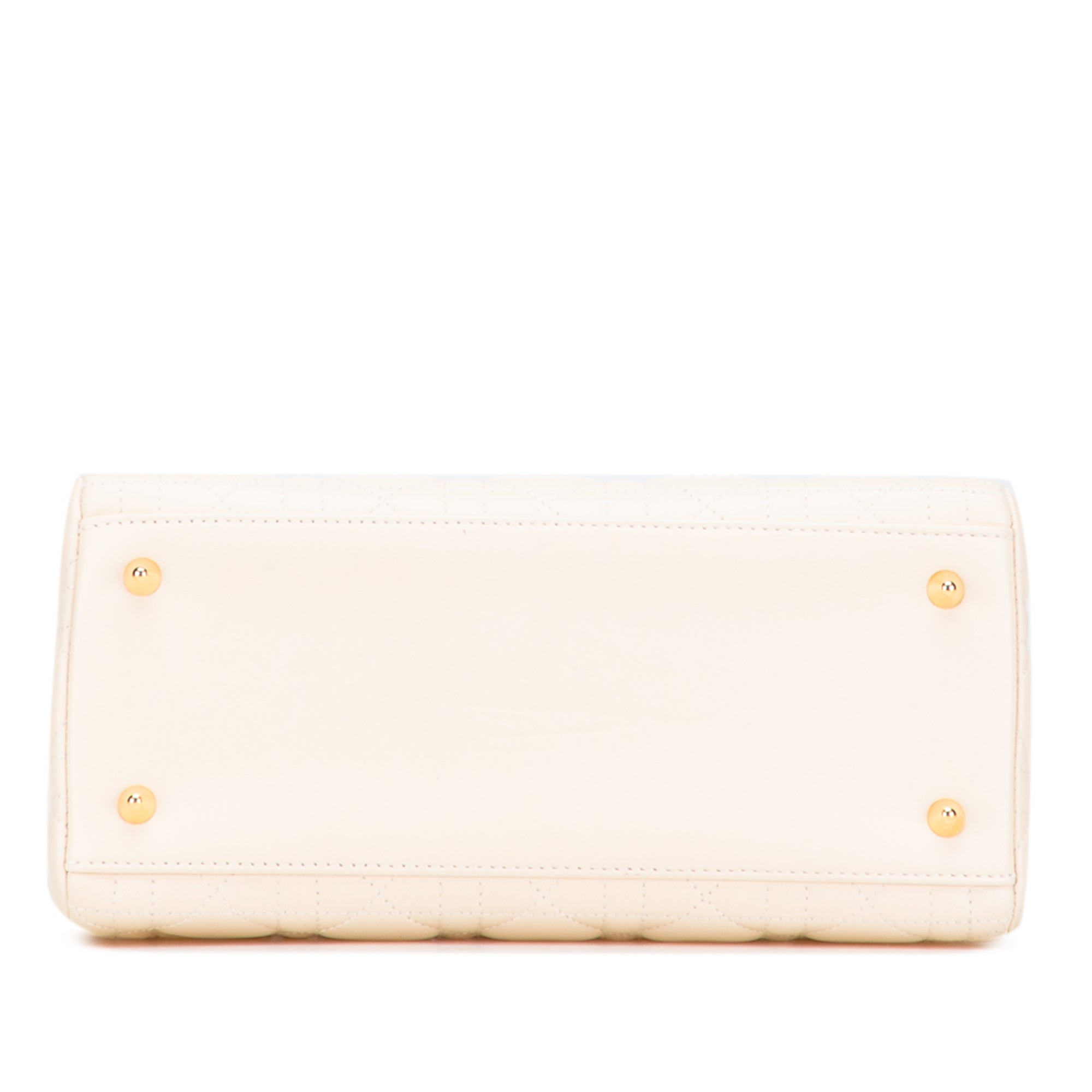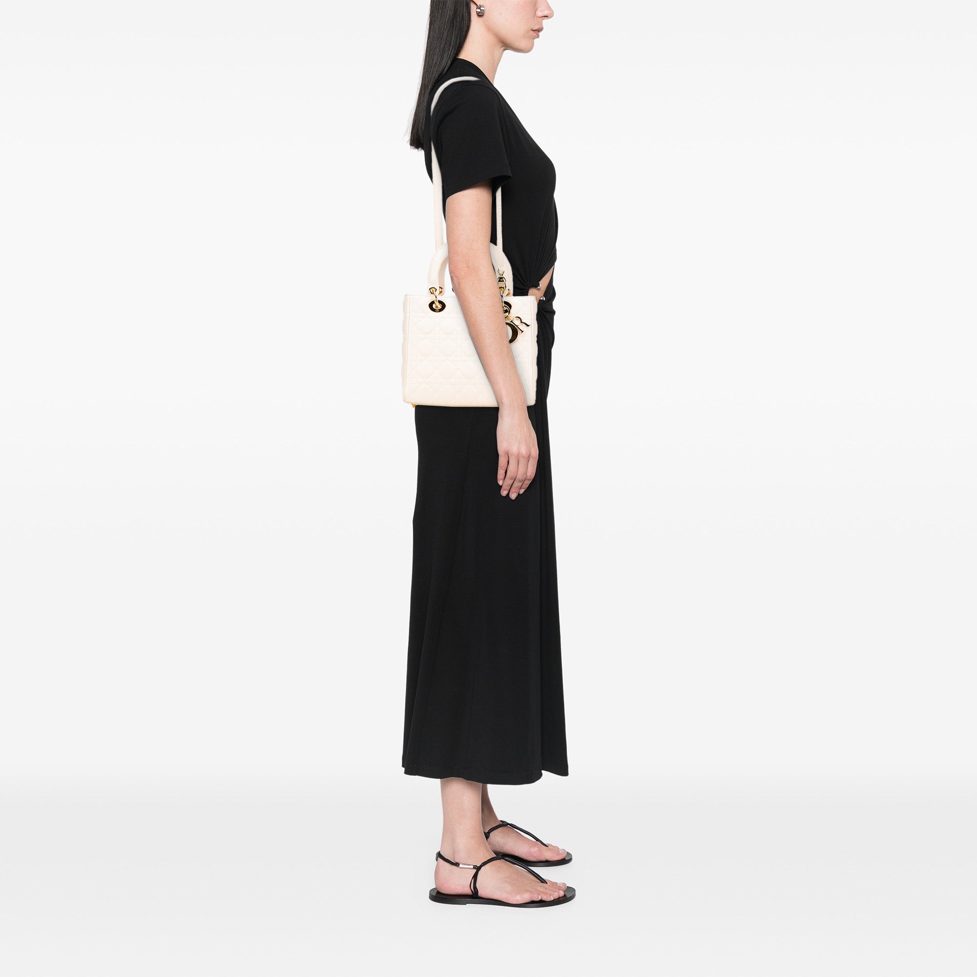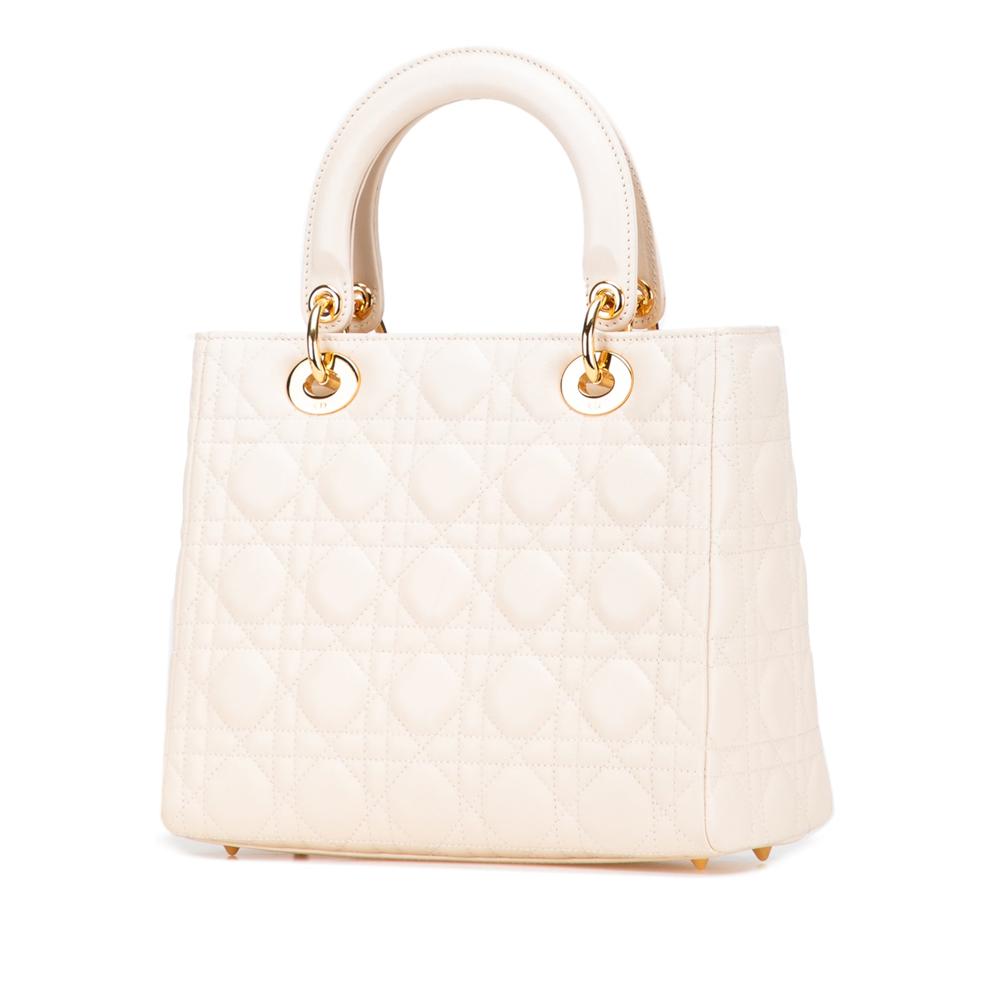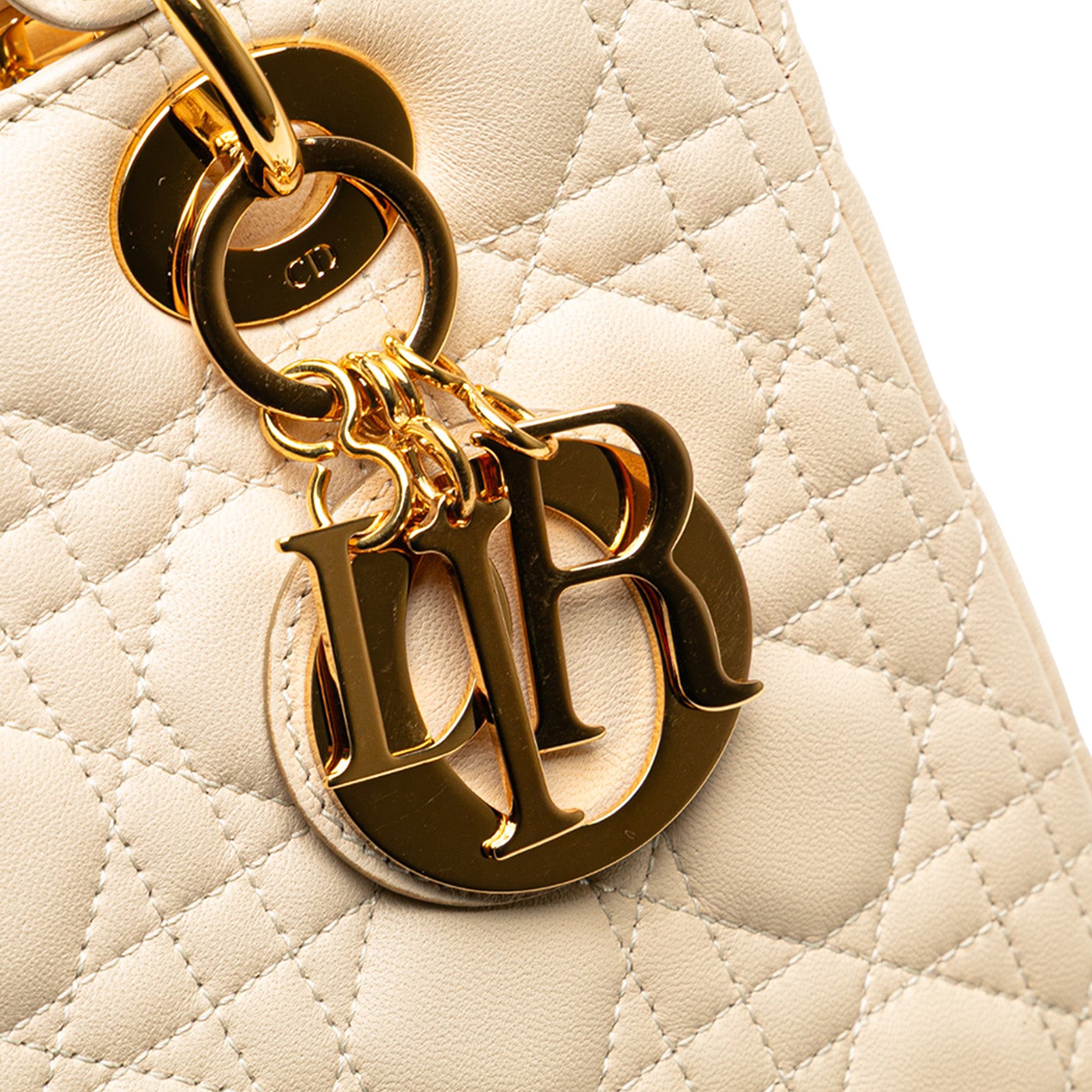 The Lady Dior features a quilted leather body, flat top handles, a detachable flat leather strap, a top zip closure, and an interior zip pocket. Inclusion: Dust bag. Retail Price: 3780.00