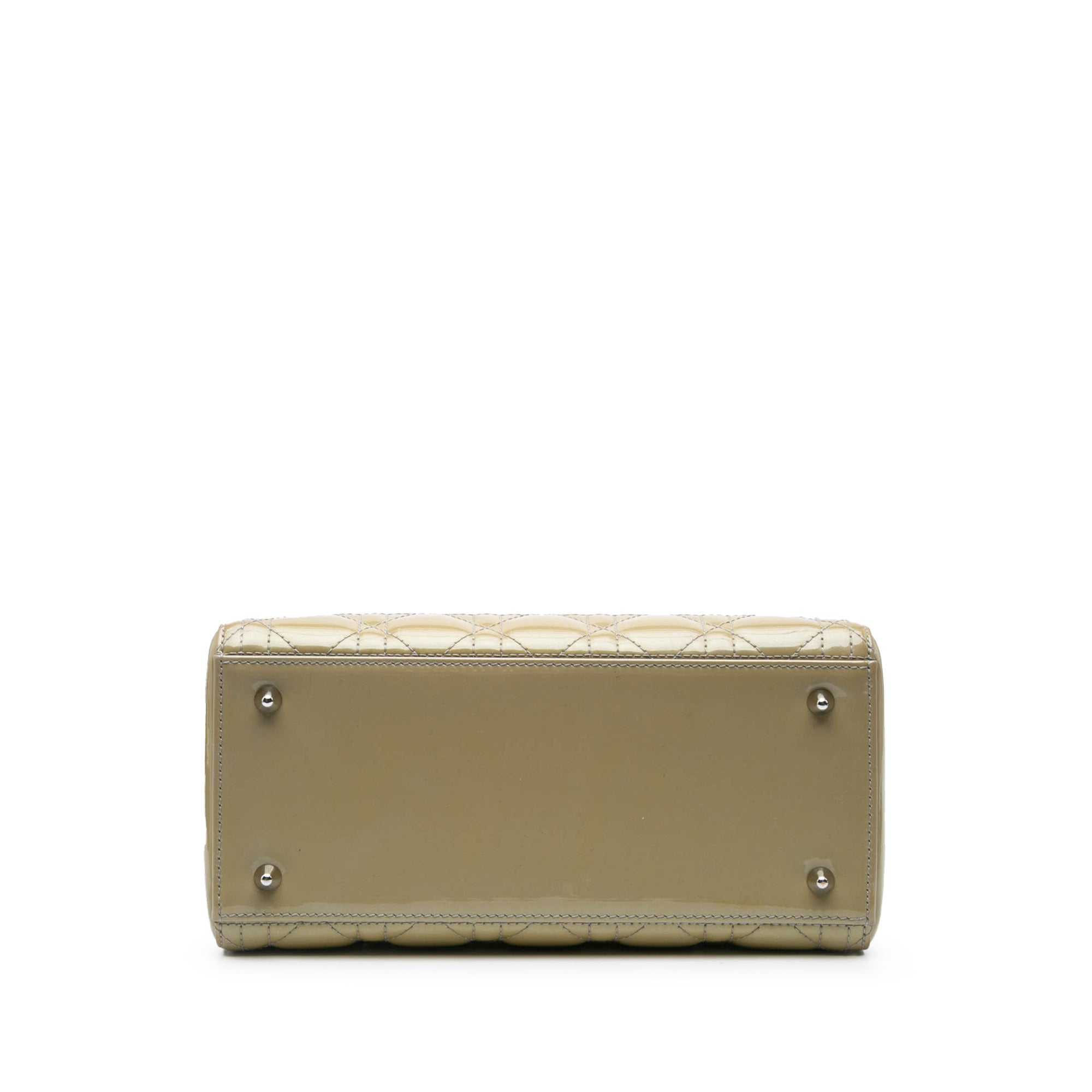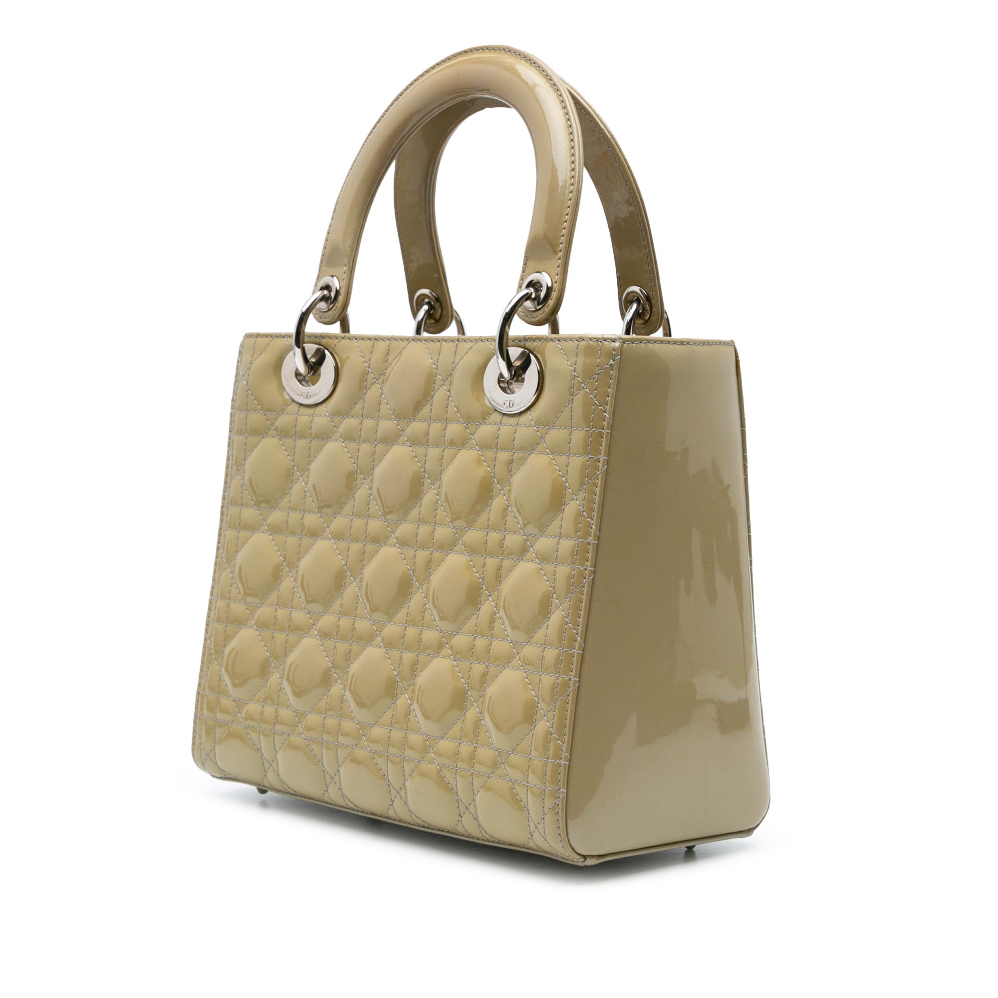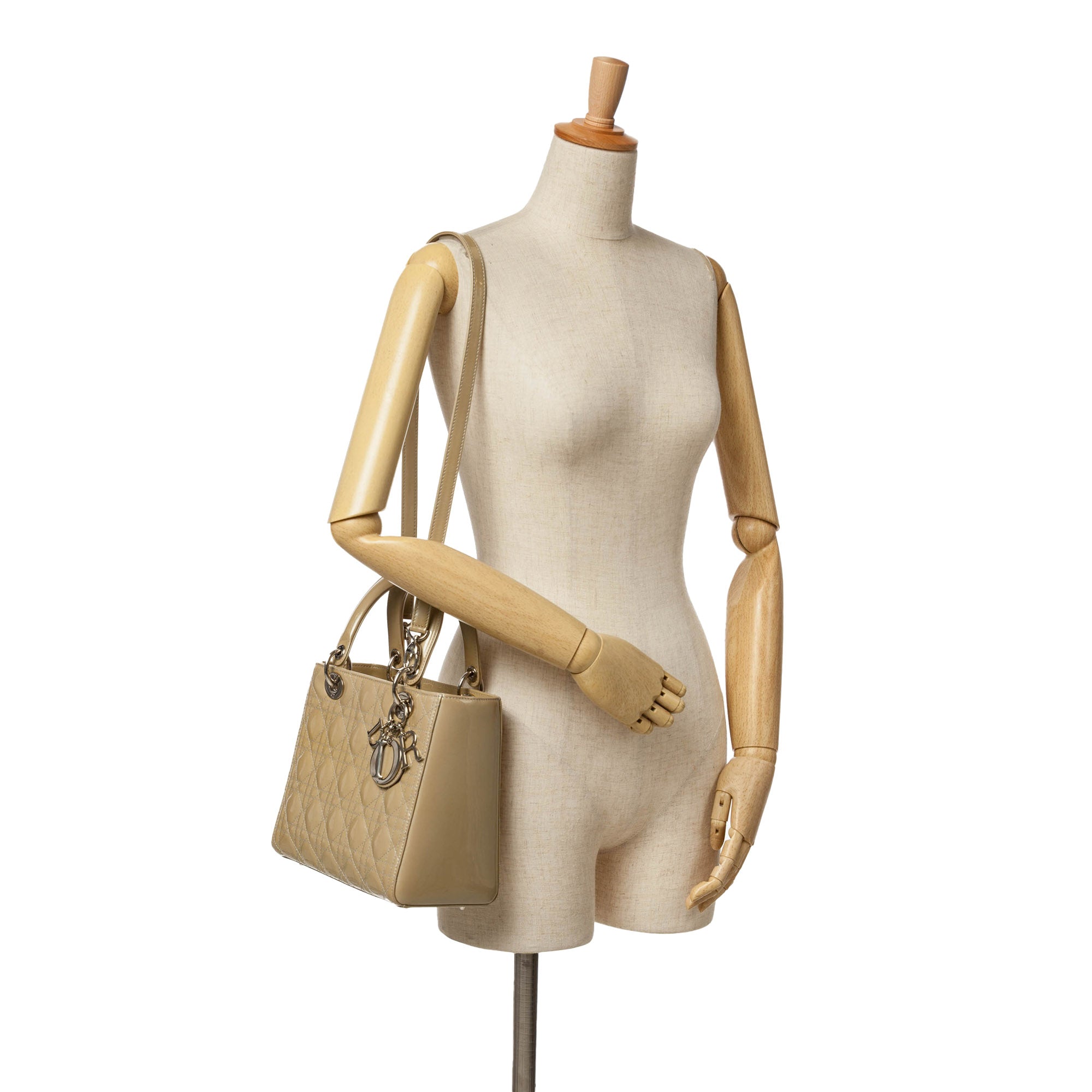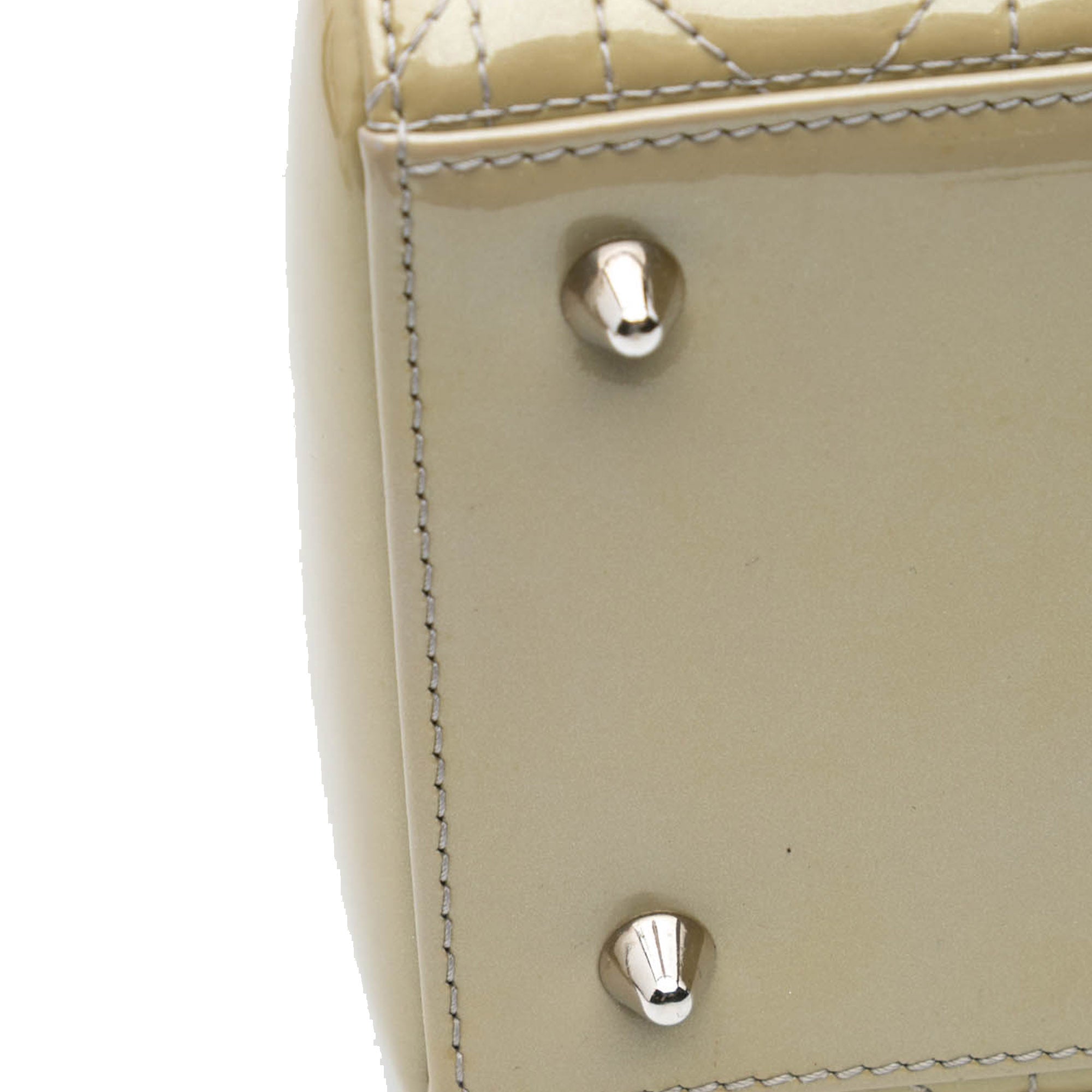 The Lady Dior features a quilted patent leather body, flat leather top handles, a detachable flat leather shoulder strap, a top zip closure, and an interior zip pocket. Retail Price: 5300.00