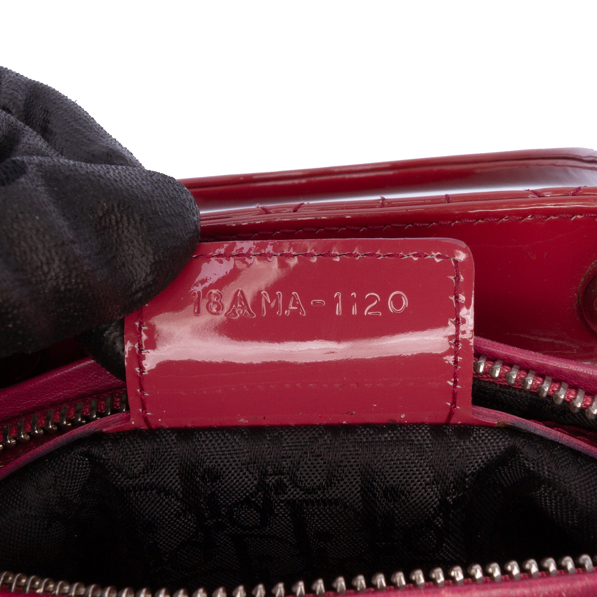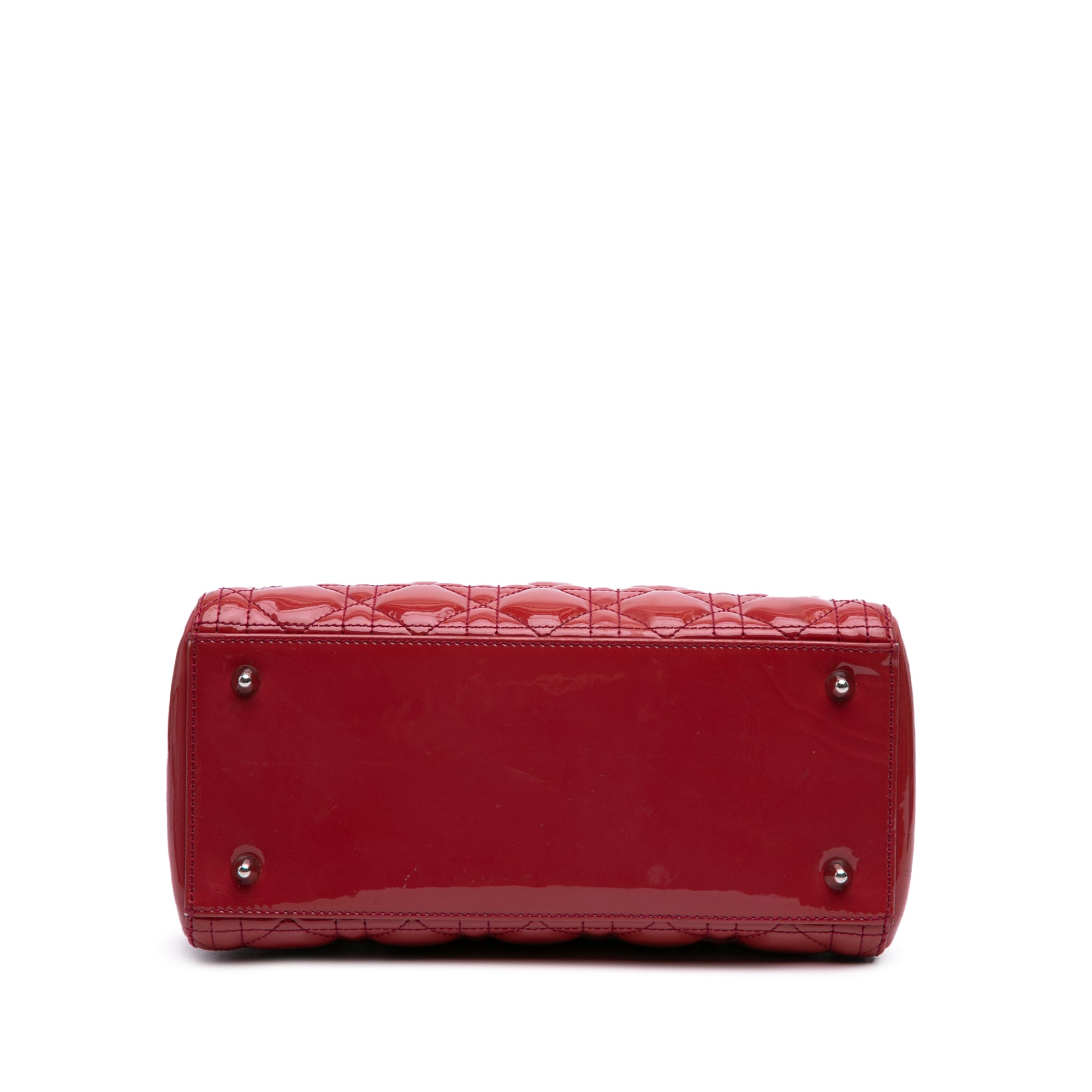 The Lady Dior features a patent leather body, flat leather top handles, a detachable flat leather strap, a top zip closure, and an interior zip pocket. Inclusion: authenticity card. Retail Price: 5500.00