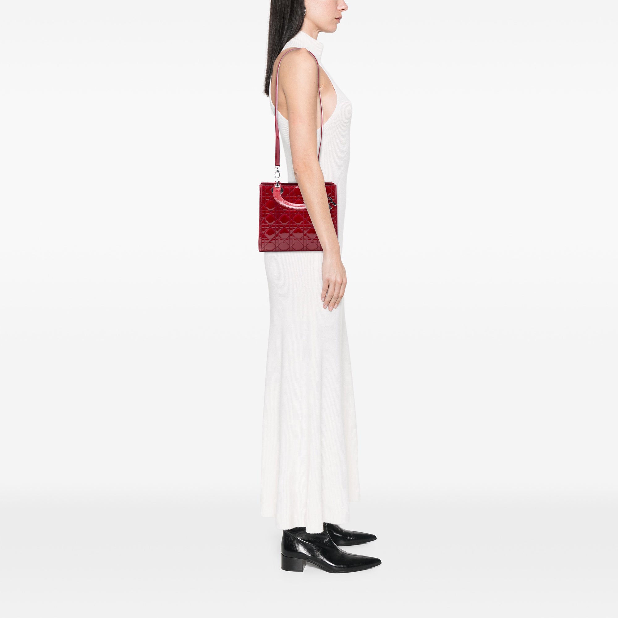 The Lady Dior features a quilted patent leather body, flat leather top handles, a detachable flat leather strap, a top zip closure, and an interior zip pocket. Inclusion: Dust bag, authenticity card. Retail Price: 5360.00