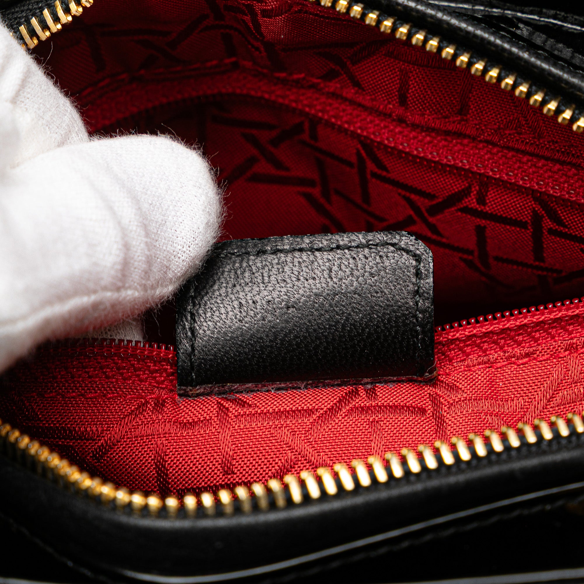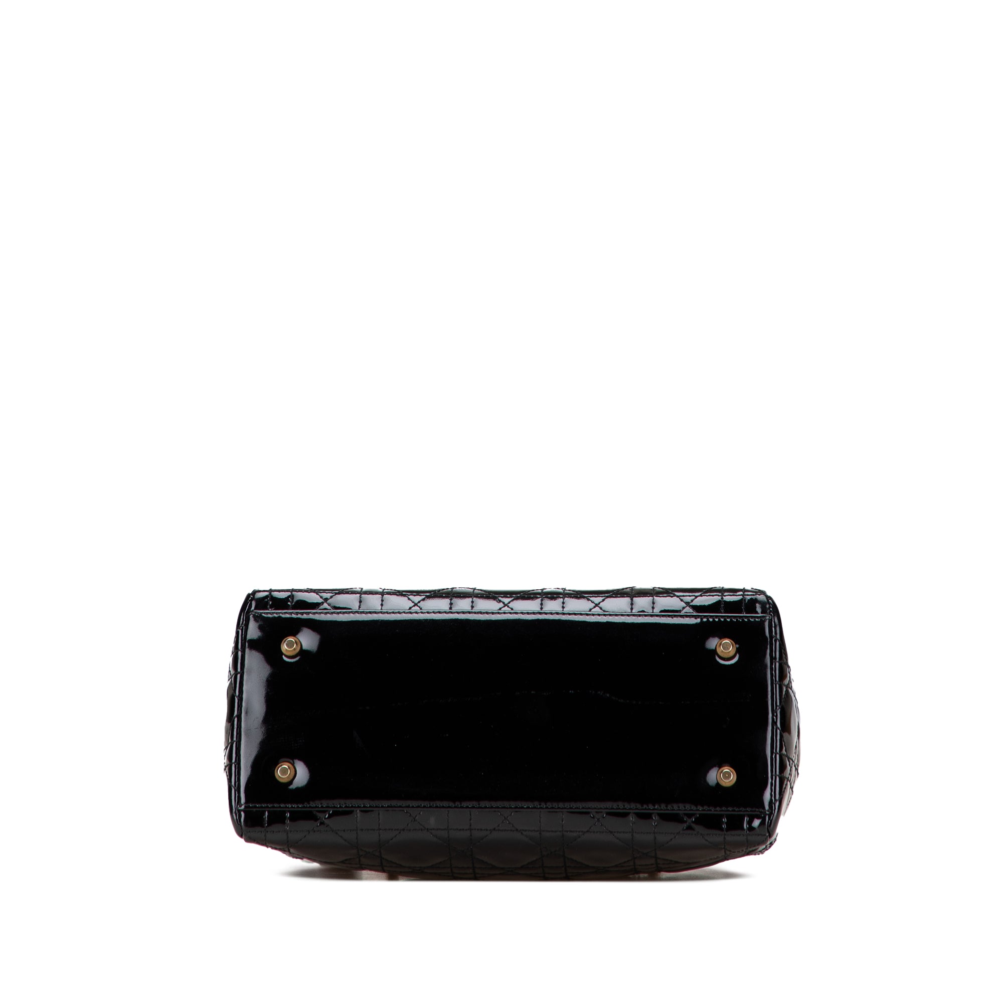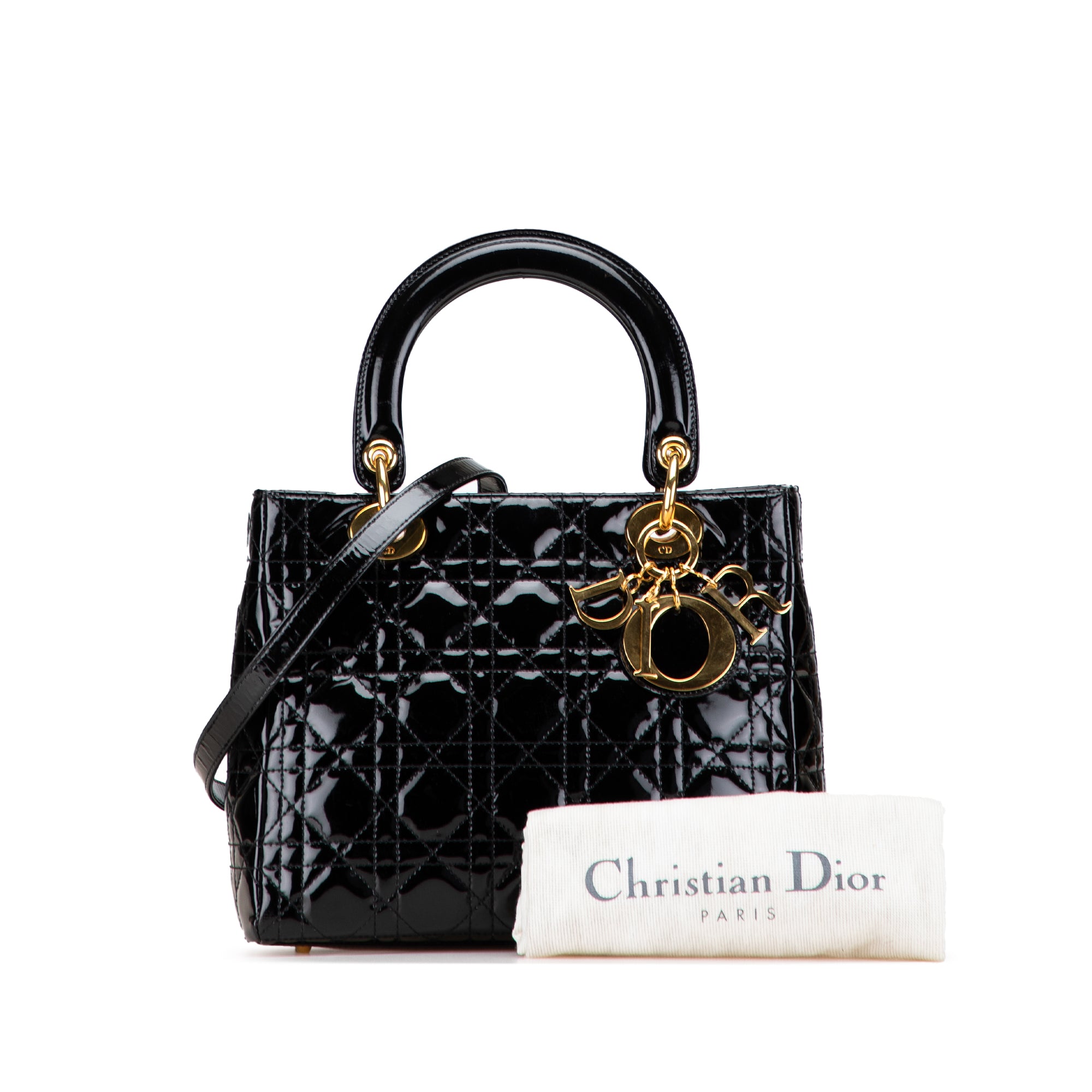 The Lady Dior features a quilted patent leather body, flat leather top handles, a detachable flat leather strap, a top zip closure, and an interior zip pocket. Inclusion: Dust bag. Retail Price: 6100.00