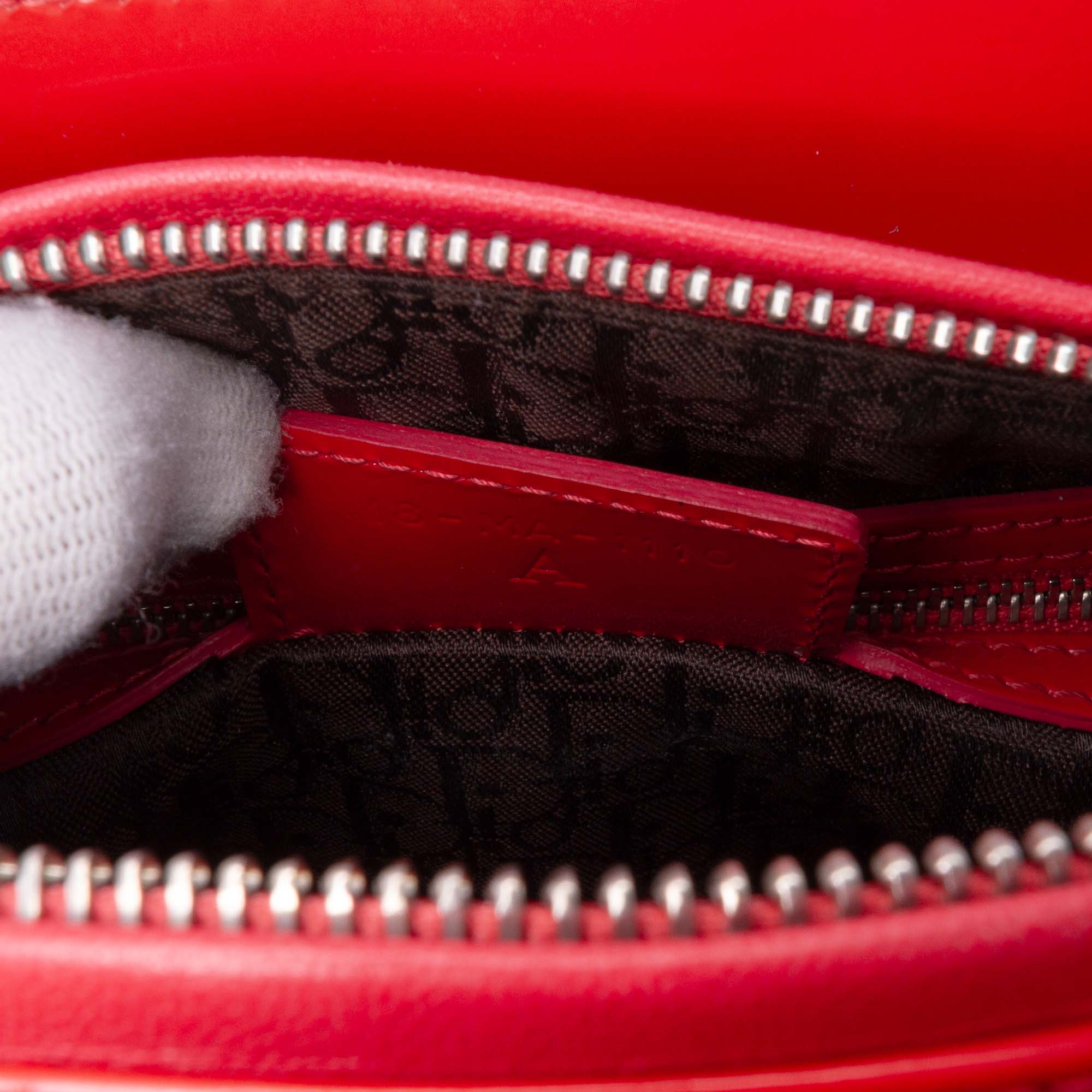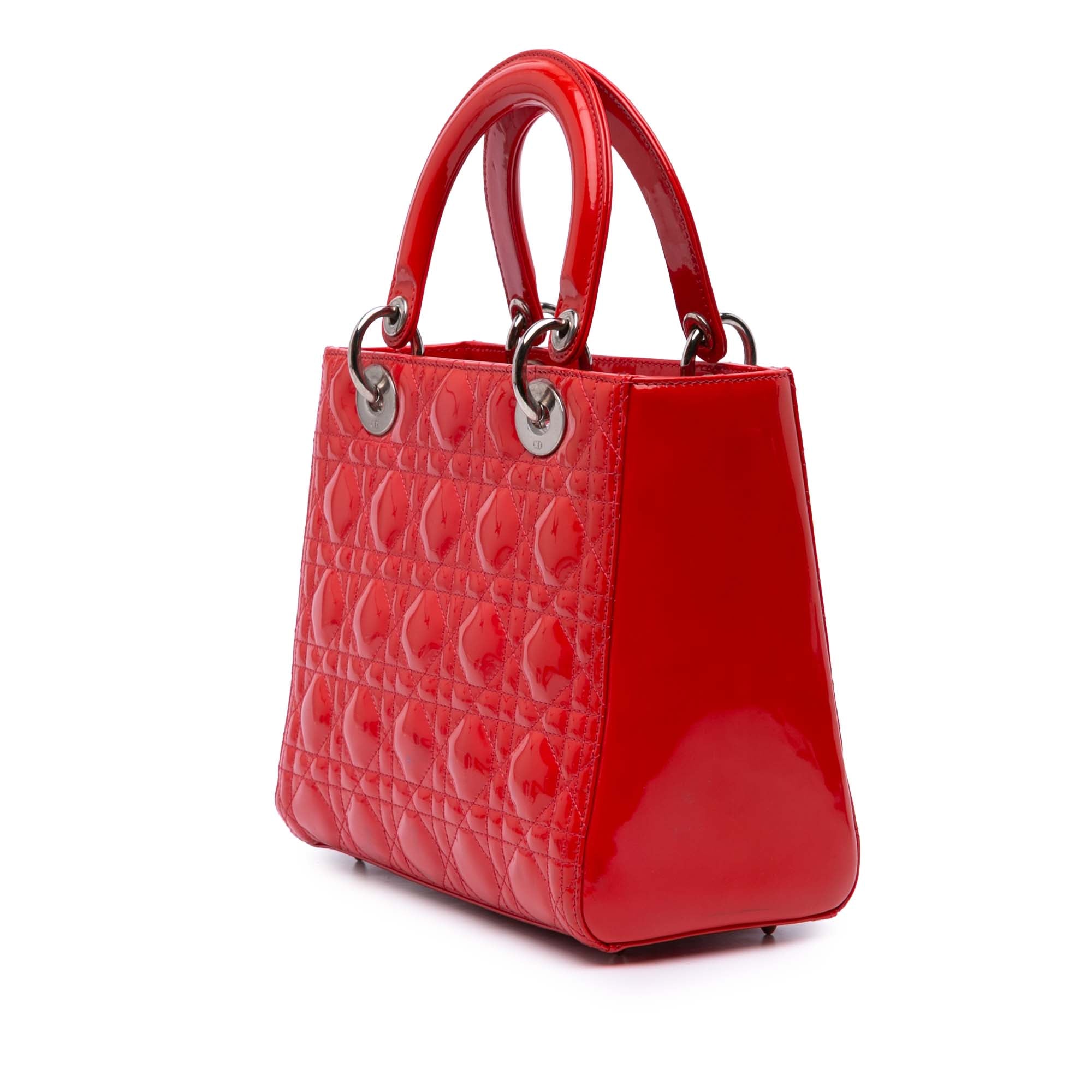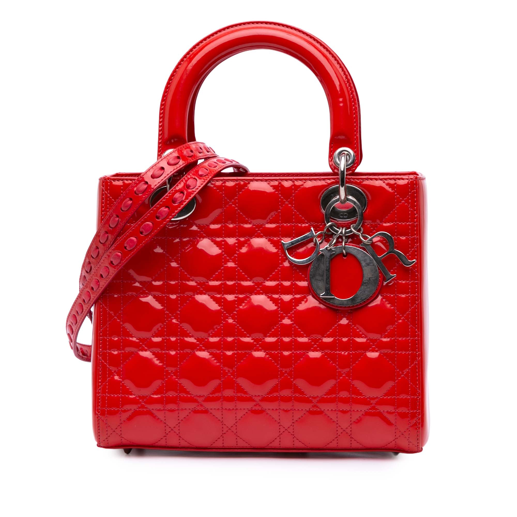 The Lady Dior features a quilted patent leather body, flat leather top handles, a detachable flat leather strap, a top zip closure, and an interior zip pocket. Retail Price: 5313.00
