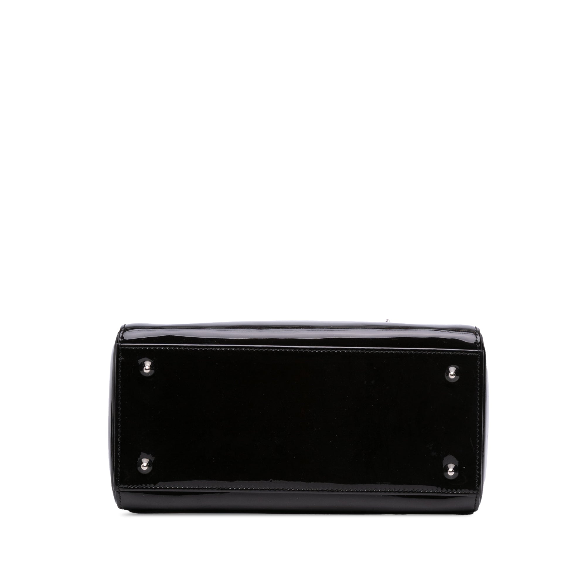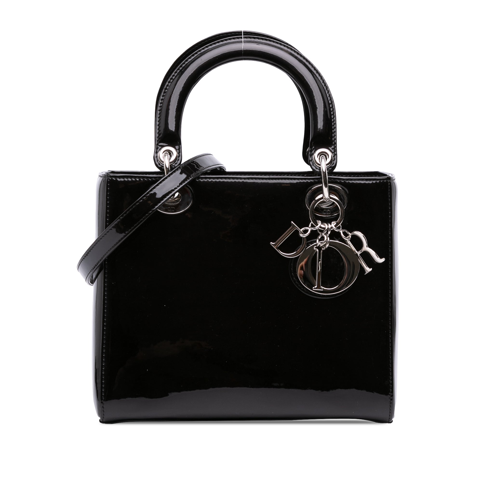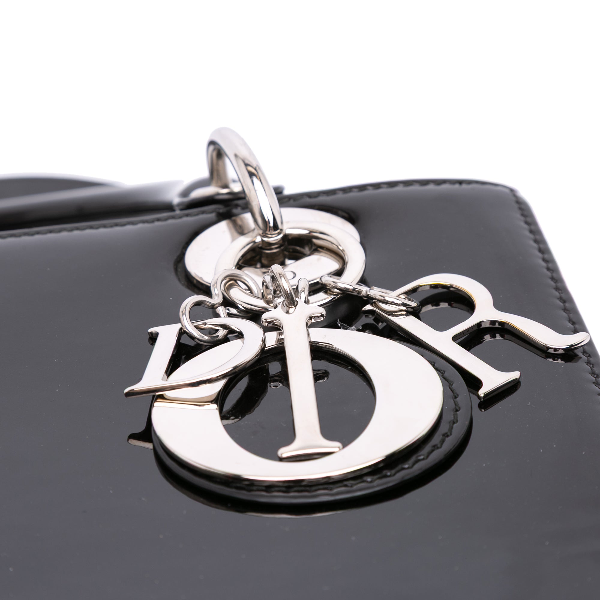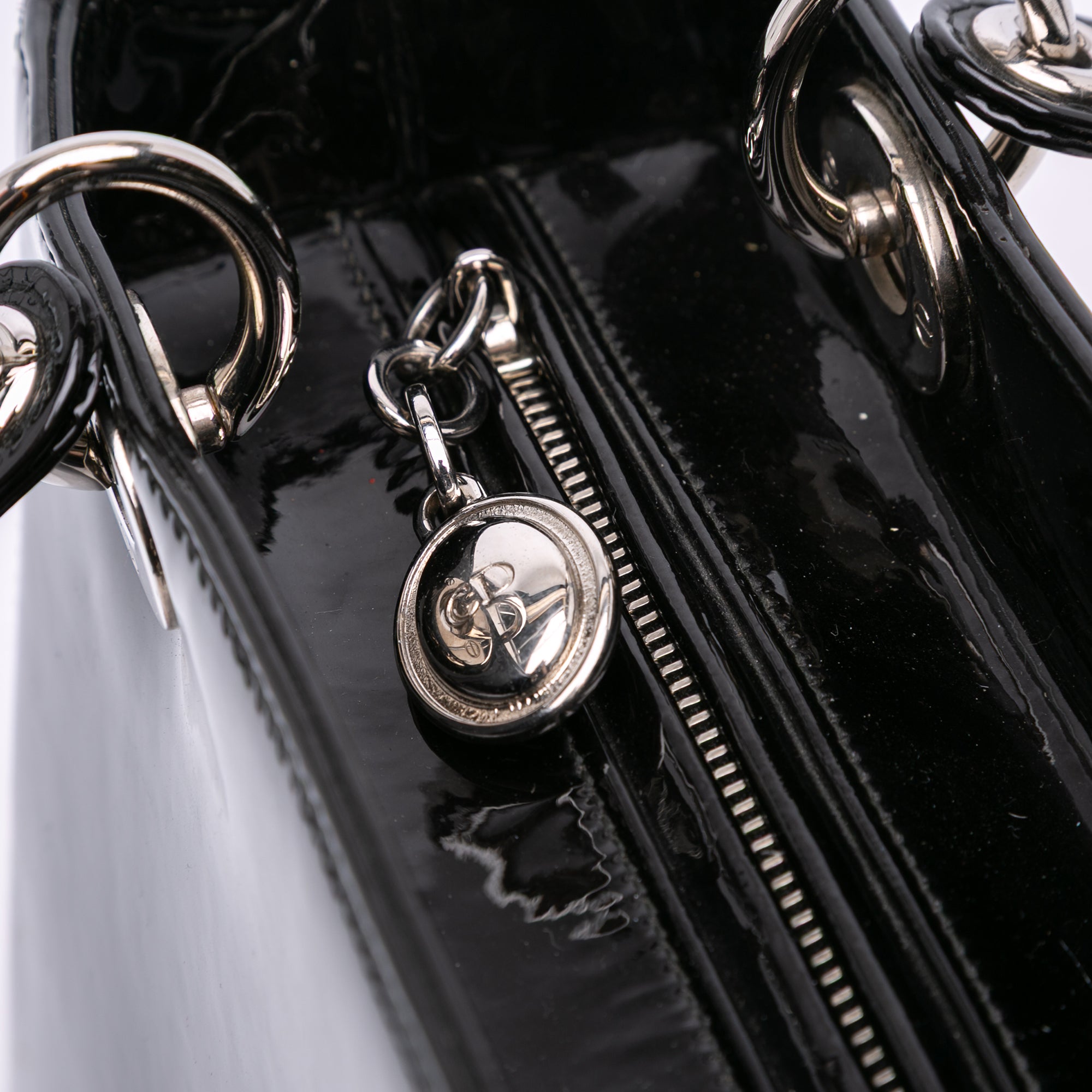 The Lady Dior features a patent leather body, flat leather top handles, a detachable flat leather shoulder strap, a top zip closure, and an interior zip pocket. Retail Price: 6100.00