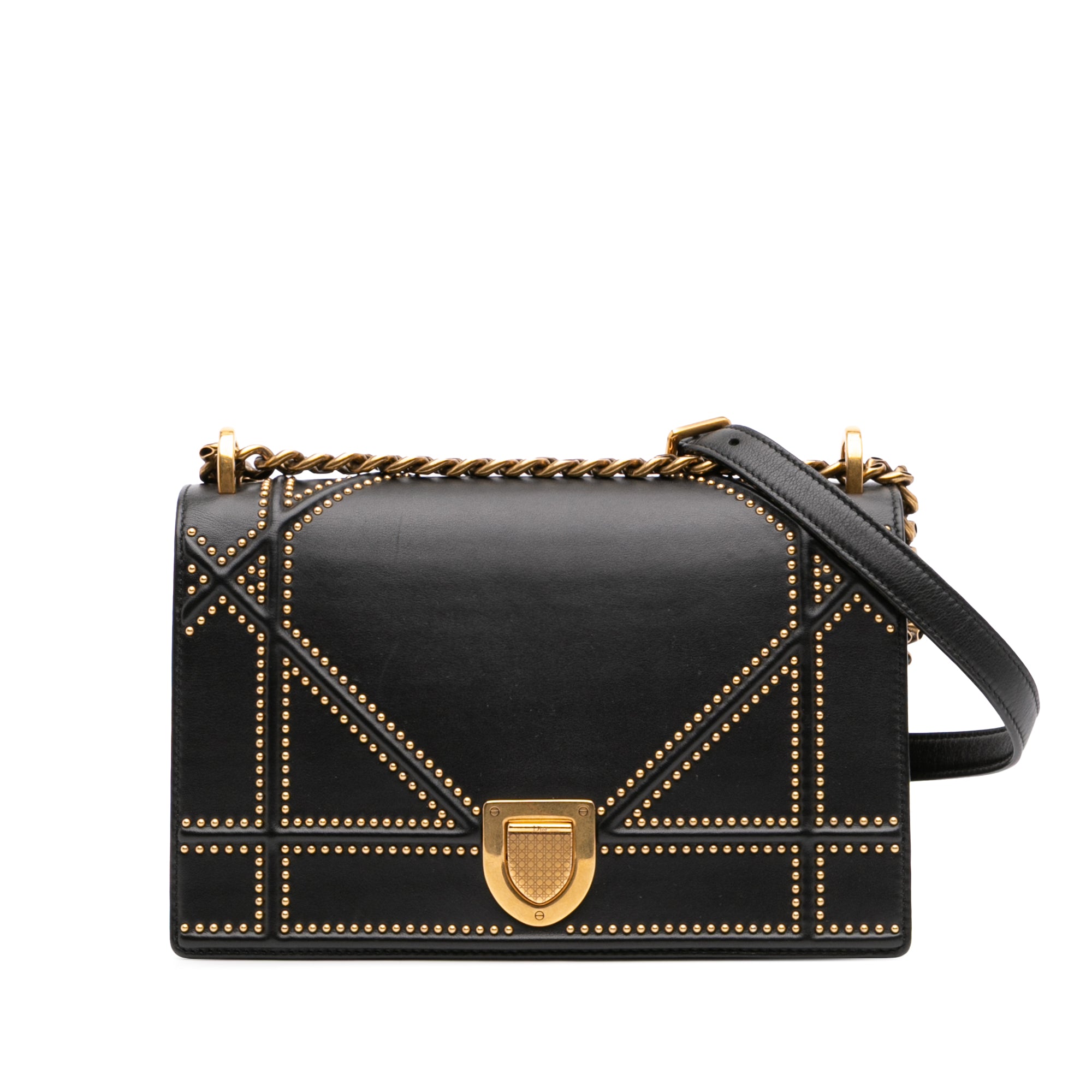 The Medium Diorama Flap bag features a studded leather body, a chain and leather shoulder strap, a front flap with a push lock closure, and interior zip and slip pockets. Inclusion: Dust bag, authenticity card. Retail Price: 3600.00