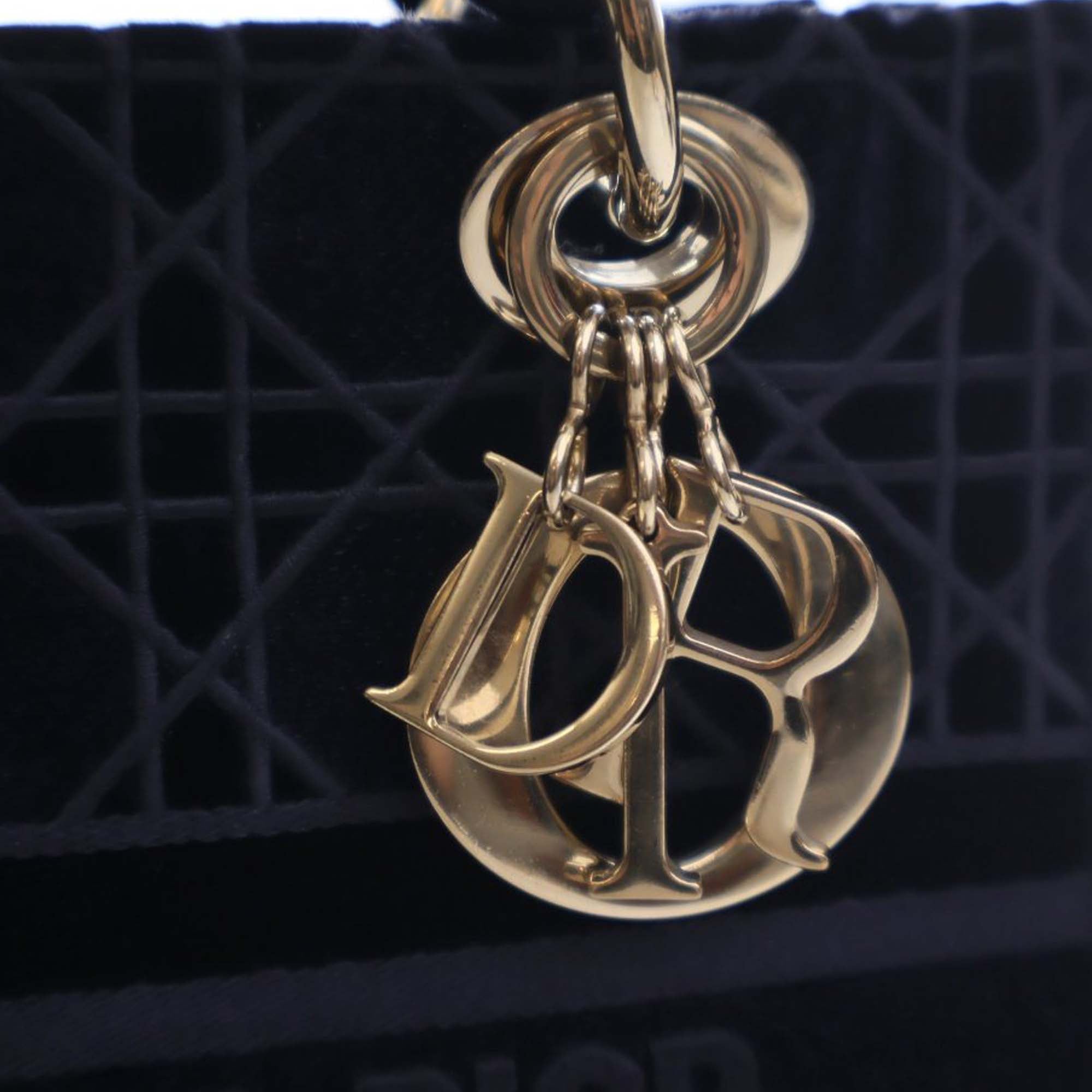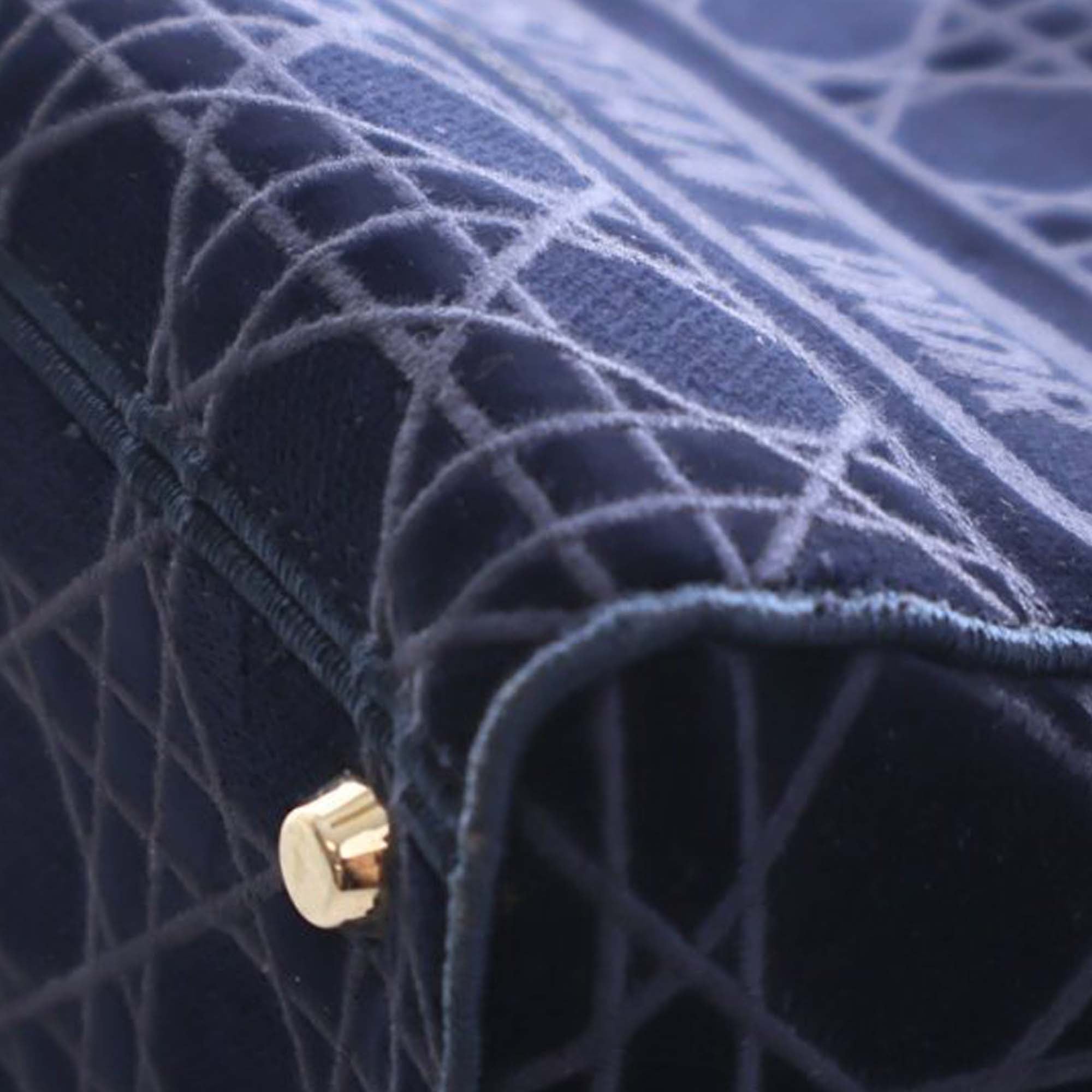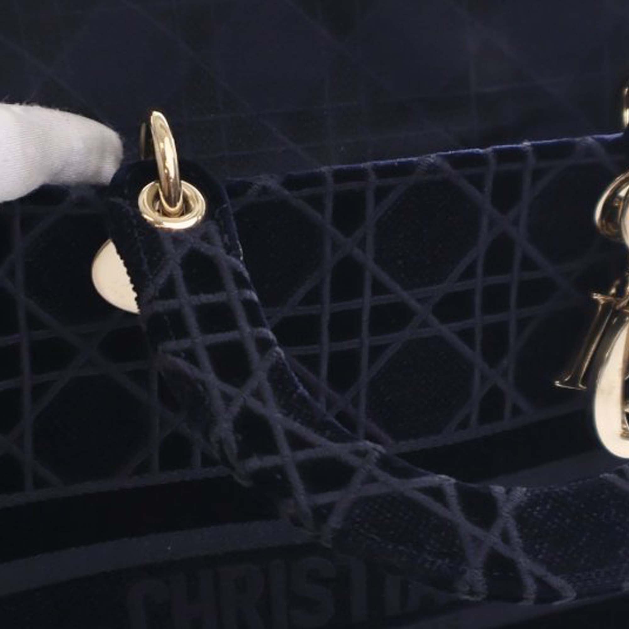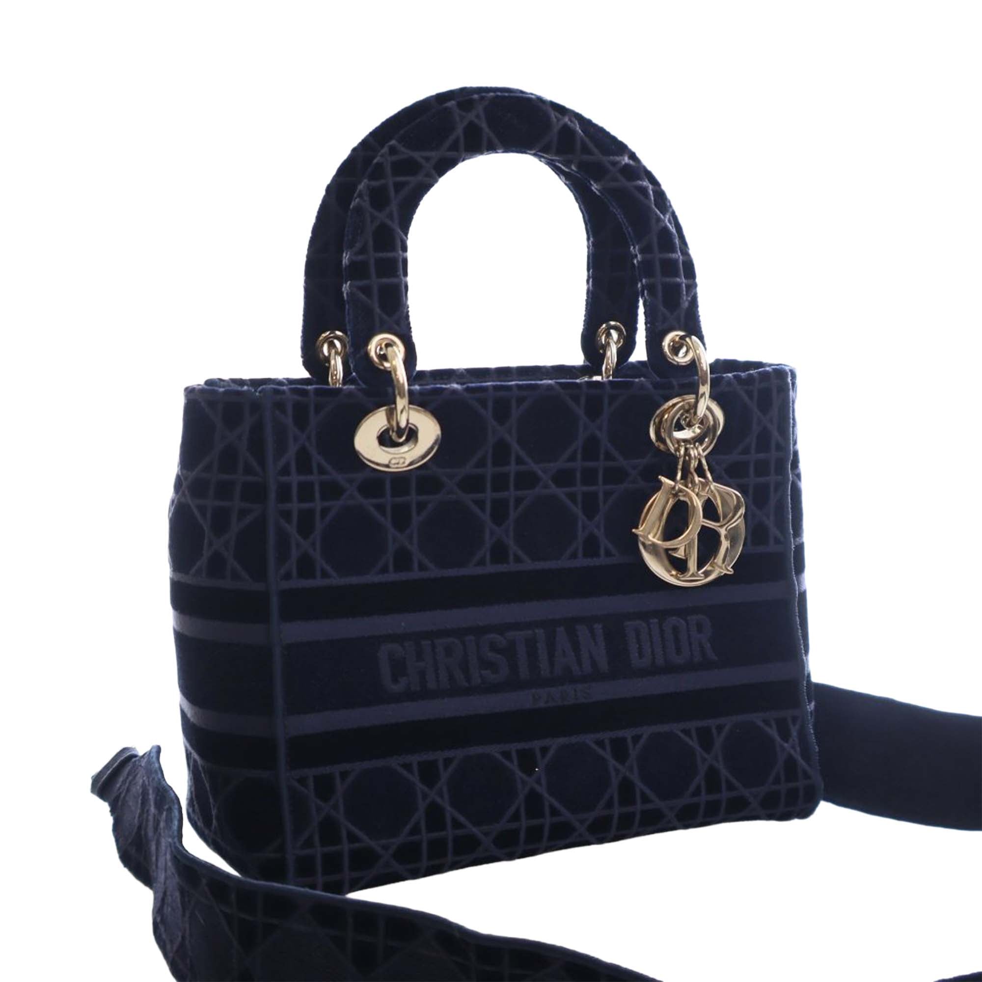 The Lady D-Lite features an embroidered velvet body, flat handles, a detachable strap, a top flap, and interior zip and slip pockets. Retail Price: 4500.00