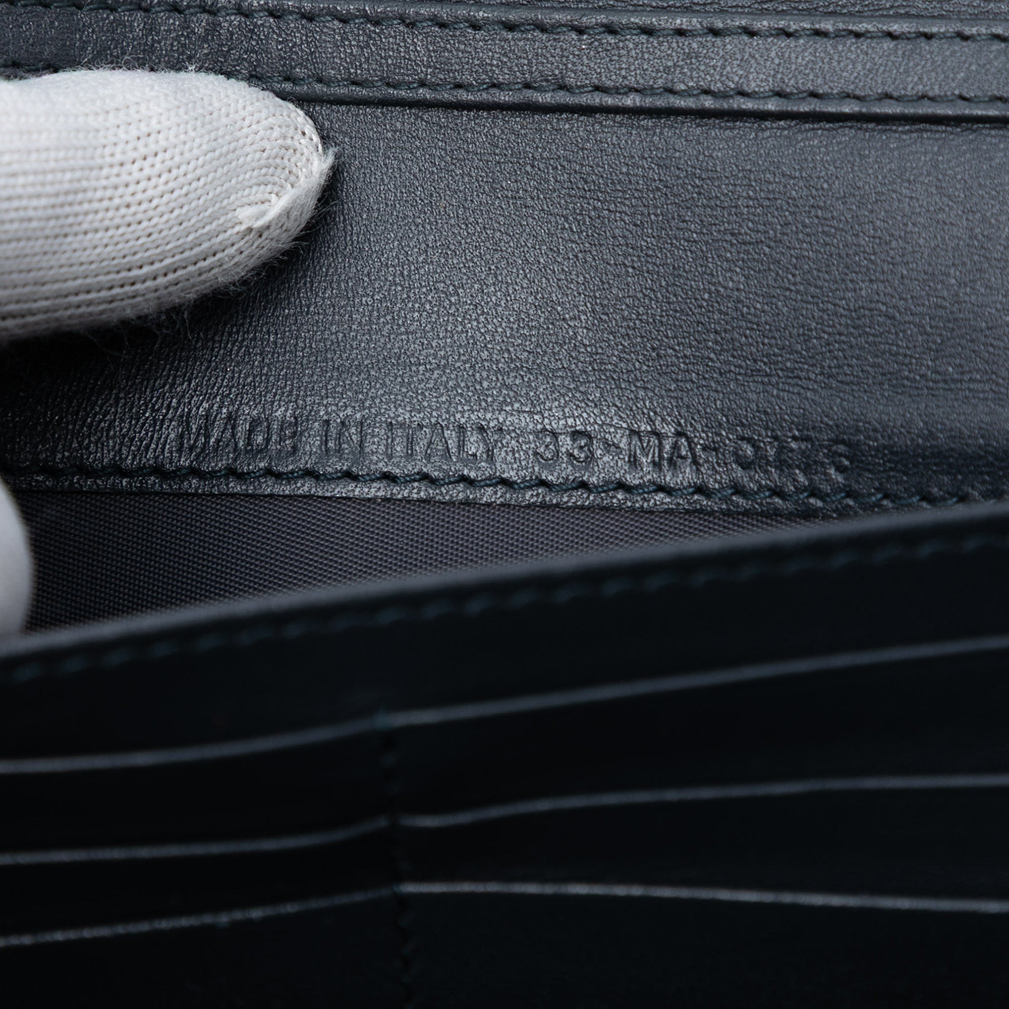 This wallet on chain features a patent leather body, a removable chain shoulder strap, a front flap with snap button closure, and interior zip and slip pockets. Retail Price: 2400.00
