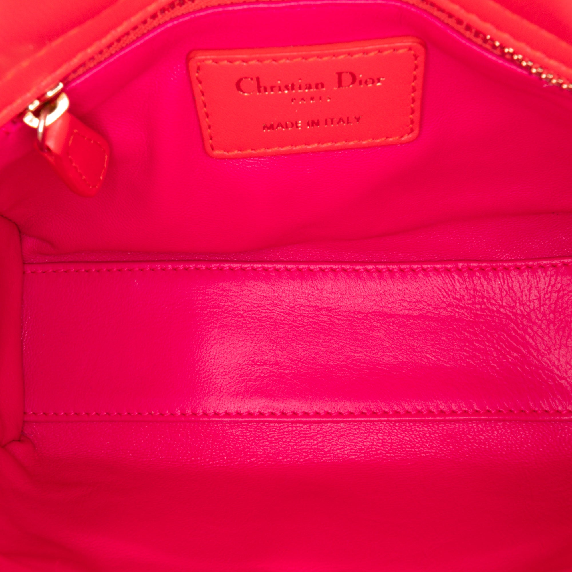 The Mini Lady Dior features a quilted lambskin leather body, flat leather top handles, a detachable flat leather shoulder strap, a fold-in flap closure, and an interior zip pocket. Retail Price: 4300.00