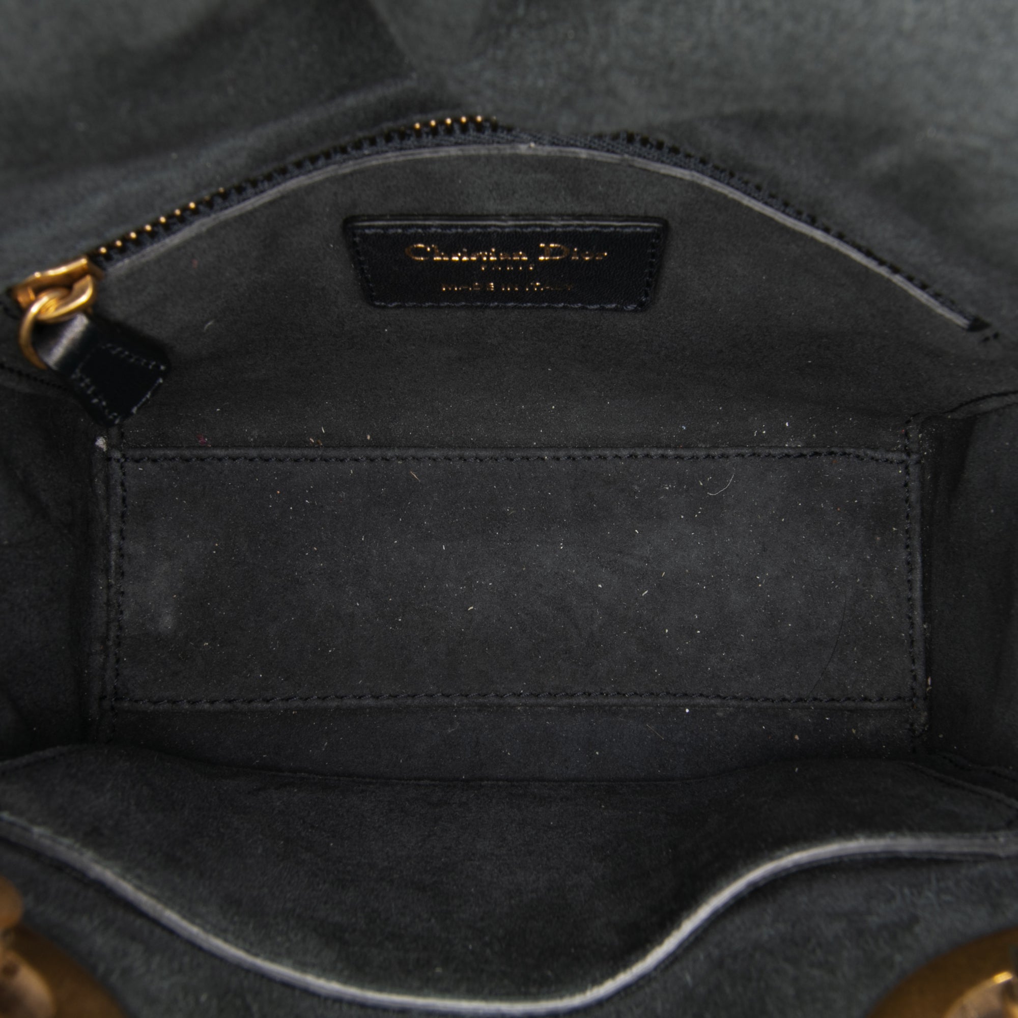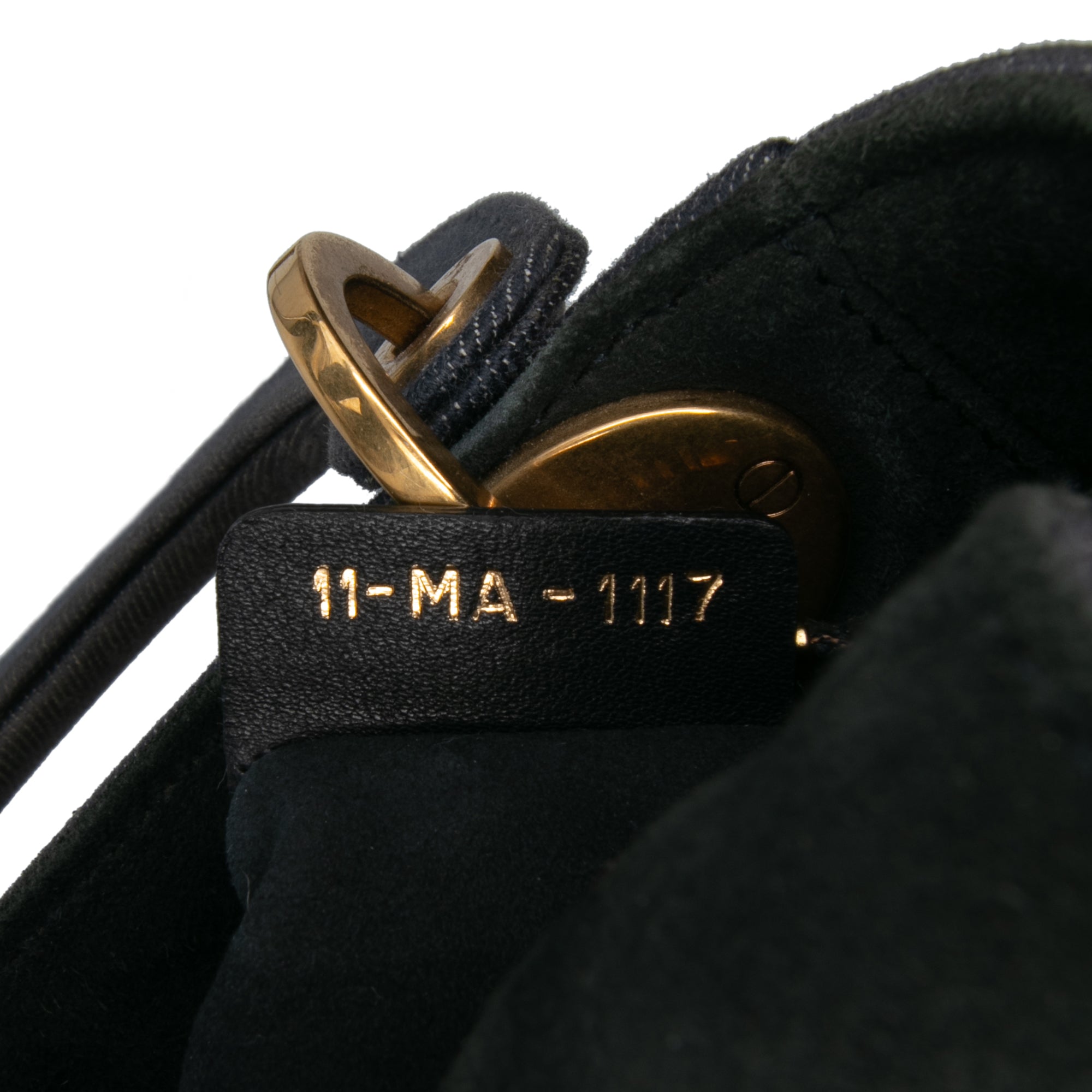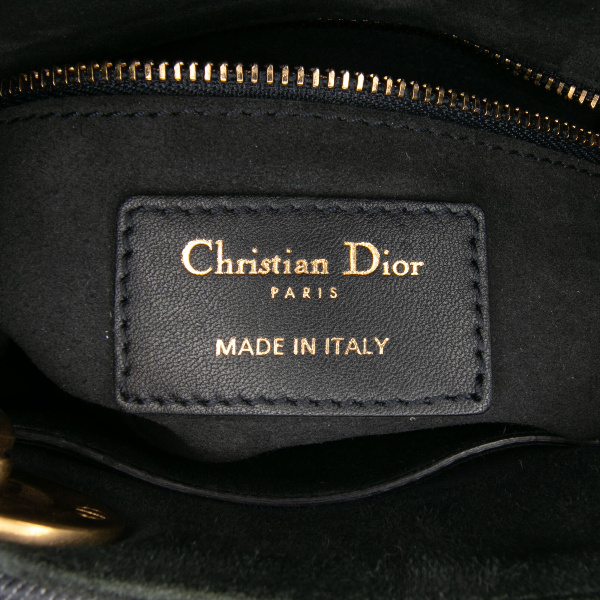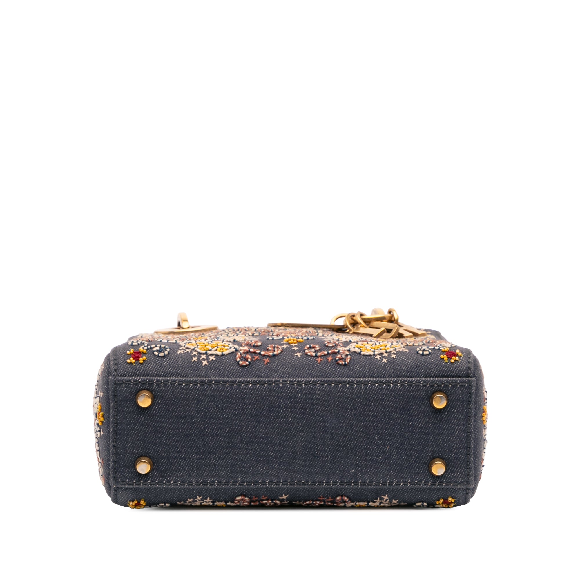 The Lady Dior features an embroidered denim body, flat handles, a detachable chain link strap with leather guard, a fold-in flap closure, and interior zip and slip pockets. Retail Price: 4400.00