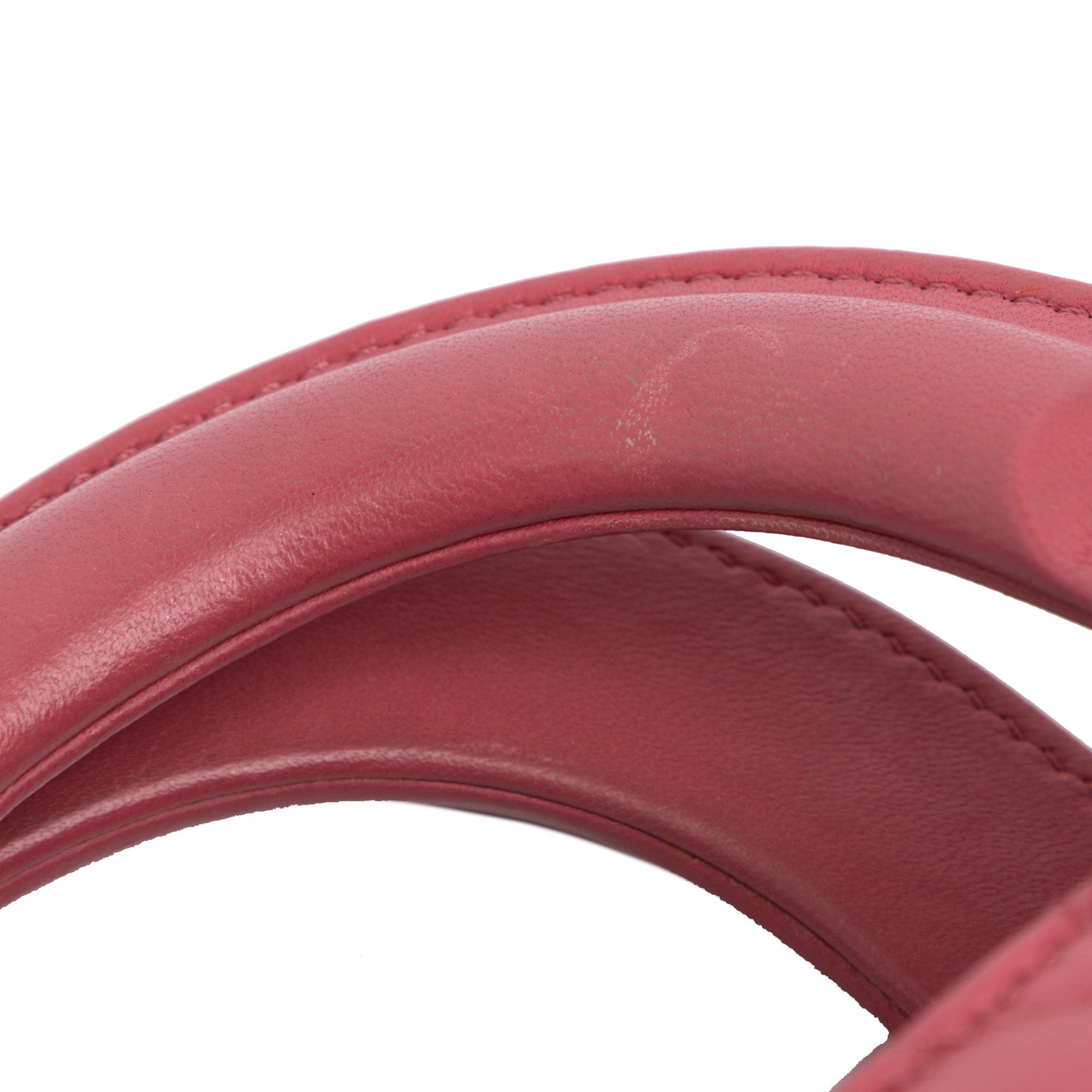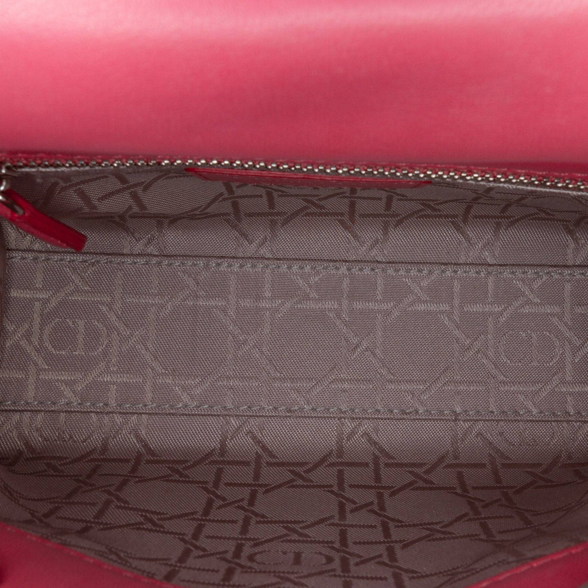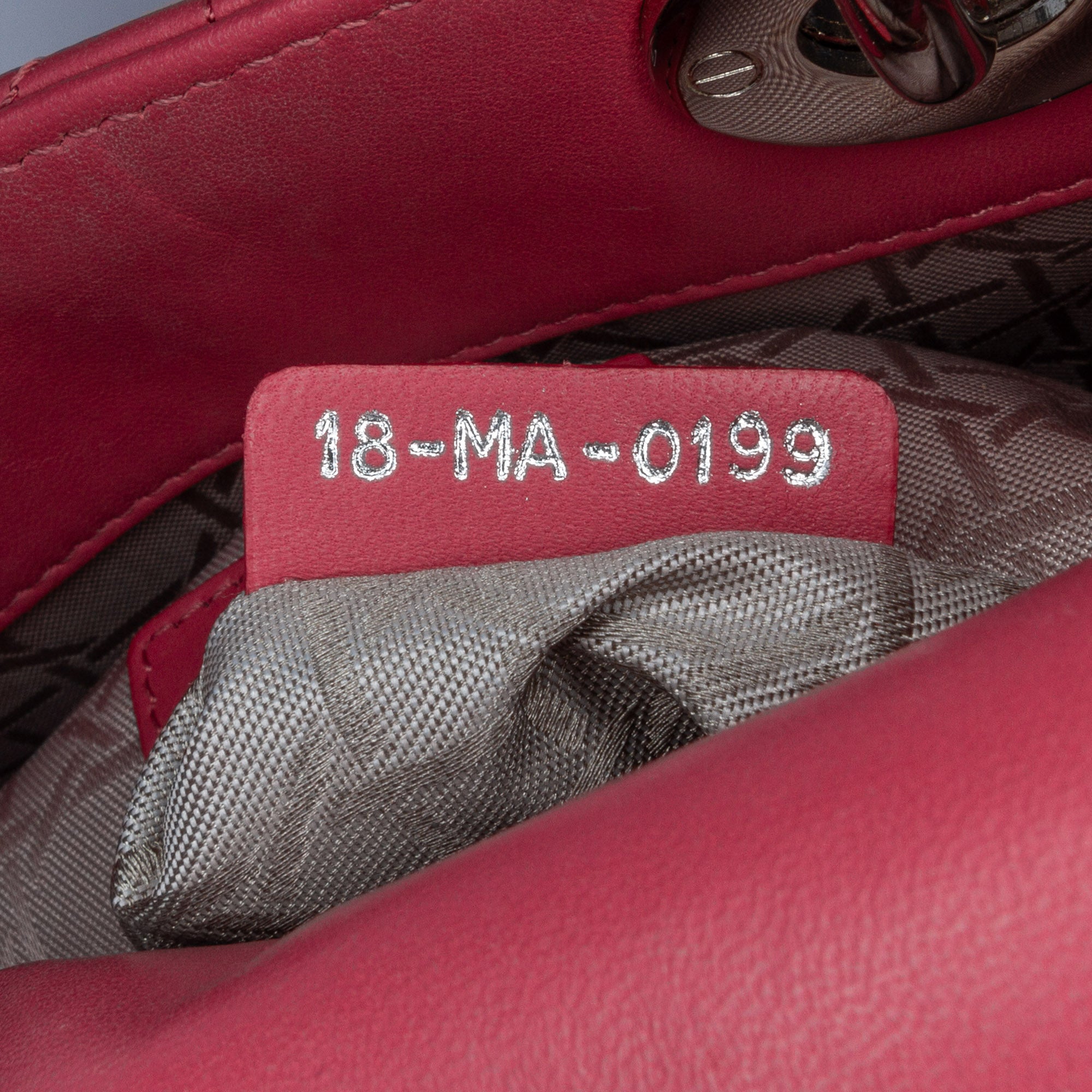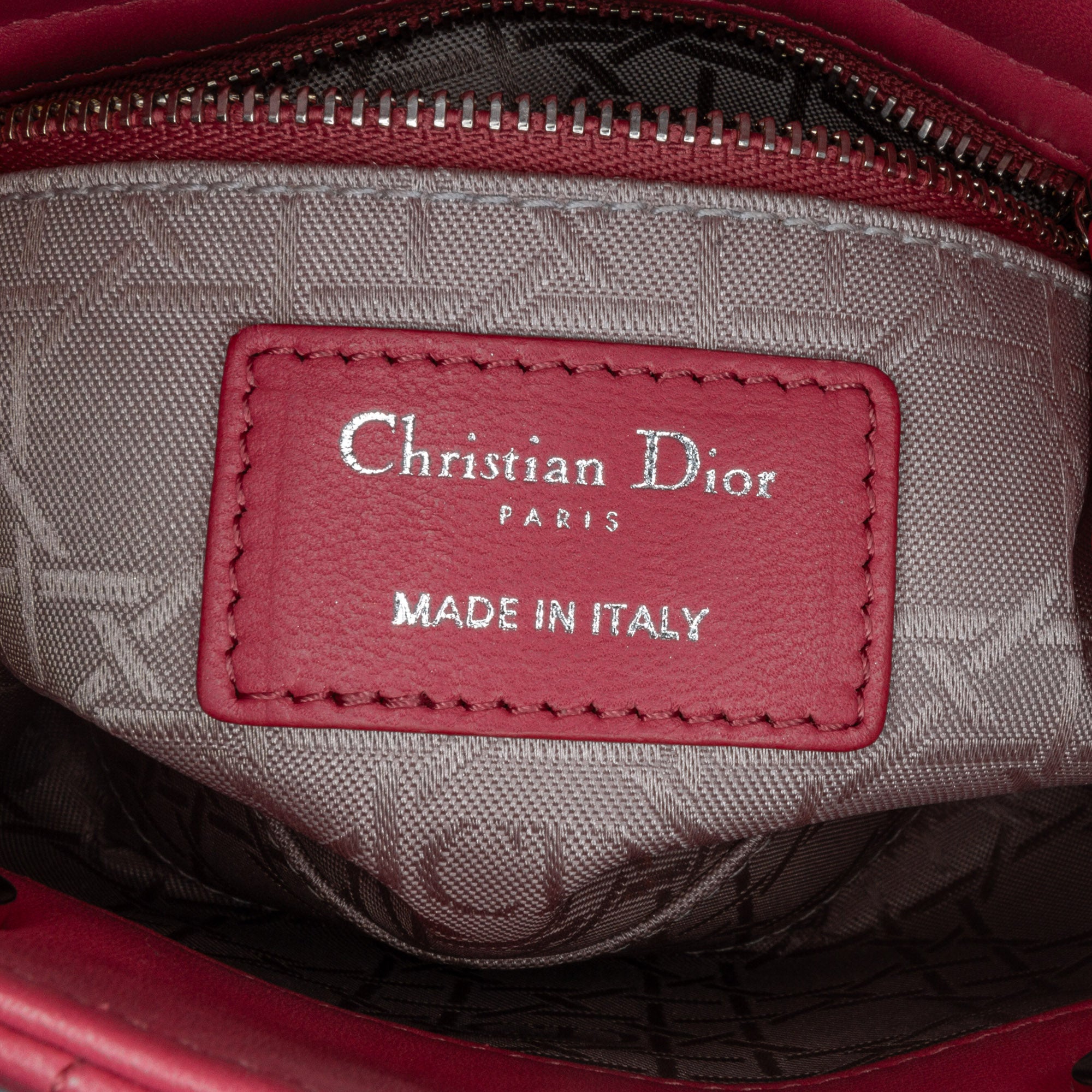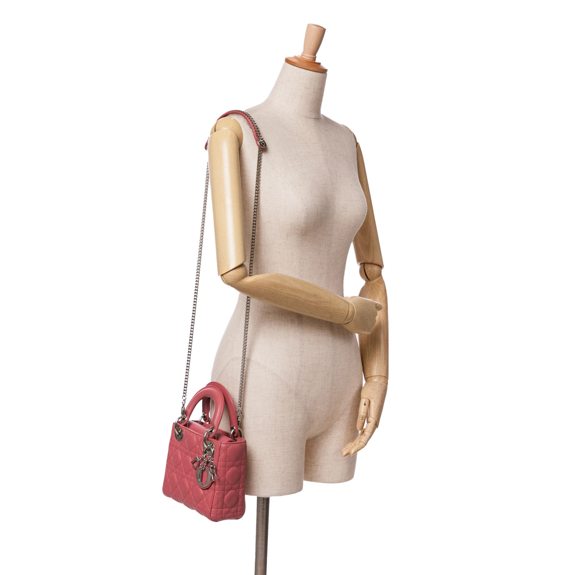 The Mini Lady Dior features a quilted lambskin leather body, flat leather top handles, a detachable flat leather shoulder strap, a fold-in flap closure, and an interior zip pocket. Retail Price: 5570.00