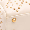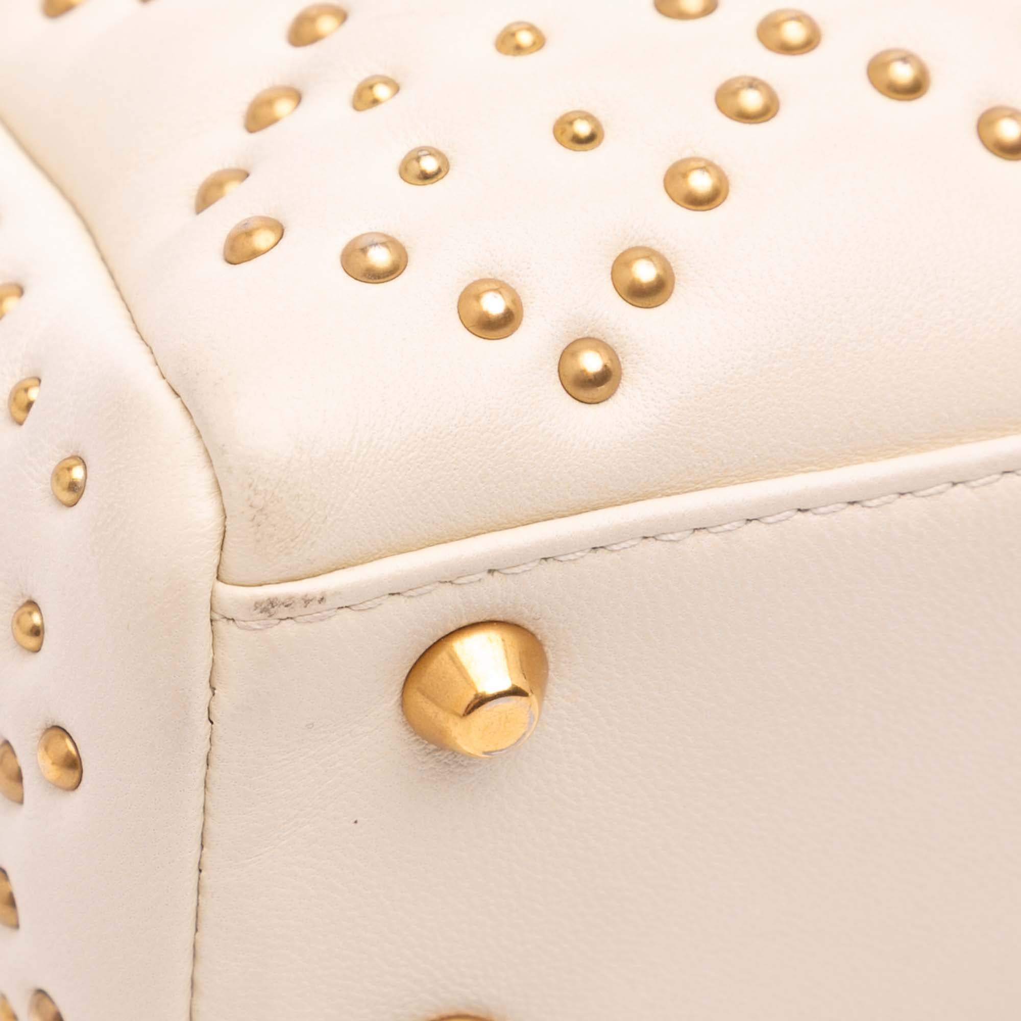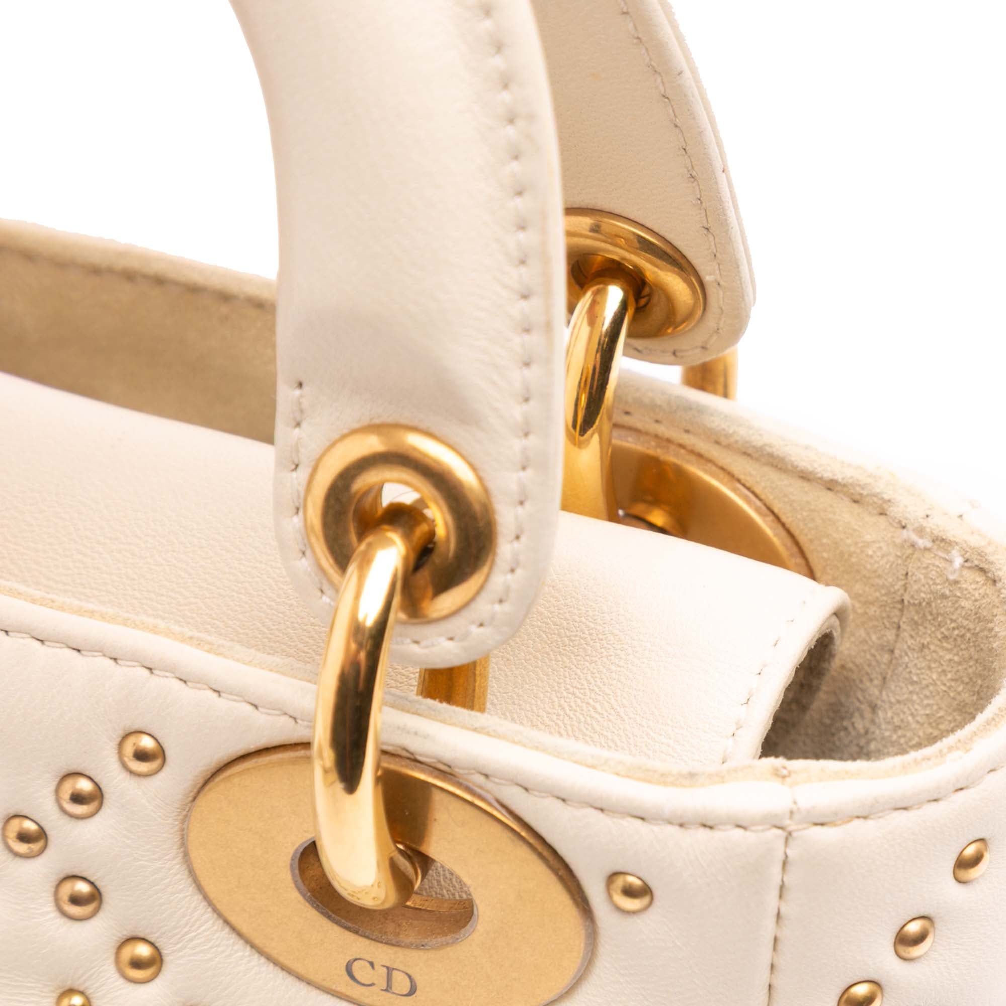 The Lady Dior satchel features a studded leather body, flat handles, a detachable flat studded leather strap, a studded fold-in flap closure at top, and interior zip and slip pockets. Retail Price: 4100.00