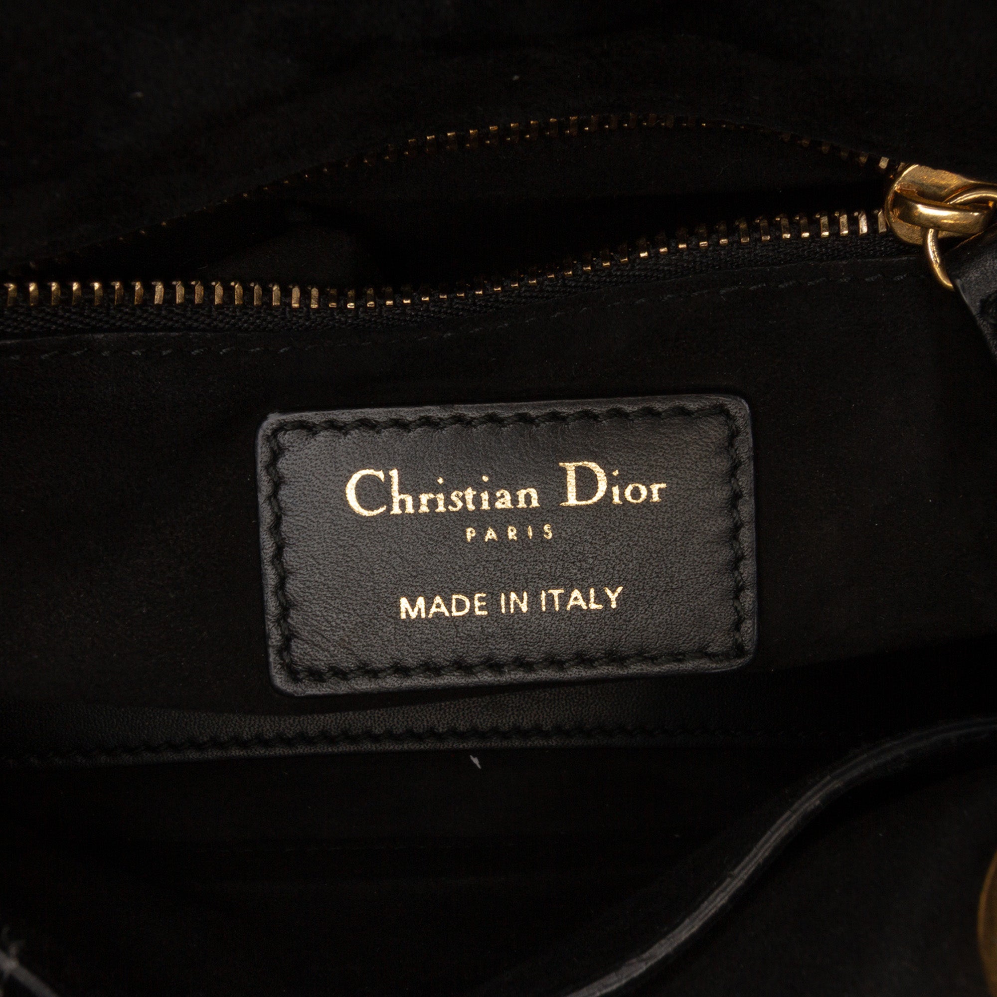 The Lady Dior satchel features a studded lambskin leather body, flat leather handles, a detachable flat studded leather strap, a fold-in flap closure, and interior zip and slip pockets. Retail Price: 4100.00