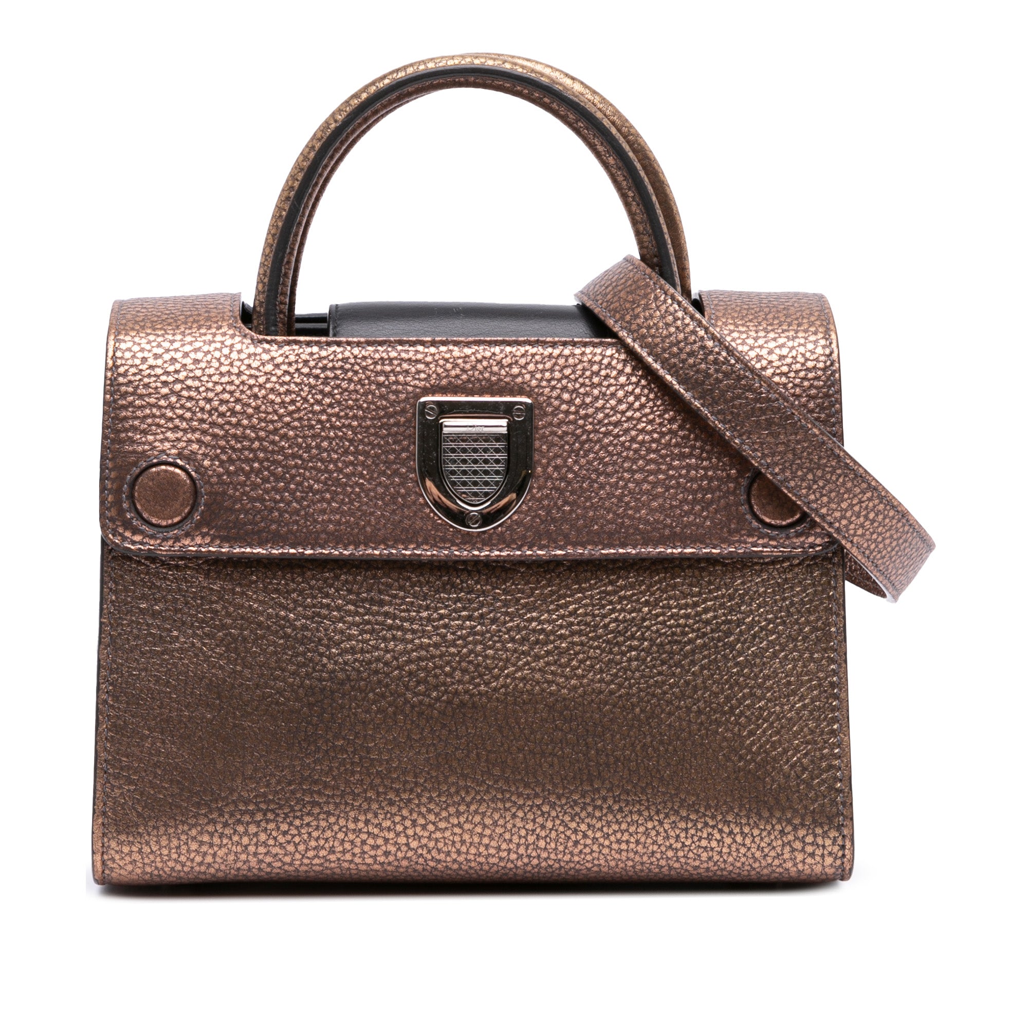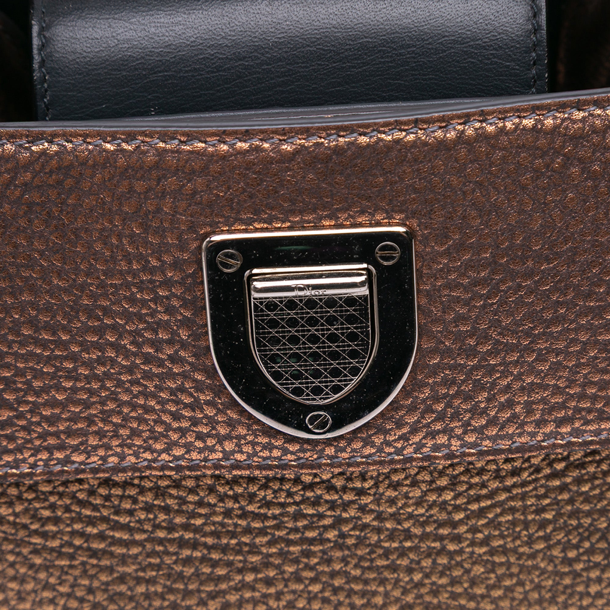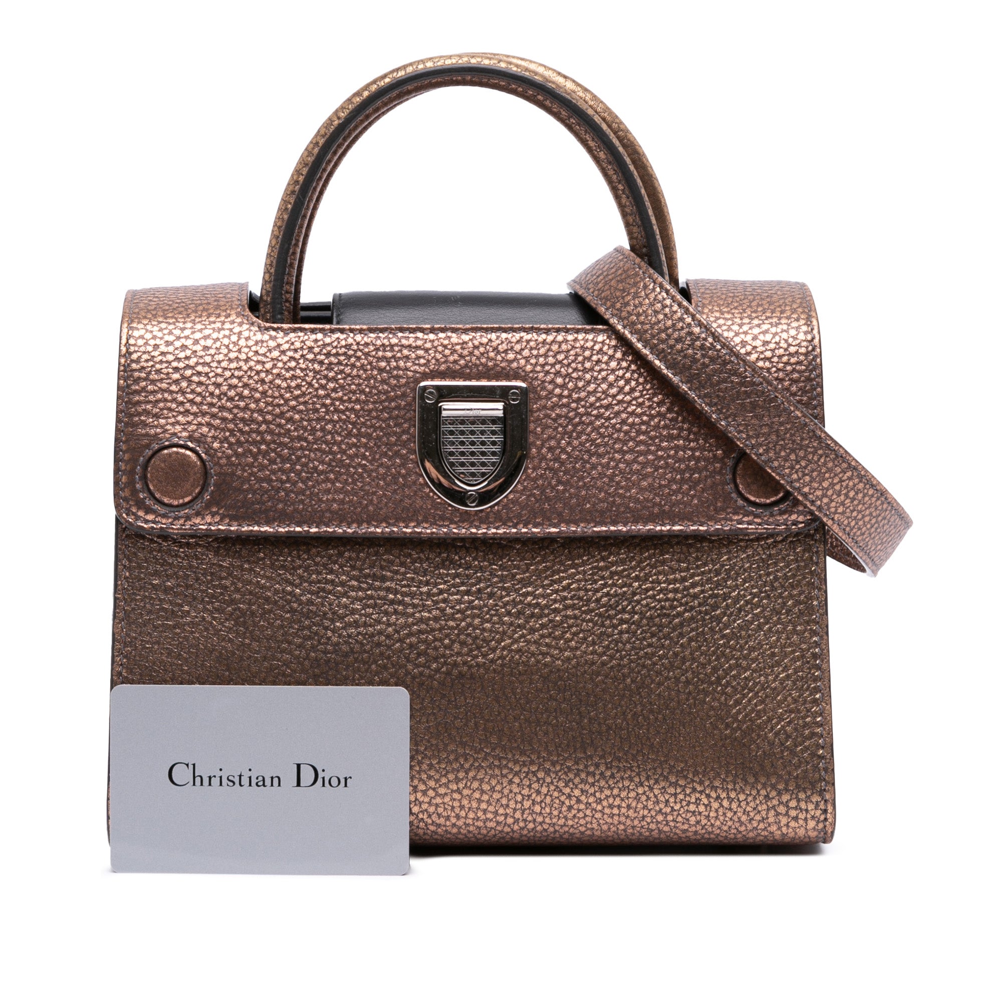 The Diorever features a metallic leather body, rolled leather handles, an adjustable and detachable flat leather strap, a top flap with a push lock closure, and interior slip pockets. Inclusion: authenticity card. Retail Price: 5600.00