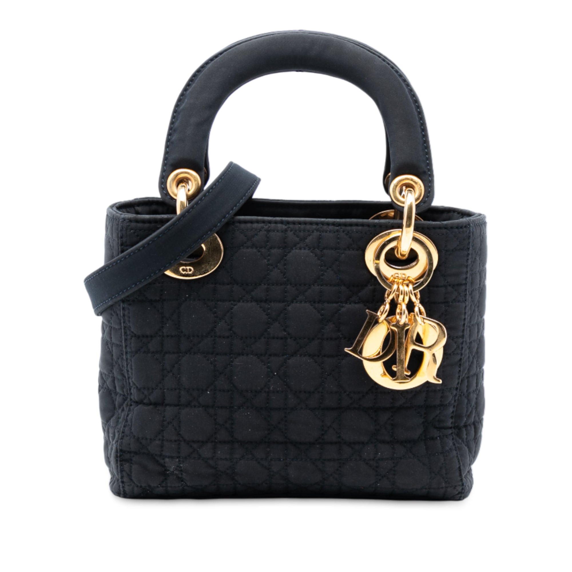 The Lady Dior features a quilted nylon body, flat top handles, a detachable strap, a fold-in flap closure, and an interior zip pocket. Retail Price: 2590.00
