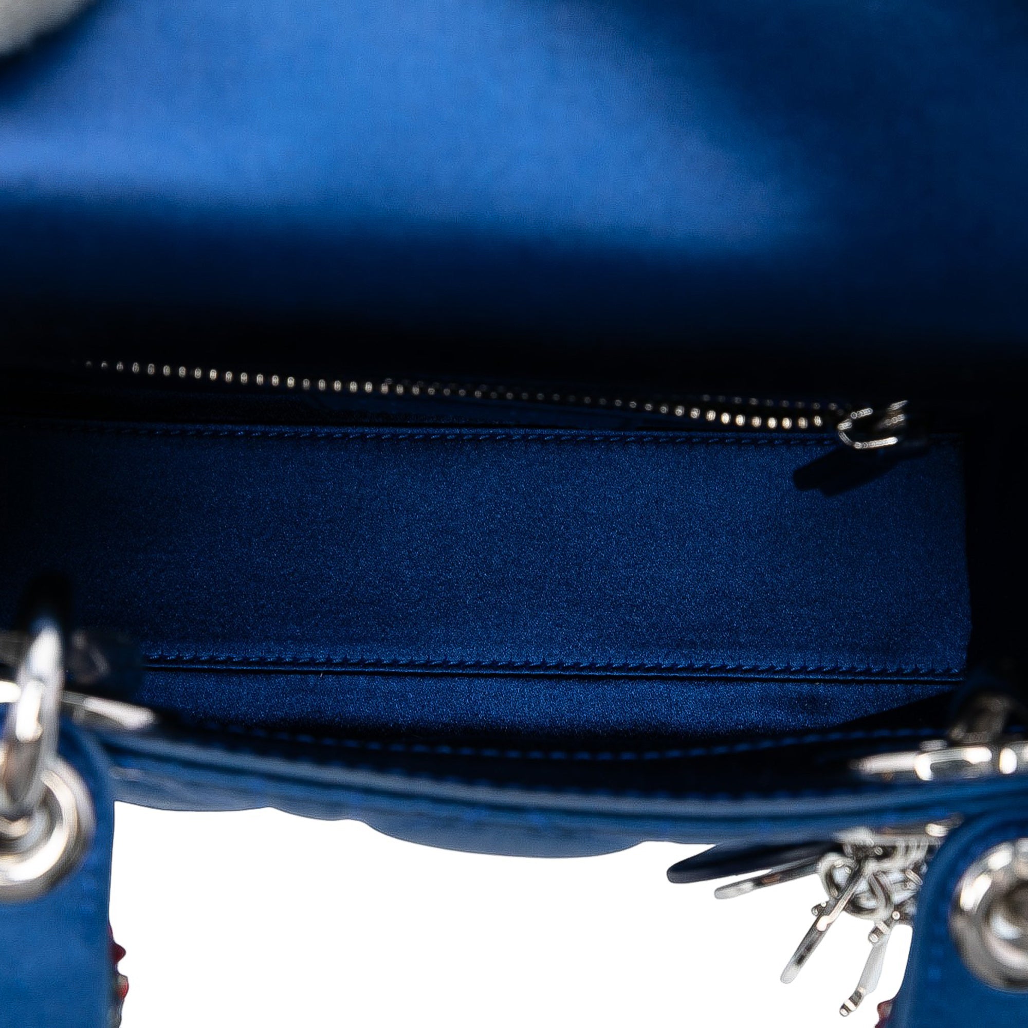 The Lady Dior features a satin body, beaded flat leather top handles, a detachable flat leather strap, a fold in flap closure, and an interior zip pocket. Retail Price: 4900.00