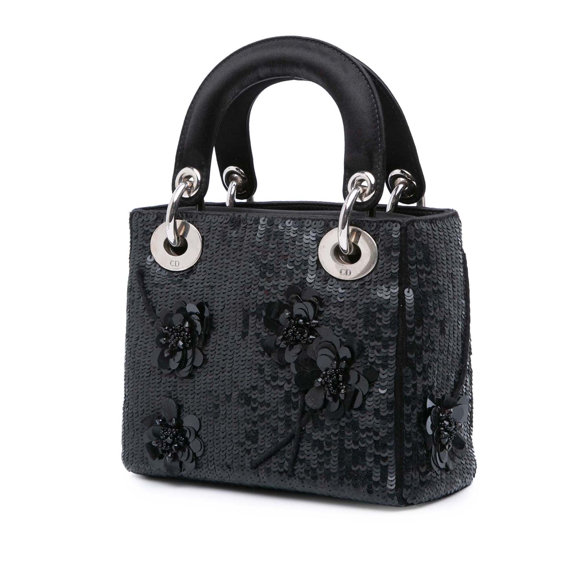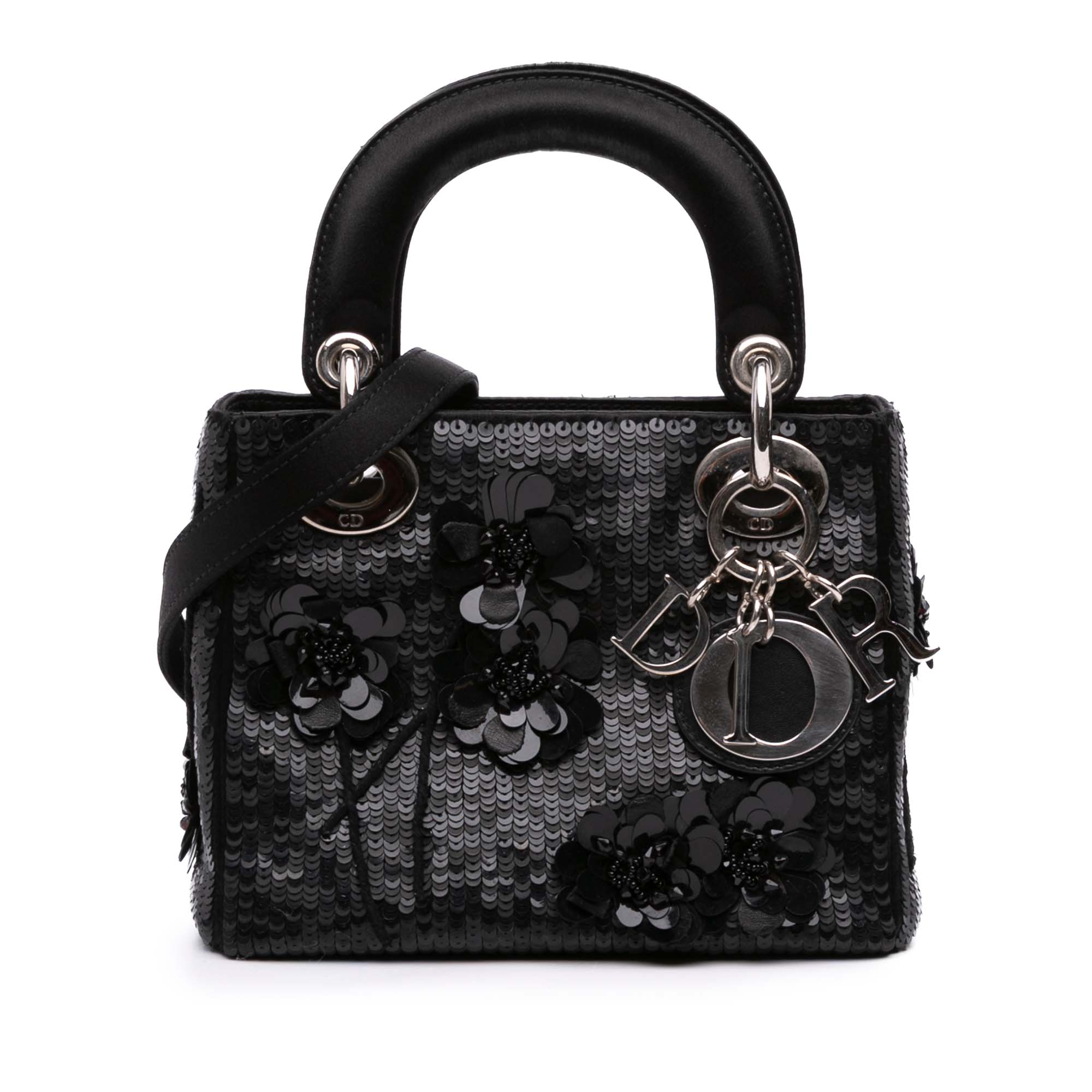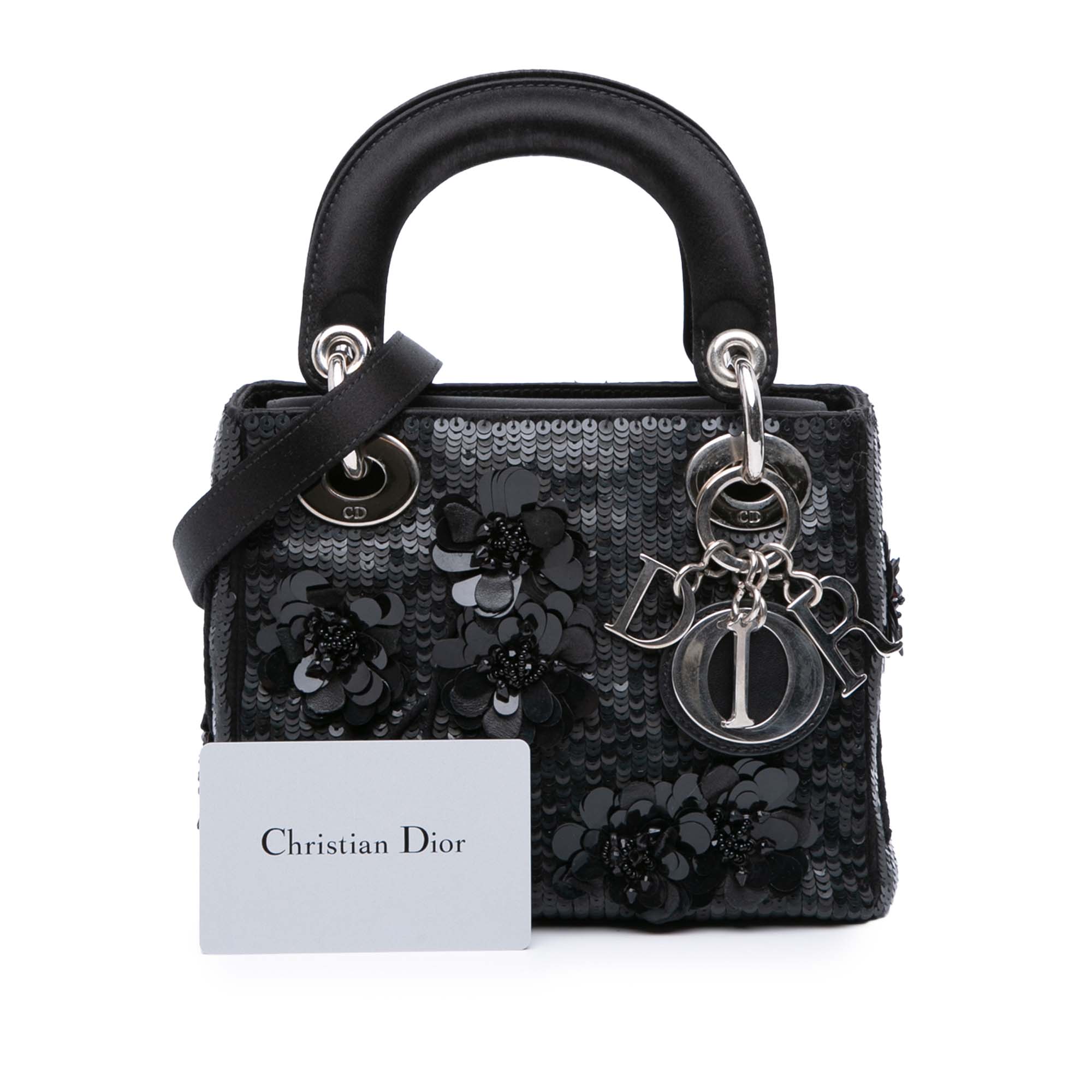 The Lady Dior features a sequin-embellished satin body, flat leather handles, a detachable flat leather strap, a fold in flap closure, and an interior zip pocket. Inclusion: authenticity card. Retail Price: 6900.00