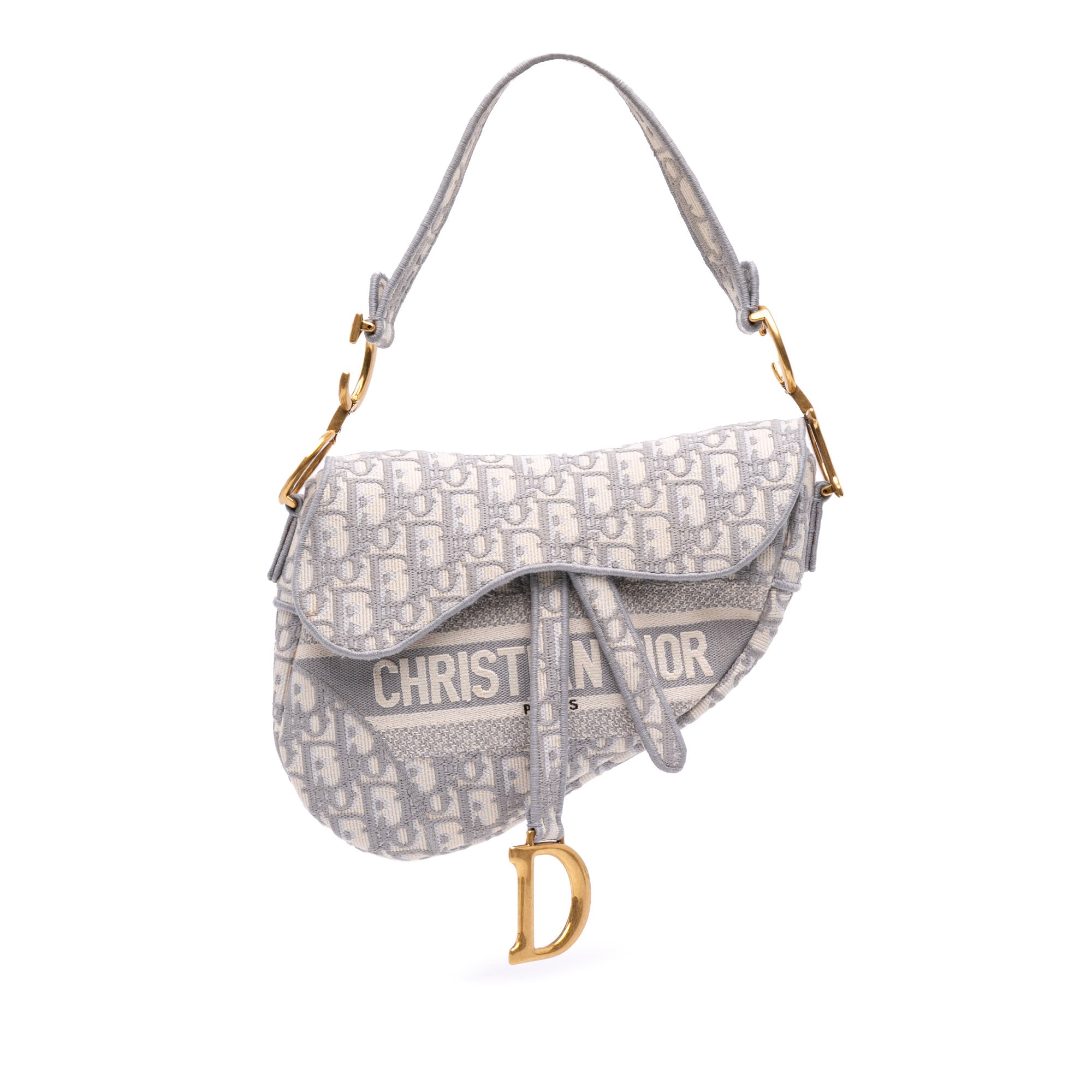 The Saddle features an embroidered canvas body with leather trim, a flat leather strap, an adjustable and detachable flat strap, a front flap with magnetic snap closure, and an interior slip pocket. Retail Price: 3950.00
