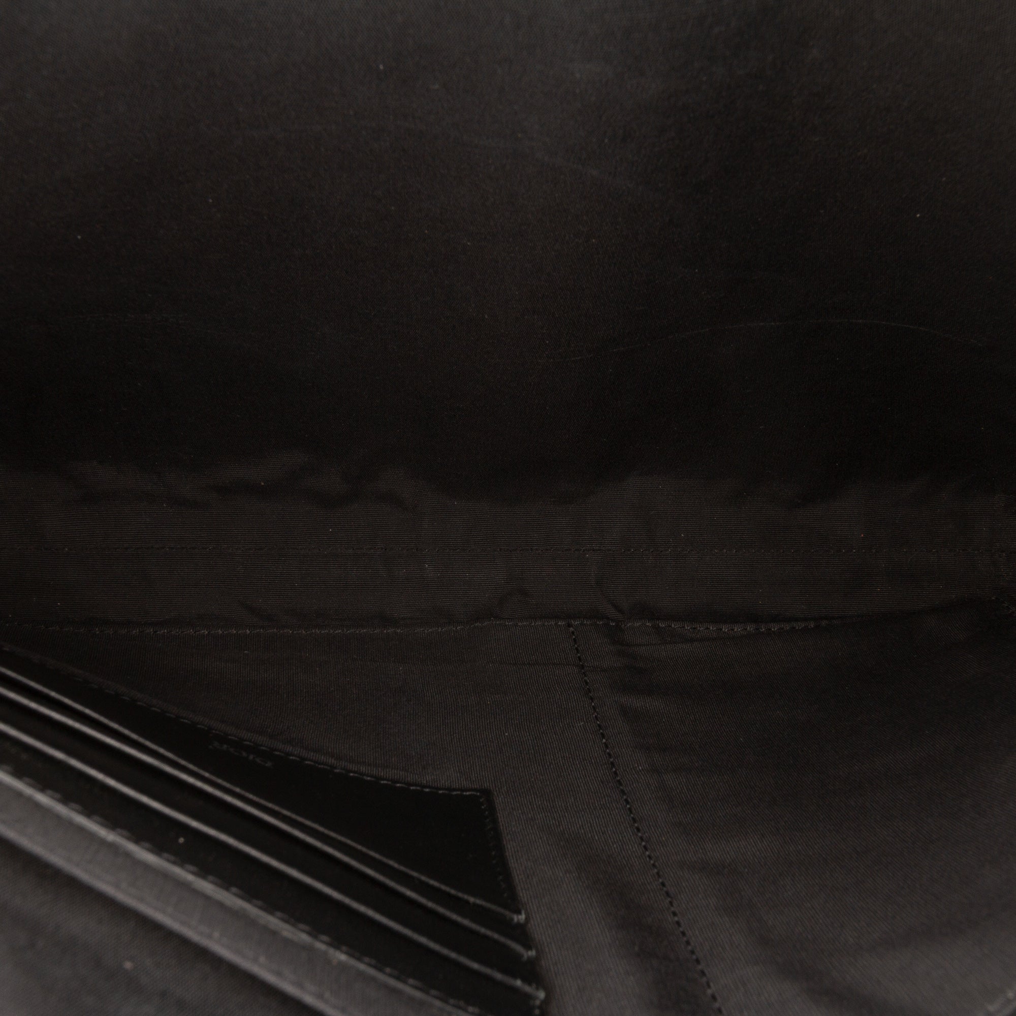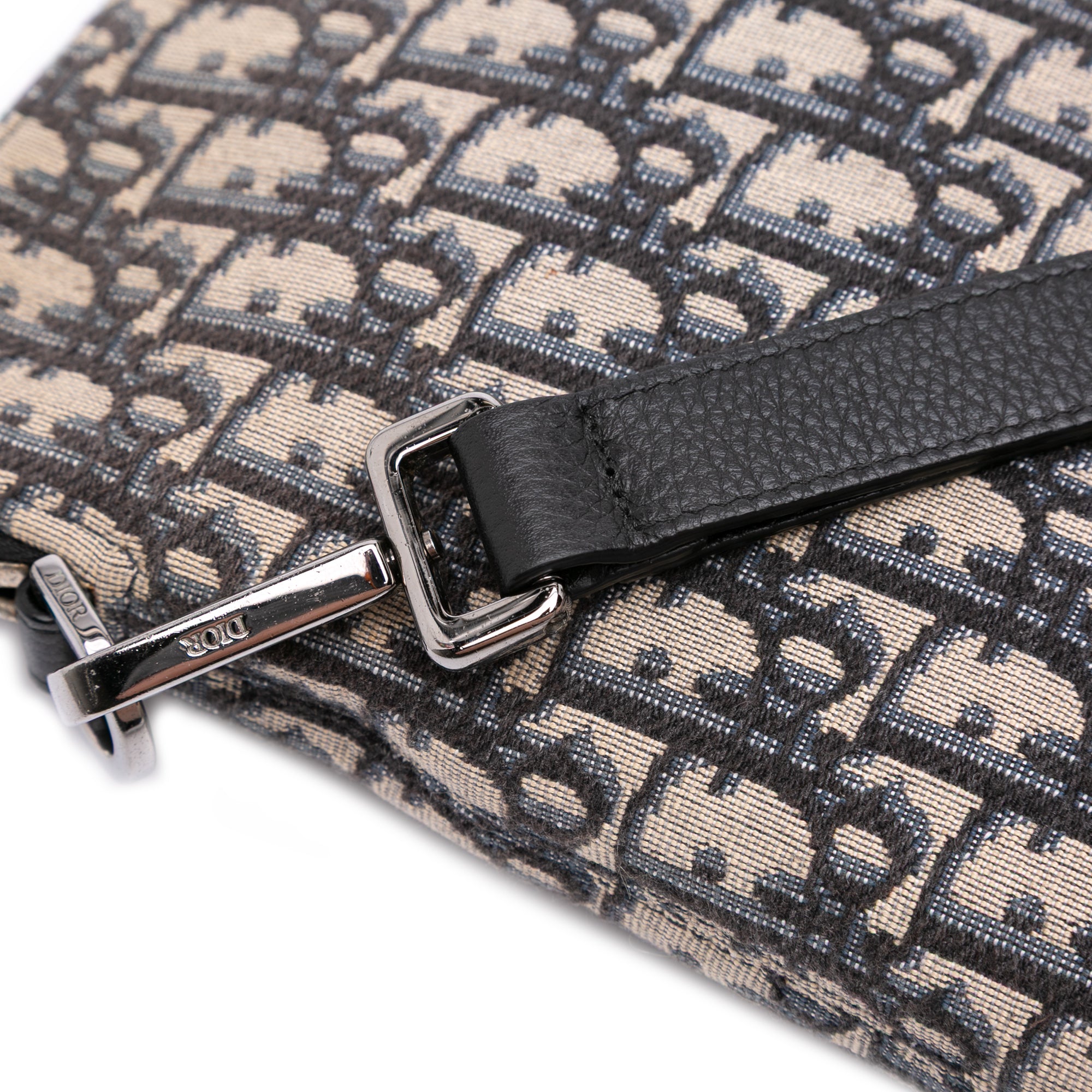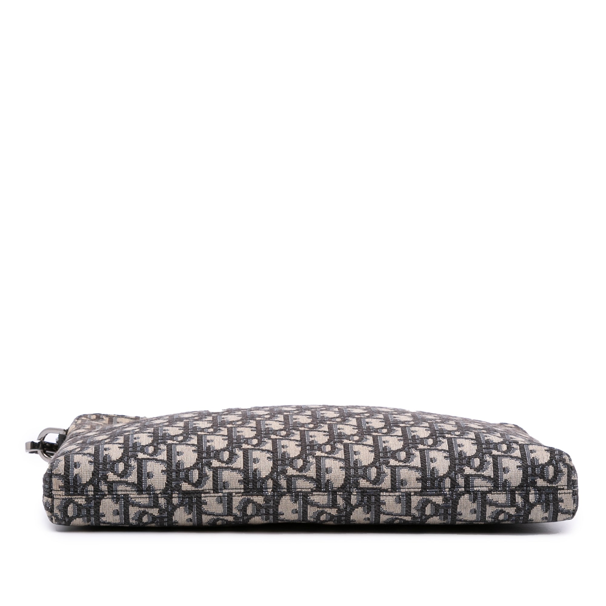 This clutch bag features an embroidered canvas body, a flat leather wrist strap, a top zip closure, and interior slip pockets. Retail Price: 1550.00