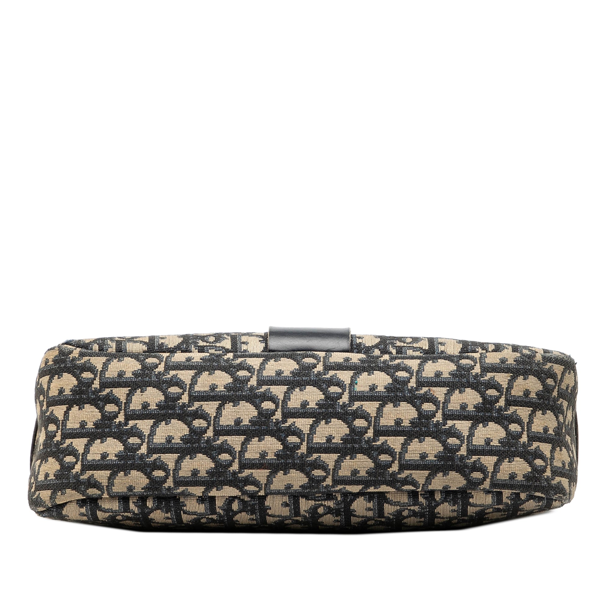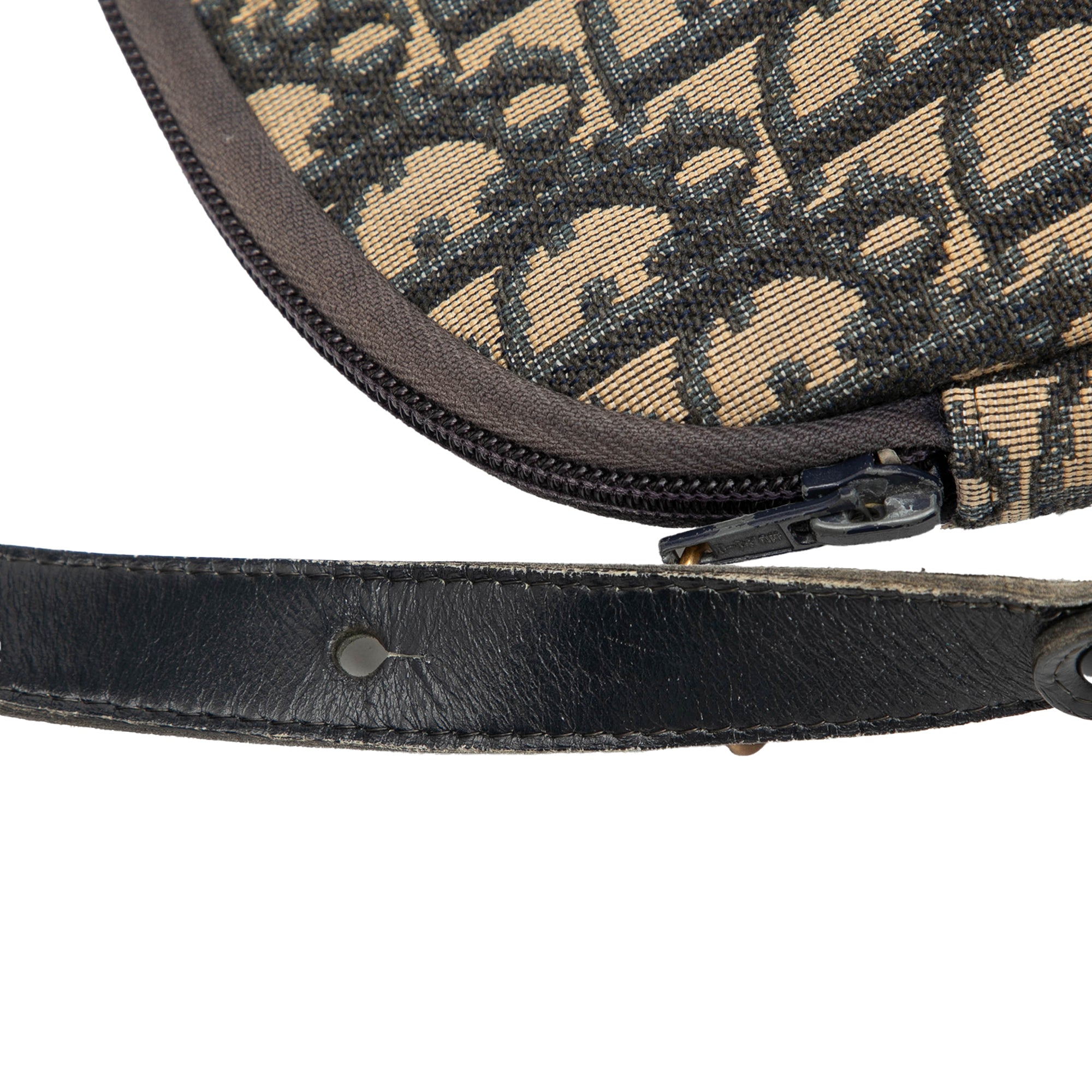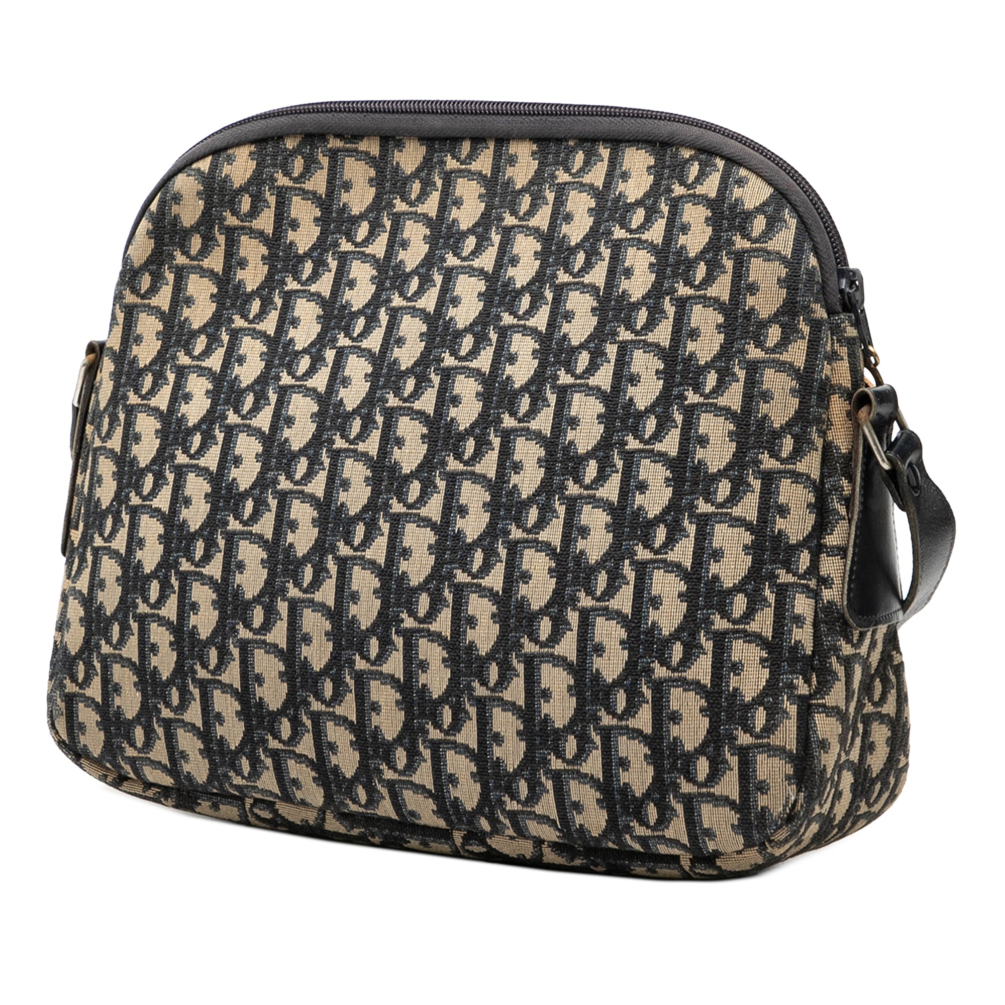 This shoulder bag features a canvas body with leather trim, an adjustable flat leather strap, and a top zip closure. Retail Price: 1000.00