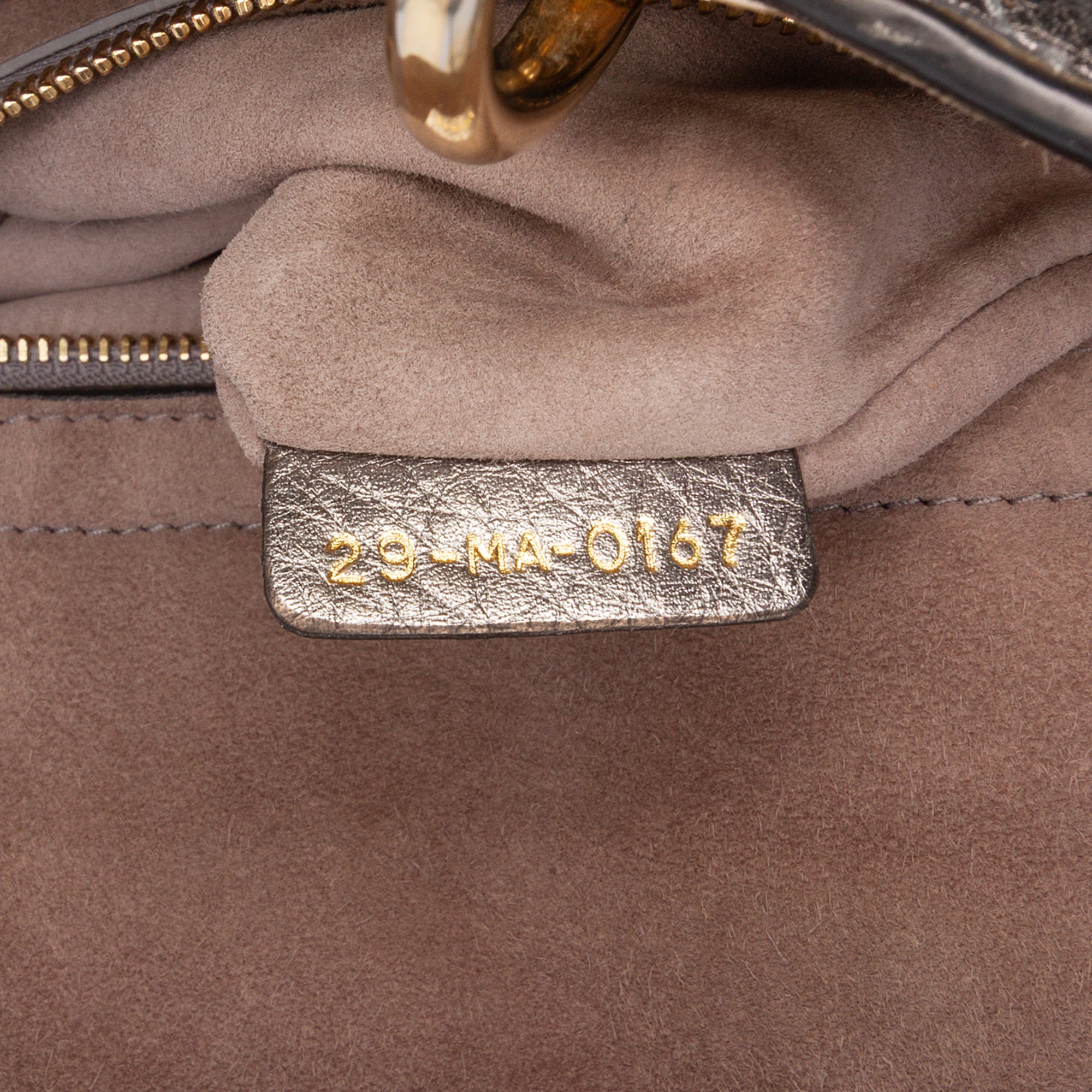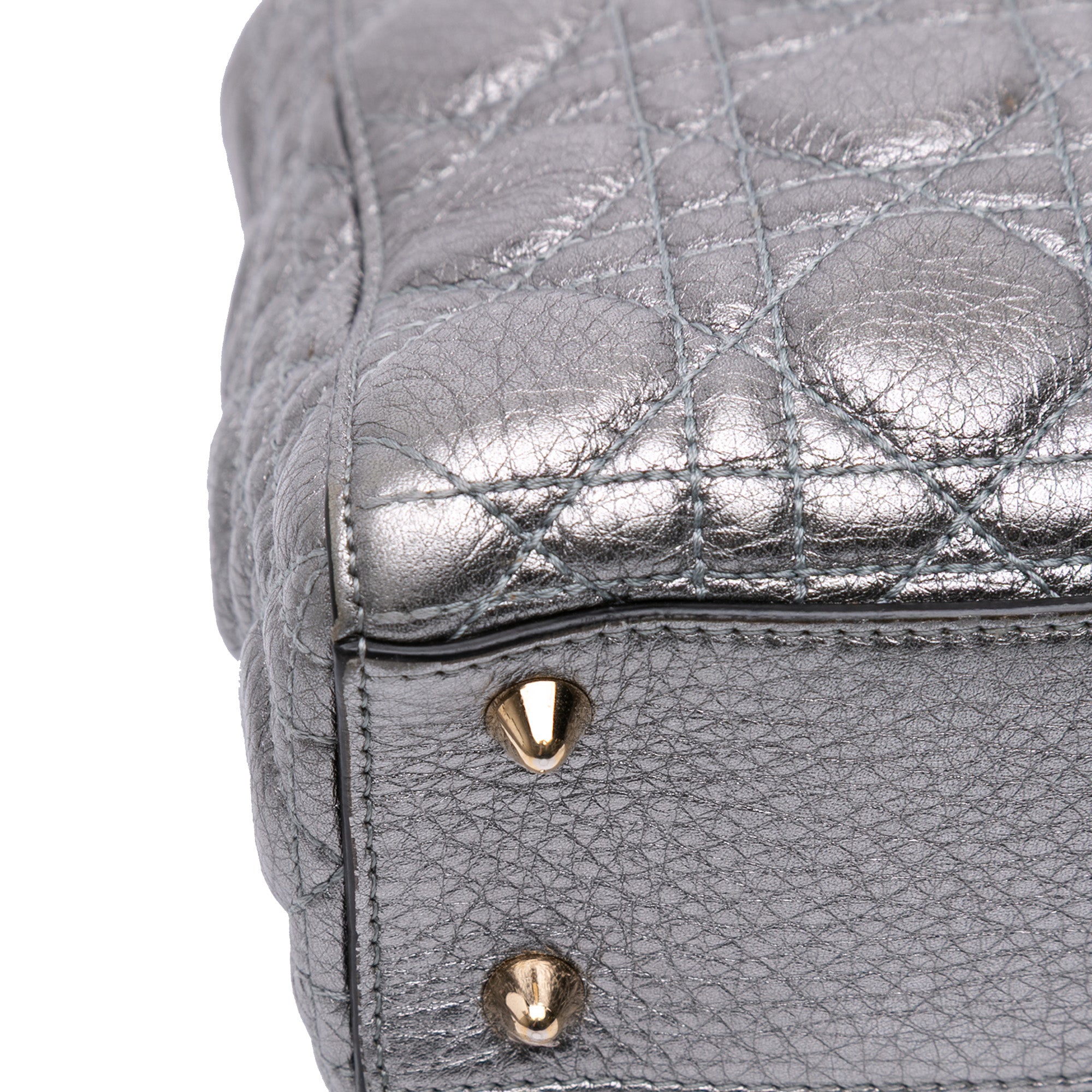 The Supple Lady Dior features a metallic quilted calfskin leather body, flat leather handles, a detachable flat strap, a fold-in flap closure, and interior zip and slip pockets. Retail Price: 6100.00