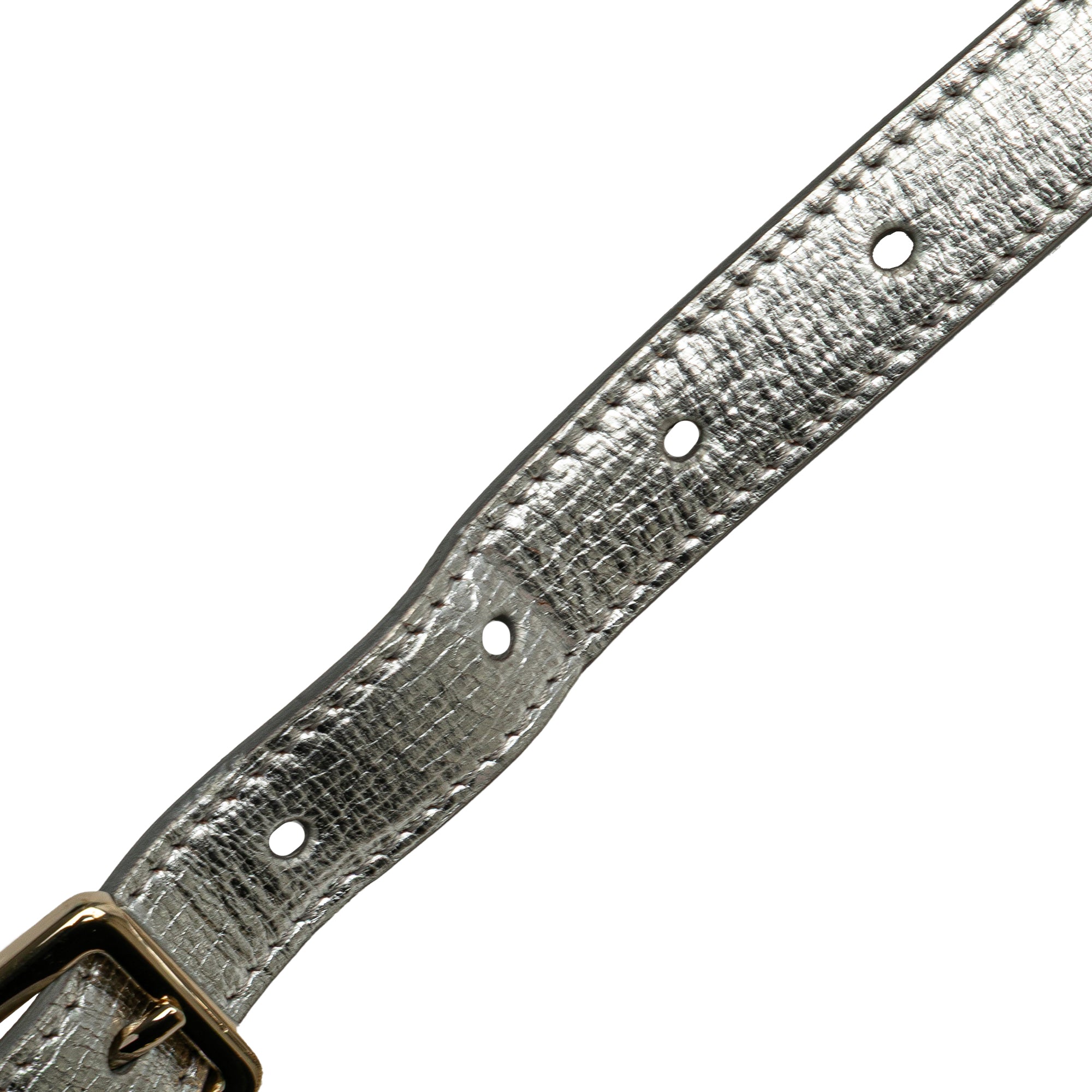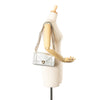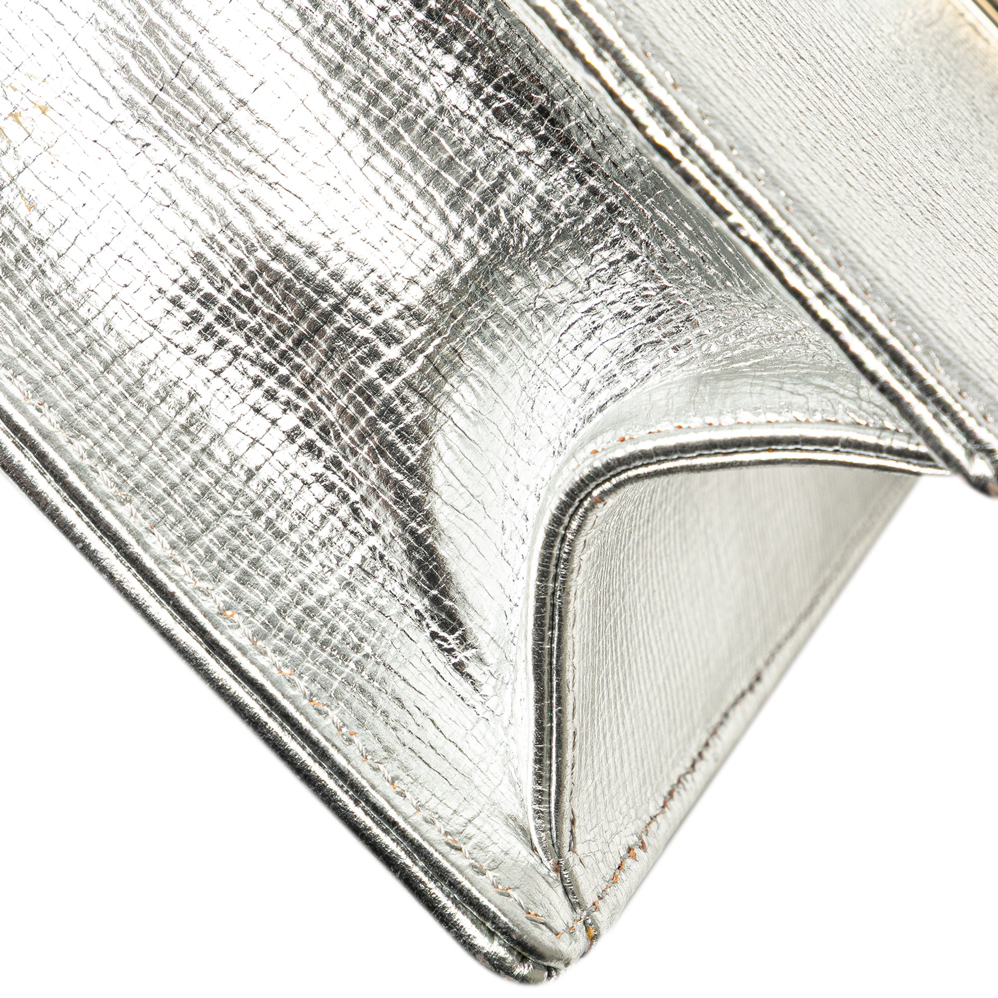 The Diorama features a metallic leather body, a chain link shoulder strap with leather shoulder guard, a front flap with a push lock closure, and interior zip and slip pockets. Retail Price: 3350.00
