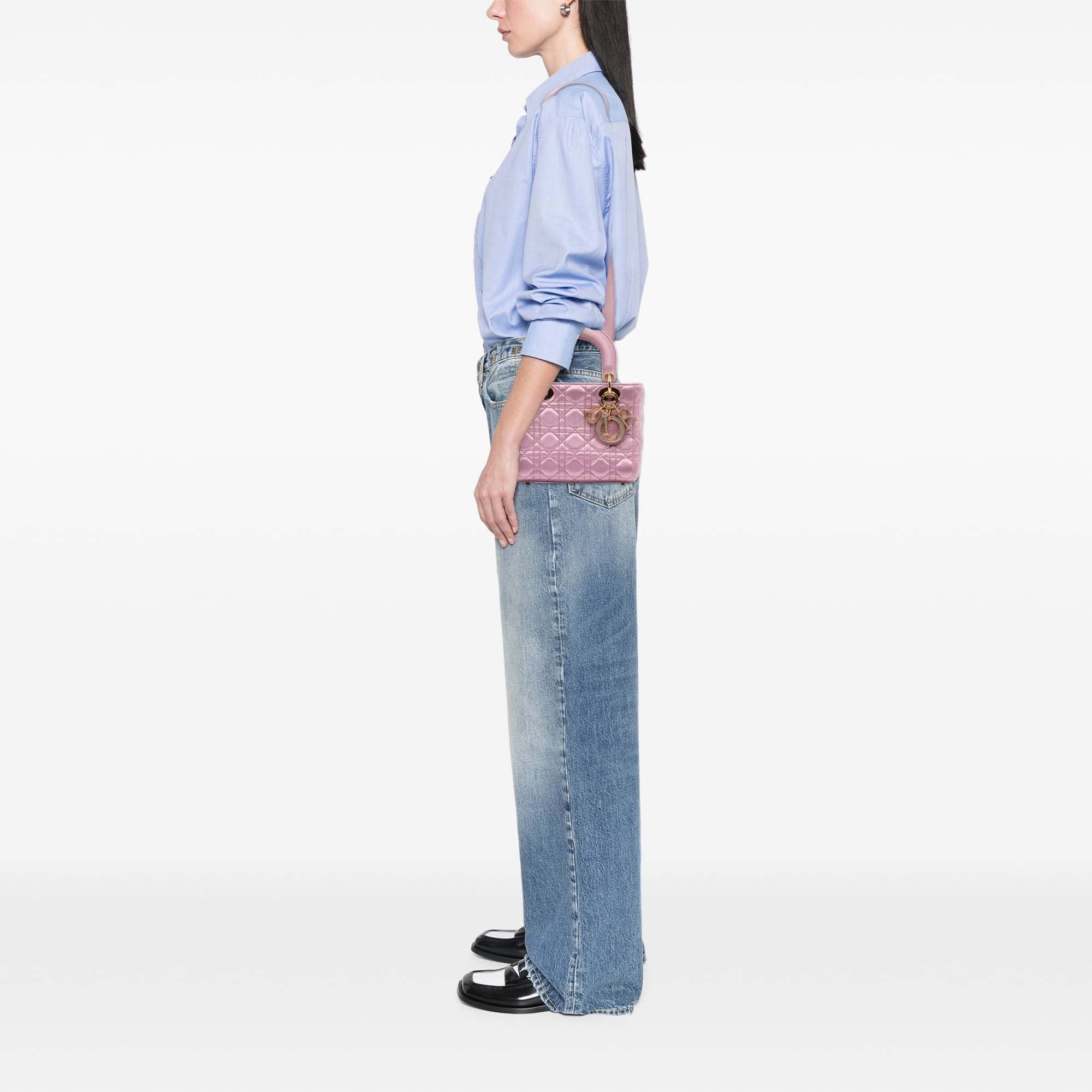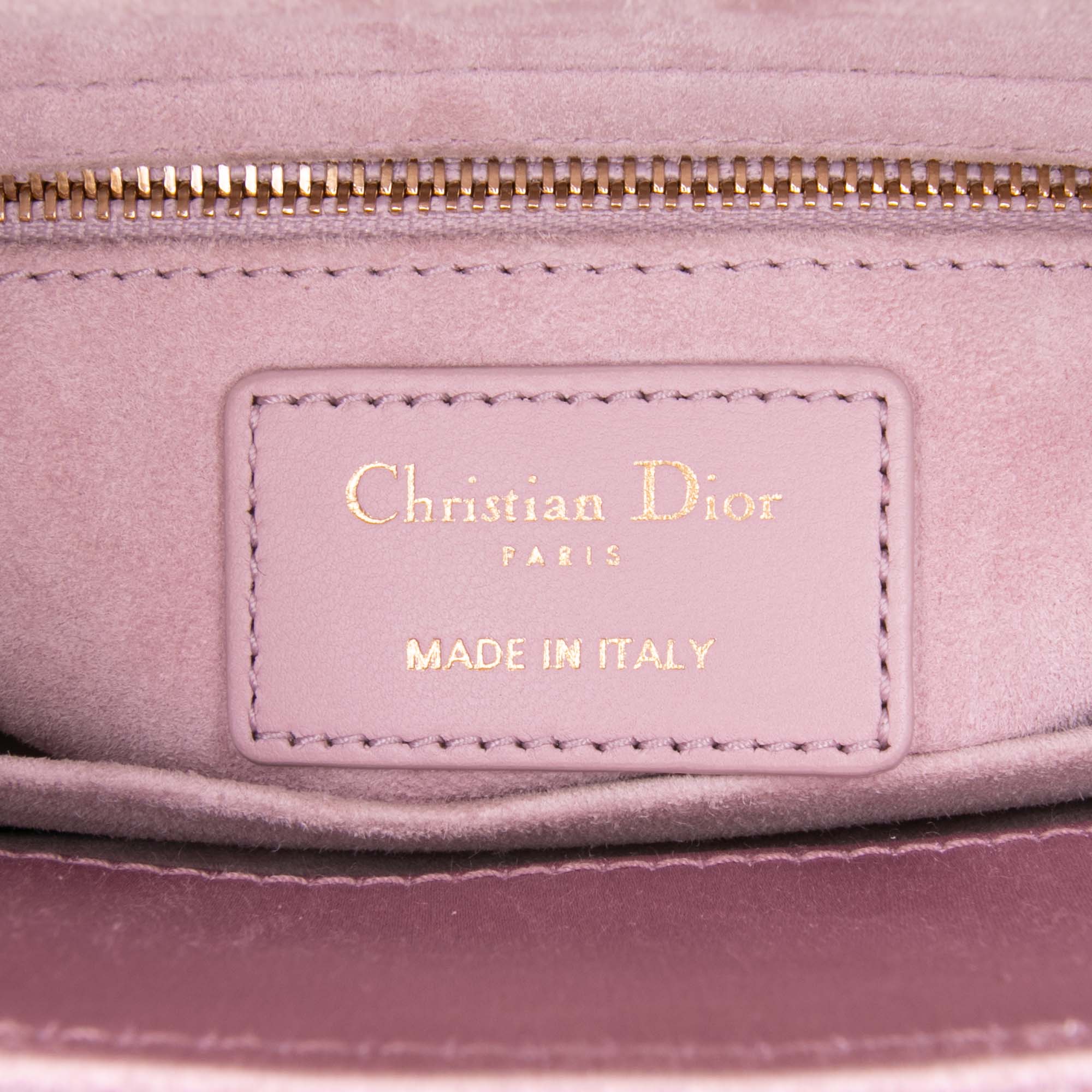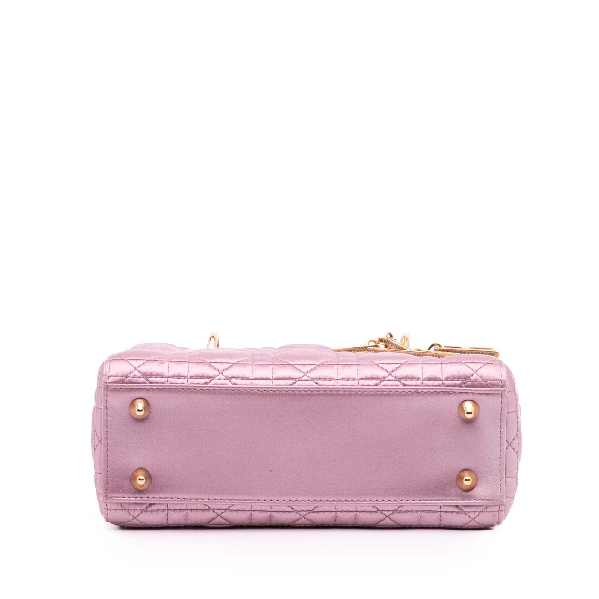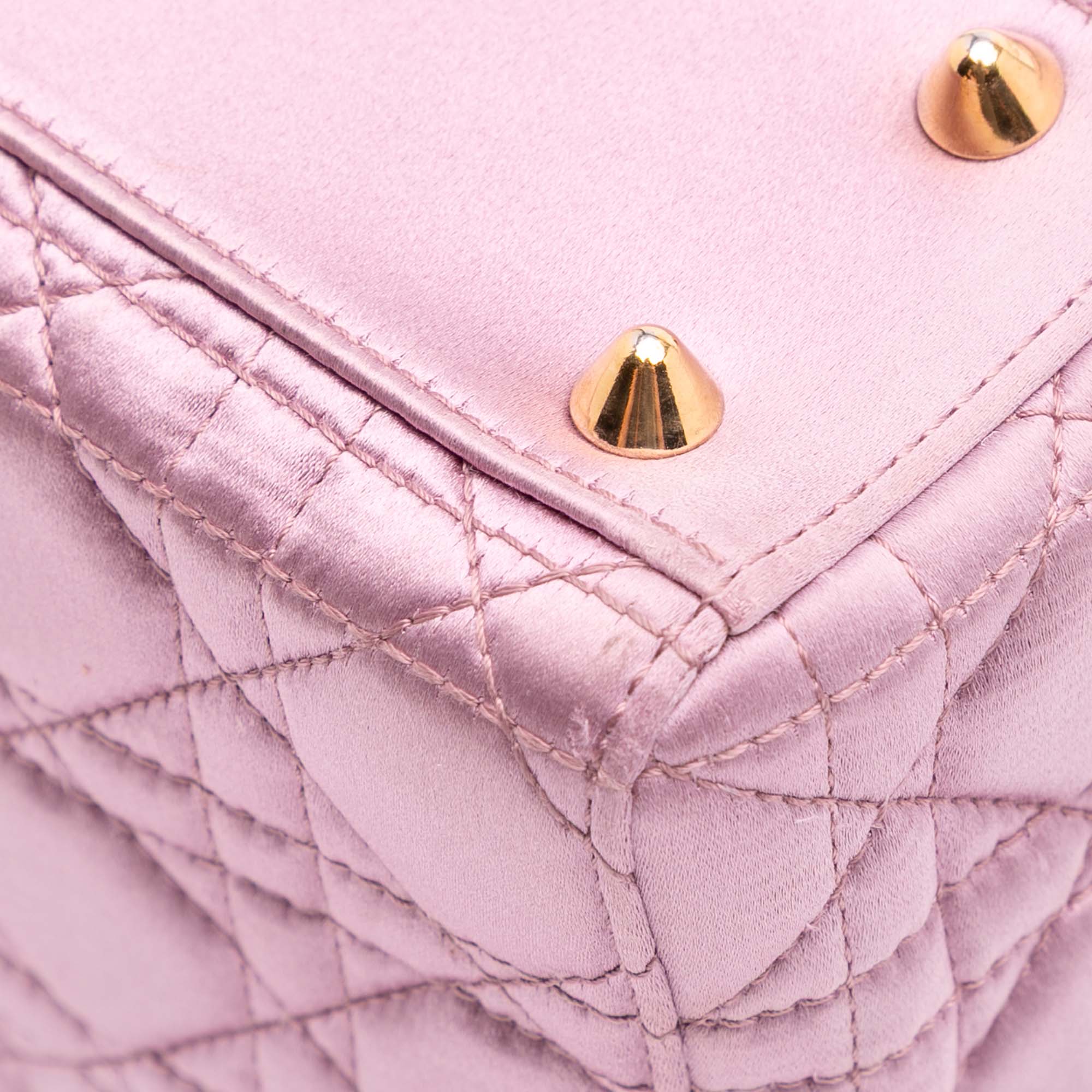 The Lady Dior features a quilted satin body with swarovski details, rolled leather handles, a detachable flat strap, a fold in flap closure, and interior zip and slip pockets. Retail Price: 6200.00