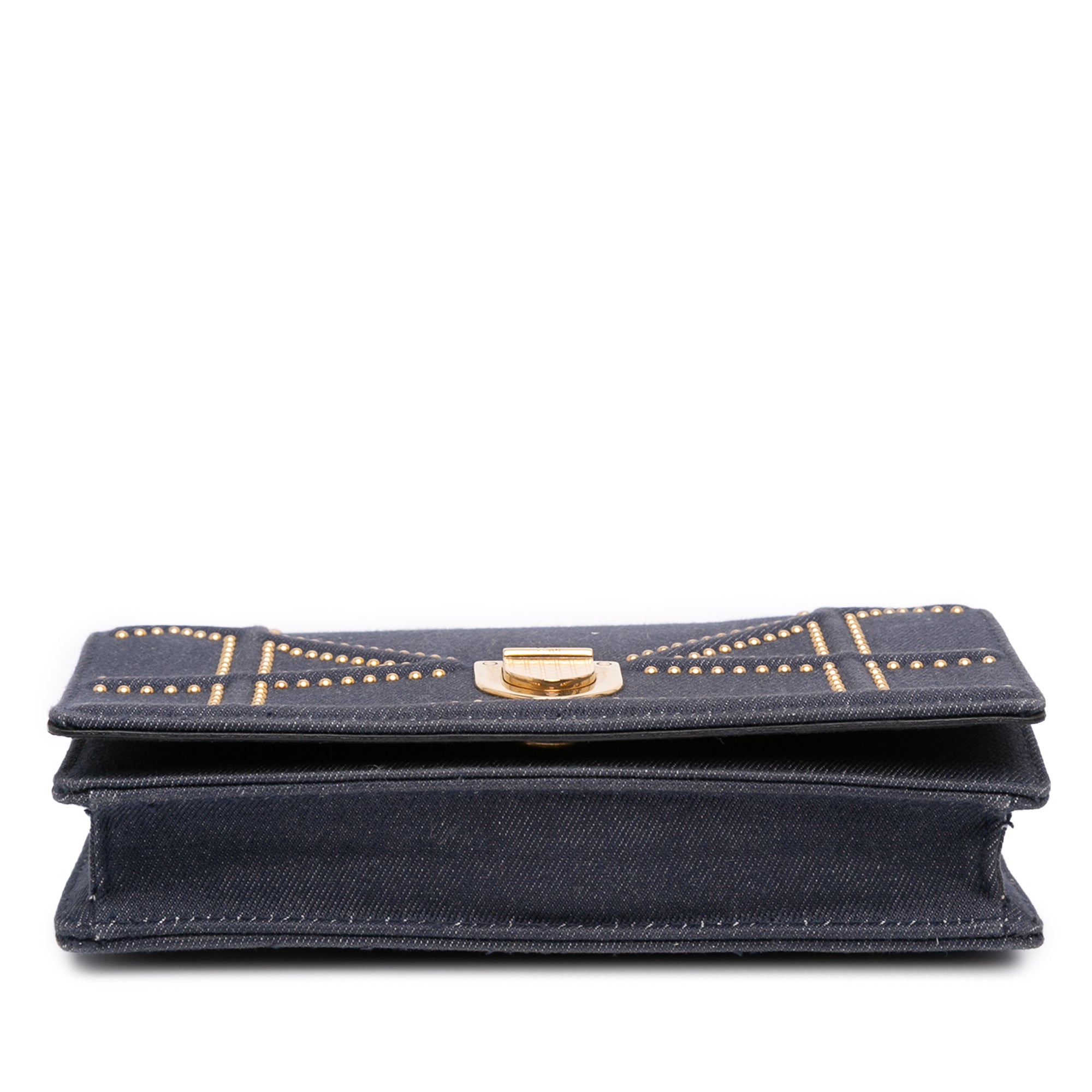 The Diorama wallet on chain features a studded denim body, a chain link shoulder strap, a front flap with a push lock closure, and interior zip and slip pockets. Retail Price: 1850.00