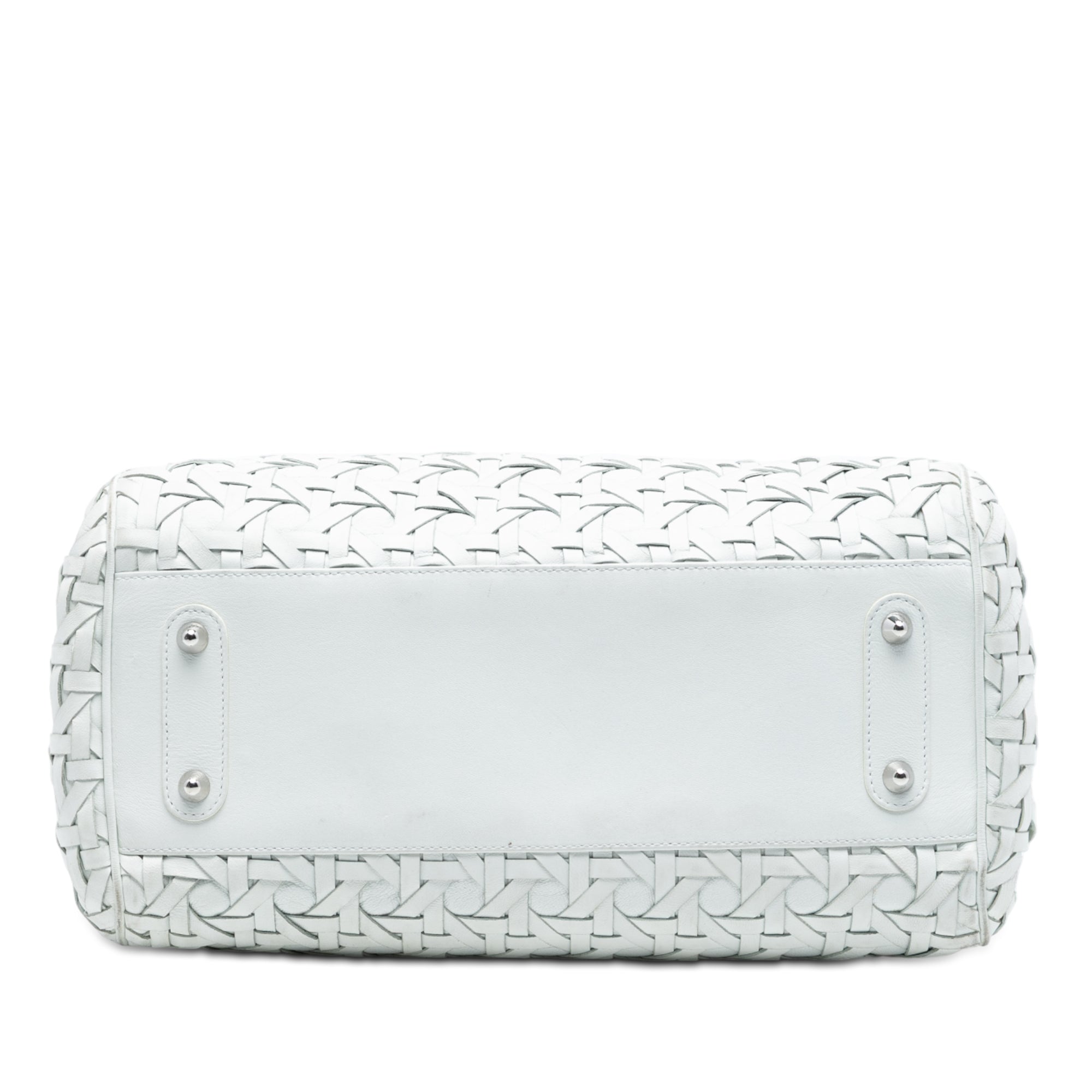 This satchel features a woven leather body, structured leather handles, a detachable strap, an open top, an interior zip compartment, and interior zip and slip pockets. Inclusion: Dust bag, authenticity card. Retail Price: 2100.00