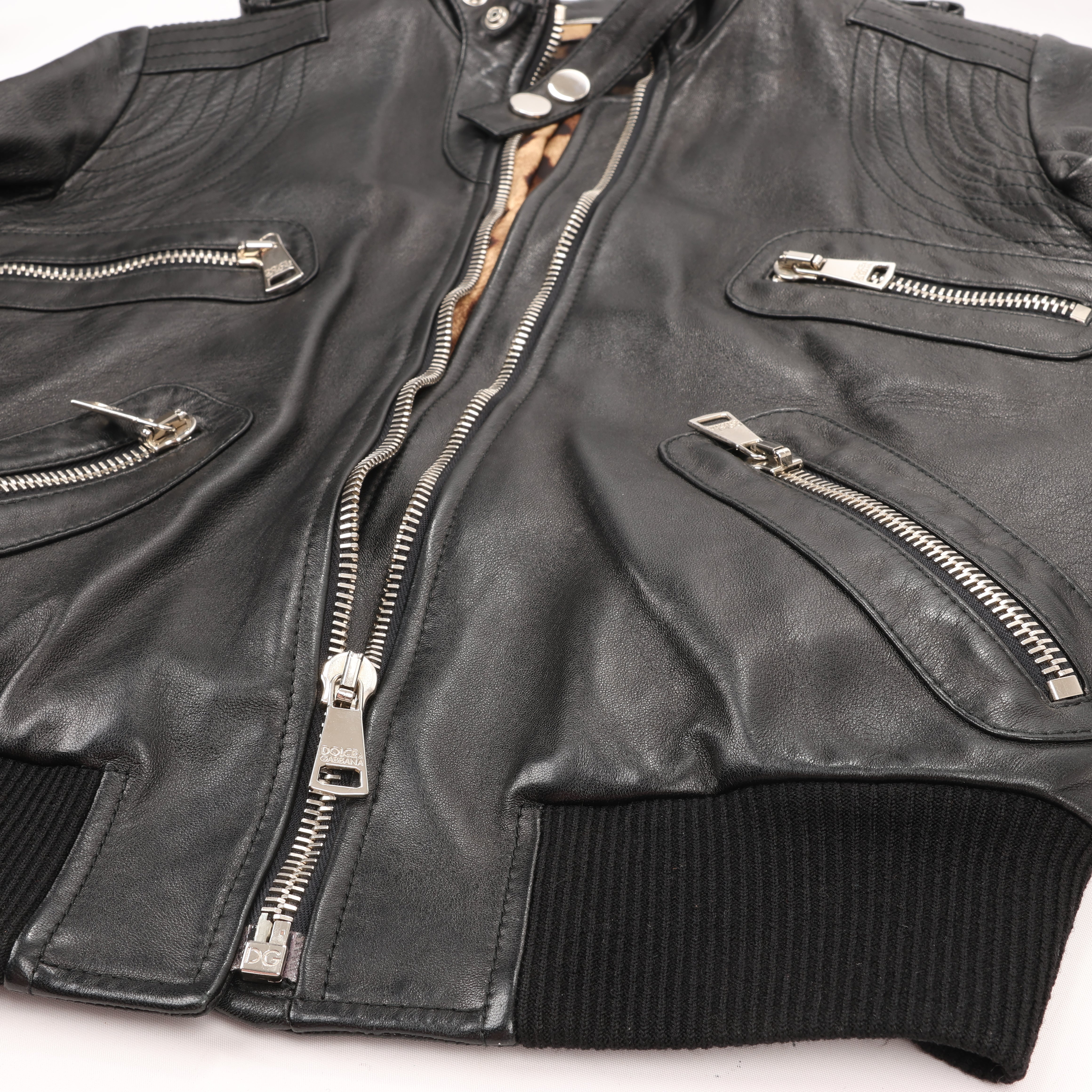 This edgy Dolce & Gabbana black leather biker jacket features multiple zippered pockets, ribbed cuffs and hem, and a snap-button collar. The interior boasts a bold leopard print lining. Made from sheepskin, this stylish piece is size 38.