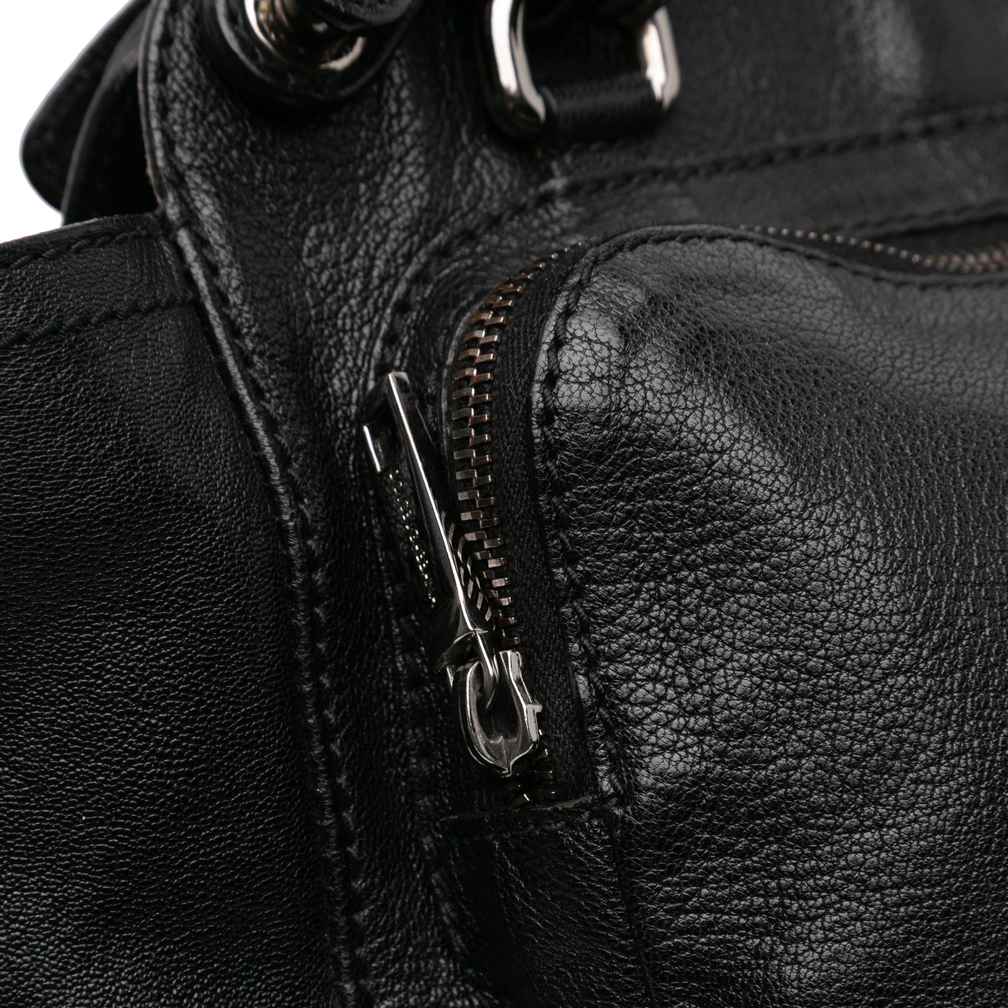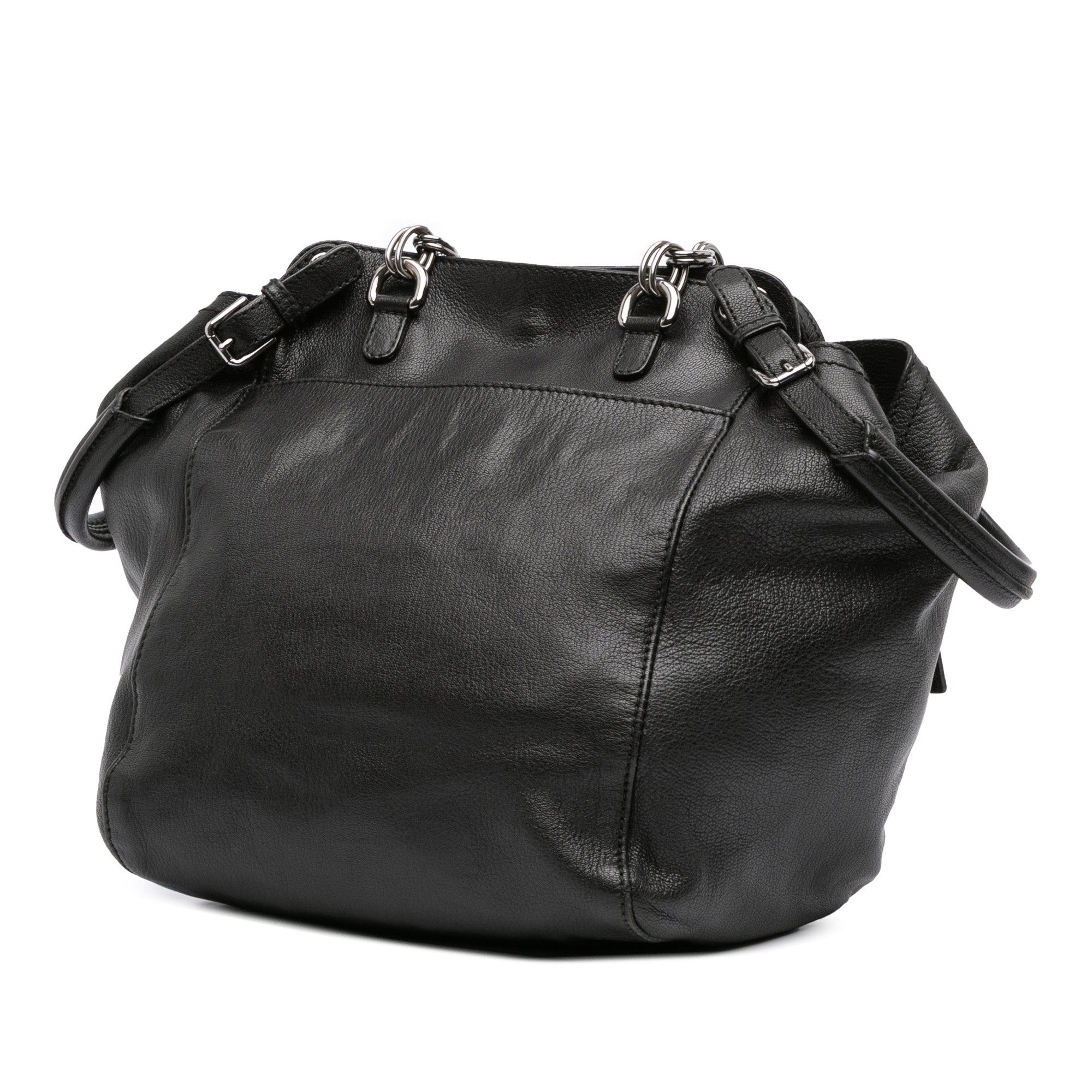 This satchel bag features a leather body, an adjustable flat leather top handle, a silver-tone curb chain link shoulder strap with leather guard, an open top with buckle closure, and an exterior front zip pocket, interior zip pocket. Inclusion: Dust bag. Retail Price: 500.00
