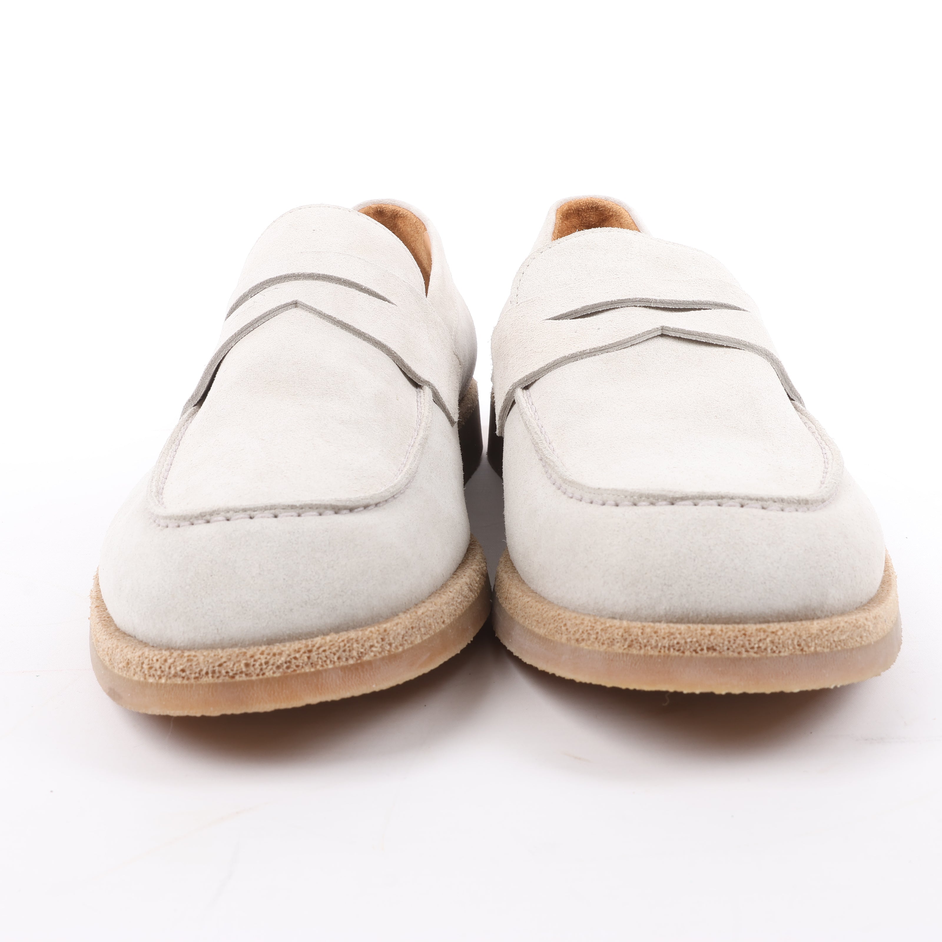 Refined and versatile, these Eleventy loafers in light gray suede exude understated elegance. Featuring a sleek penny strap and natural crepe sole, they’re perfect for smart-casual styling. Size 44 EU.