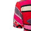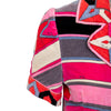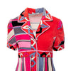 This Emilio Pucci Velvet Dress from the 90s is a vintage inspired piece that exudes luxury. Crafted from plush velvet toile fabric, this dress features a notched lapel collar and short sleeves, adorned with the brand's signature abstract print in vibrant colors and is complete with a snap button closure.