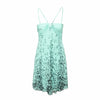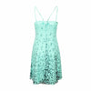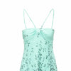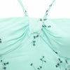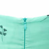 This silk dress in light turquoise with prints features a strap around the neck, double cotton lining, and a hidden back zipper for a comfortable fit.