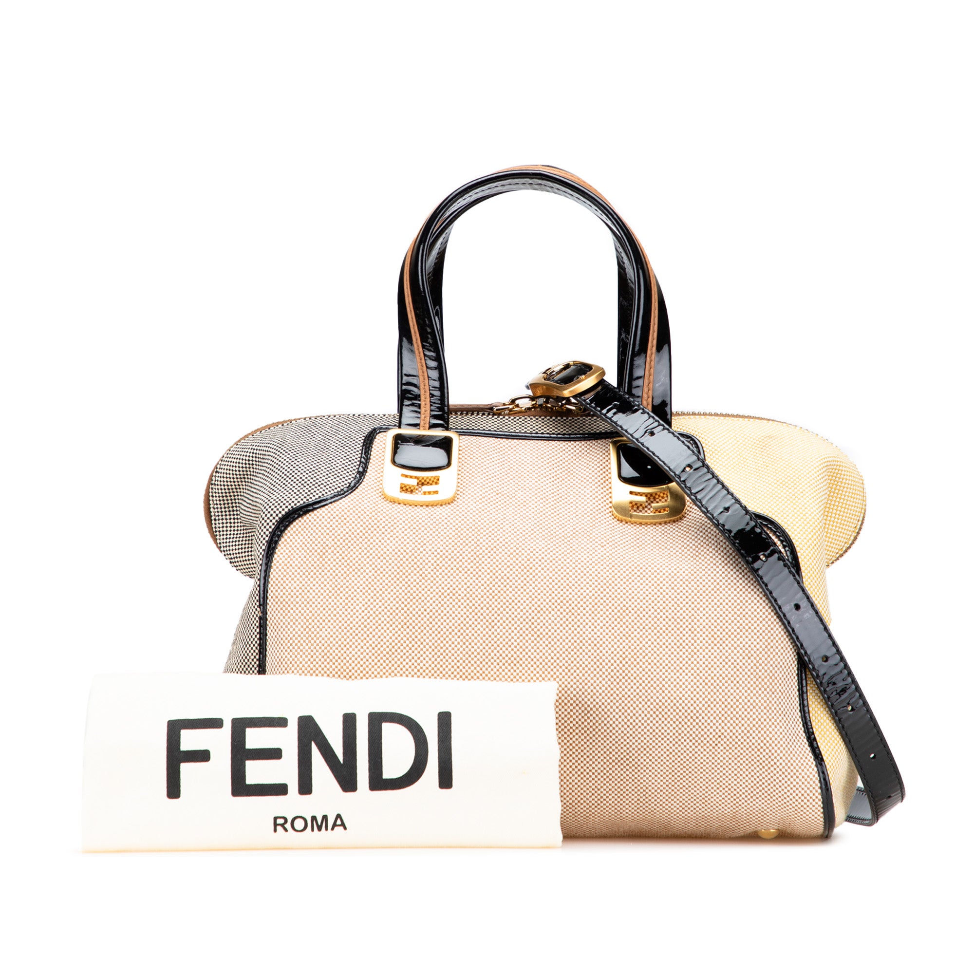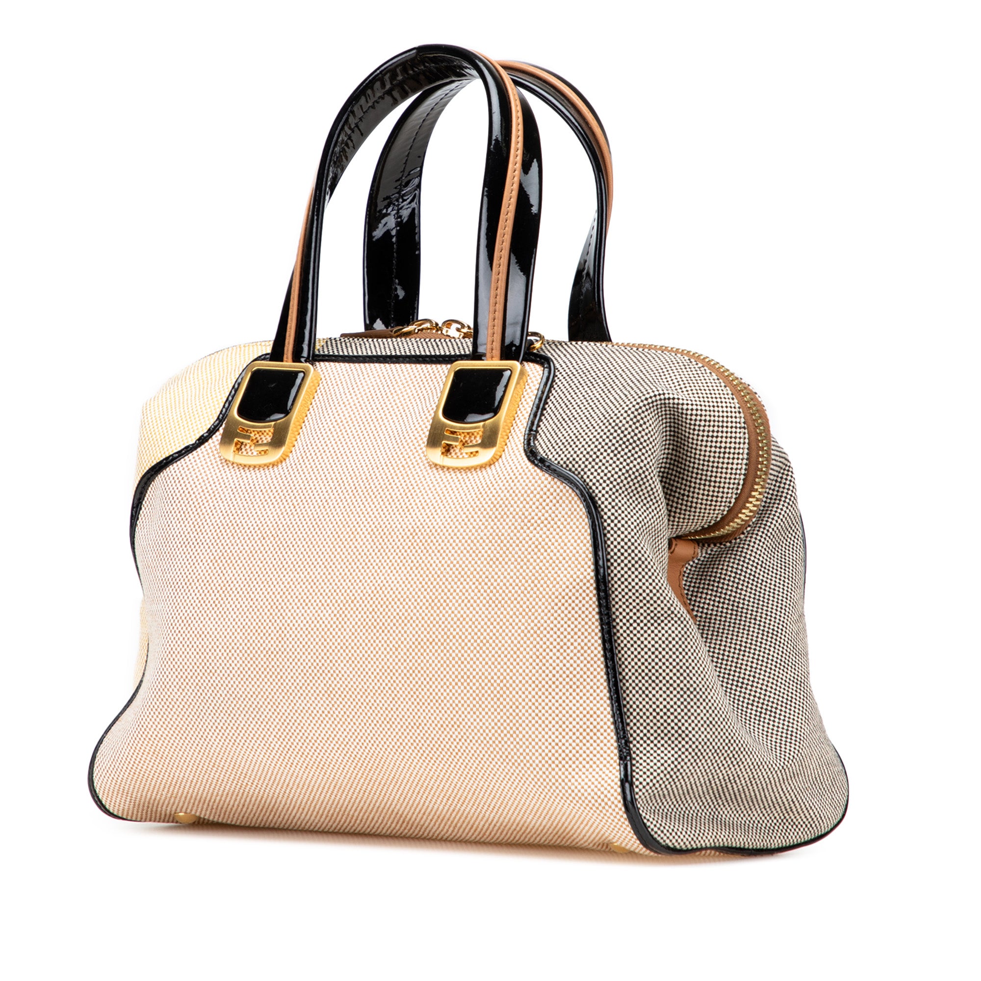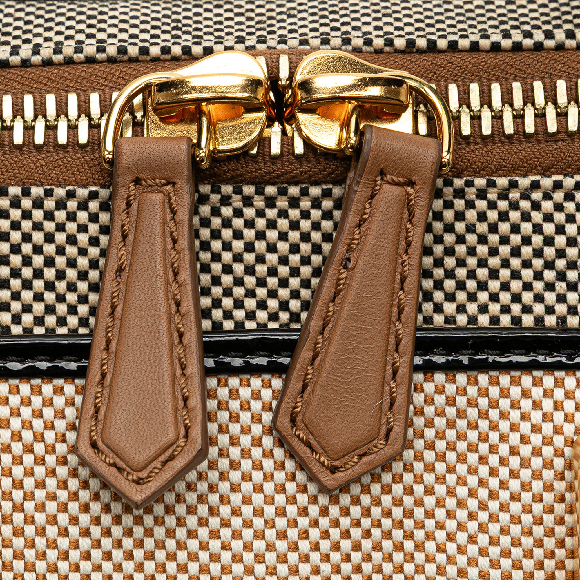 The Chameleon features a tricolor canvas body with leather trim, flat leather handles, a detachable flat leather strap, a top zip closure, an interior zip compartment, and interior slip pockets. Inclusion: Dust bag. Retail Price: 1908.00