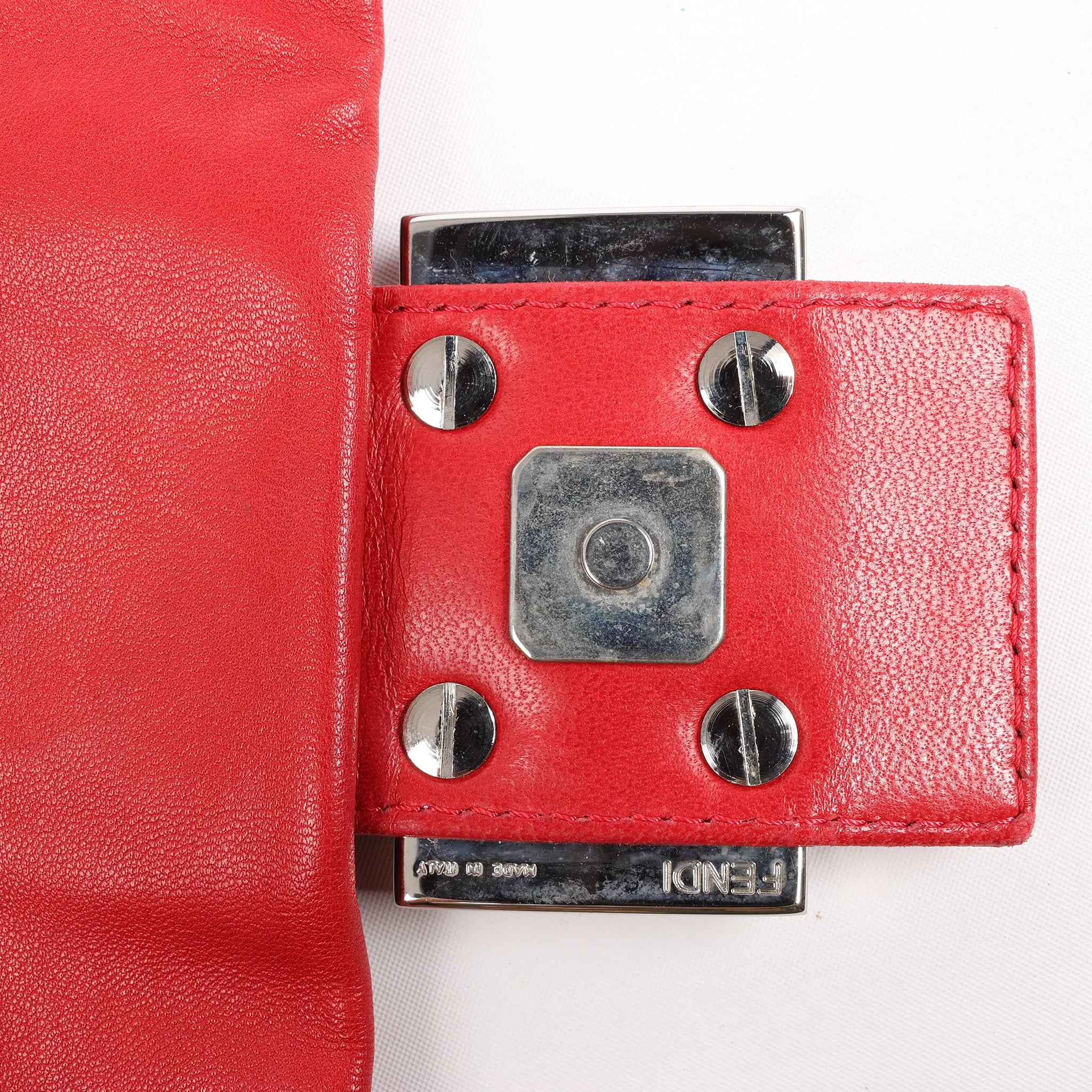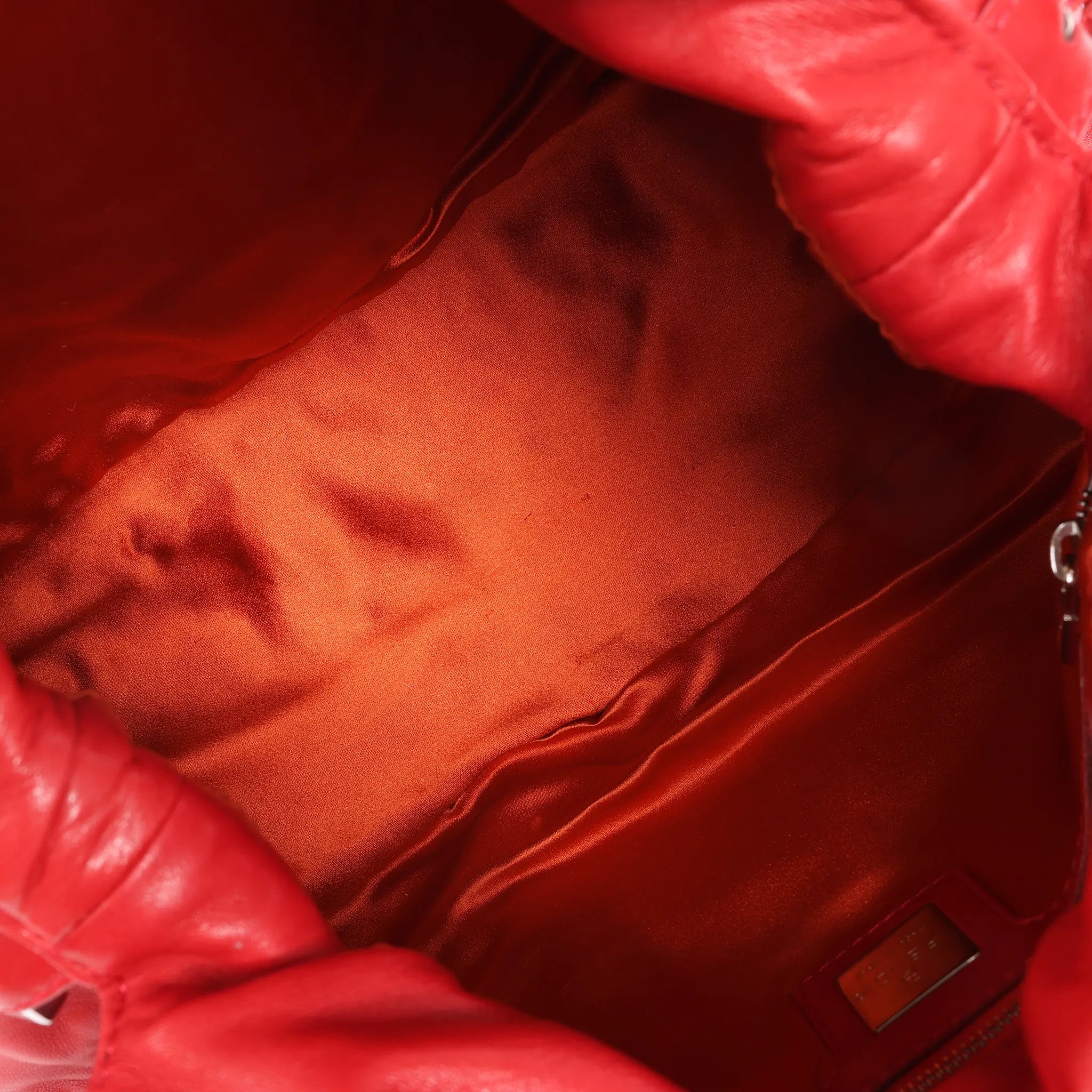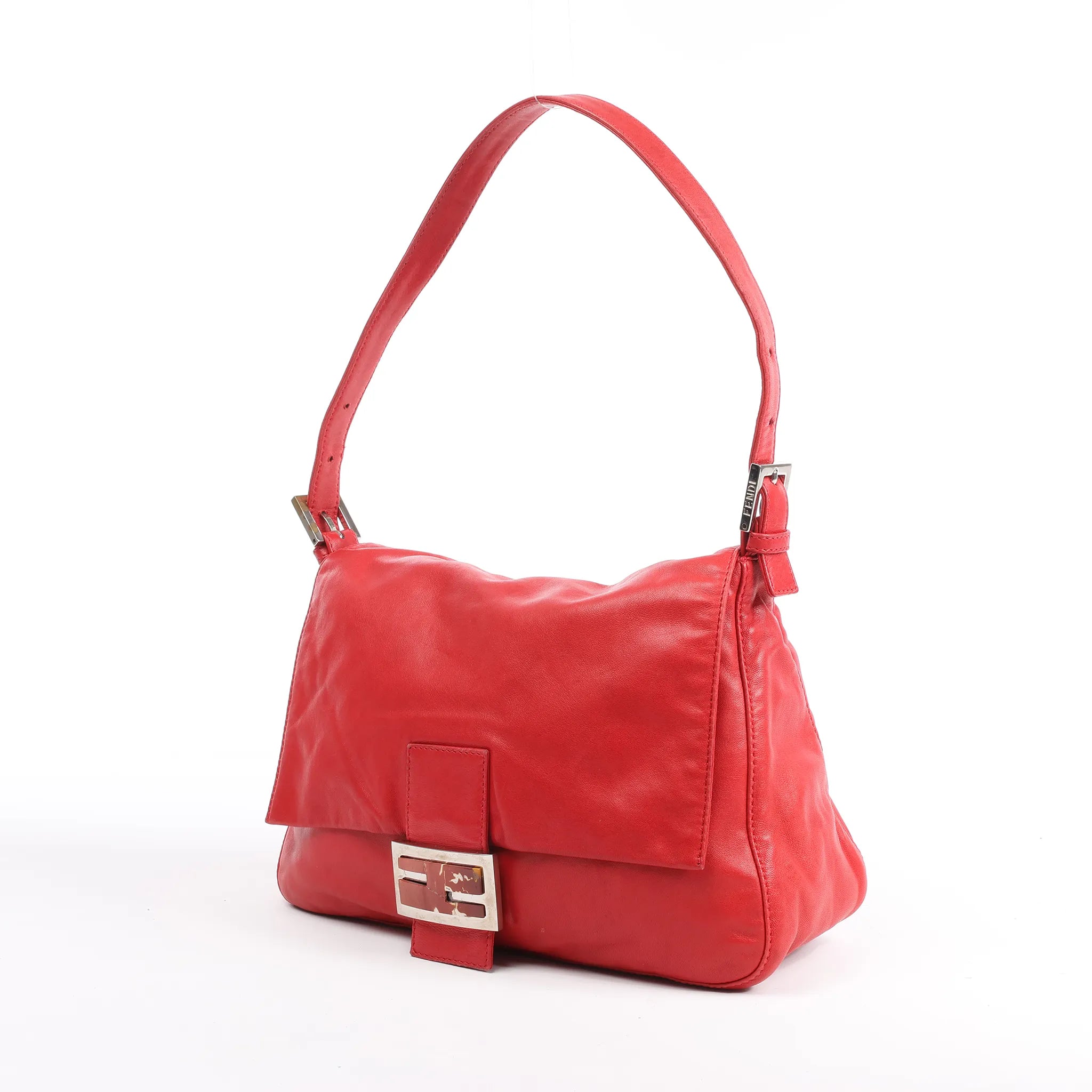 Brand: FENDI Model: Mamma BaguetteSize: - Width: 28 cmHeight: 19 cmExterior Condition: Very goodInterior Condition: ExcellentCondition Details: The exterior shows visible stains and signs of wear. The handle has cracked enamel and some creasing. The front logo is cracked and appears to have been glued. Hardware remains bright but shows scratches. The interior is in excellent condition.Colour: RedInterior Colour: RedHardware Colour: Dark SilverMaterial: LeatherComes With: -