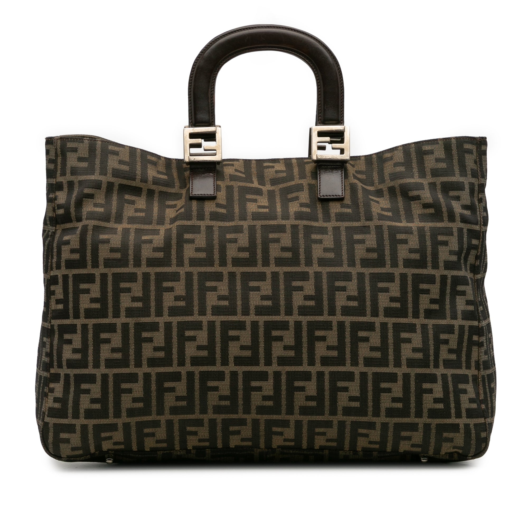 This tote bag features a canvas body, flat leather top handles, an open top with magnetic snap closure, and an interior zip pocket. Retail Price: 3590.00
