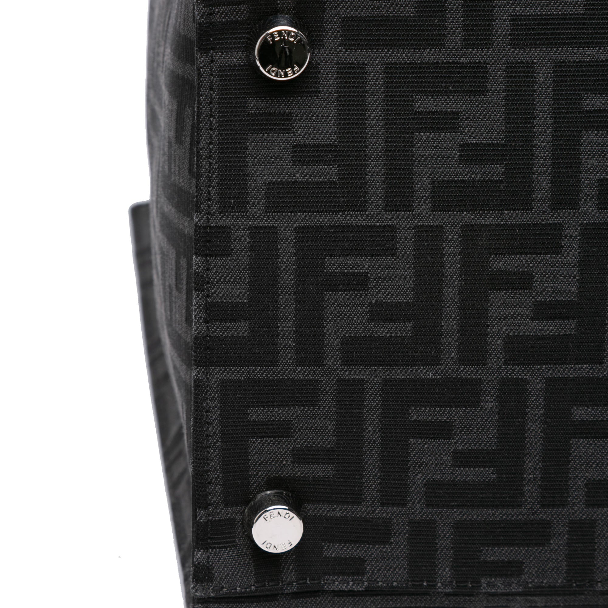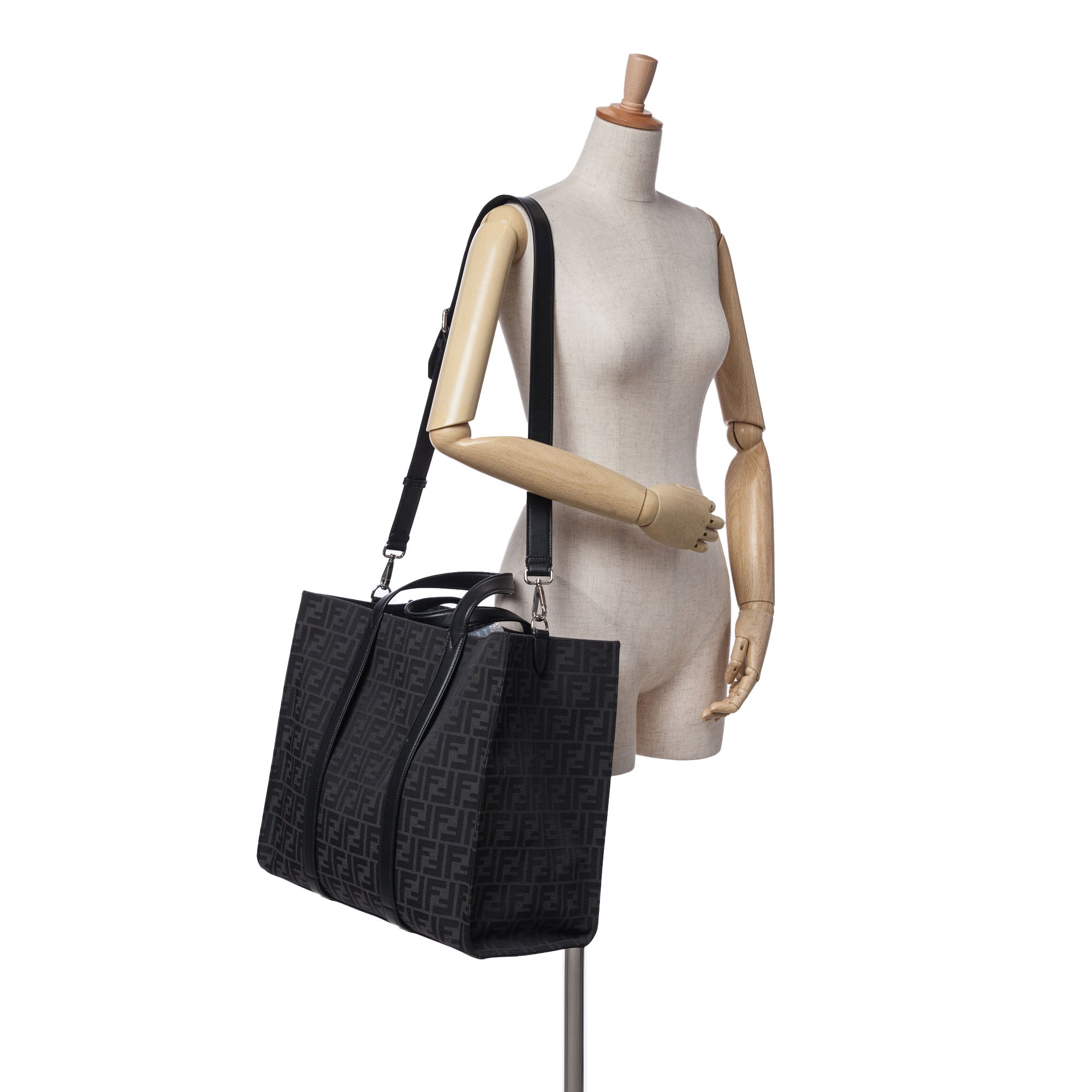 This satchel features a jacquard body with leather trim, flat leather handles, an adjustable and detachable flat leather strap, an open top, and an interior zip pocket. Retail Price: 2100.00