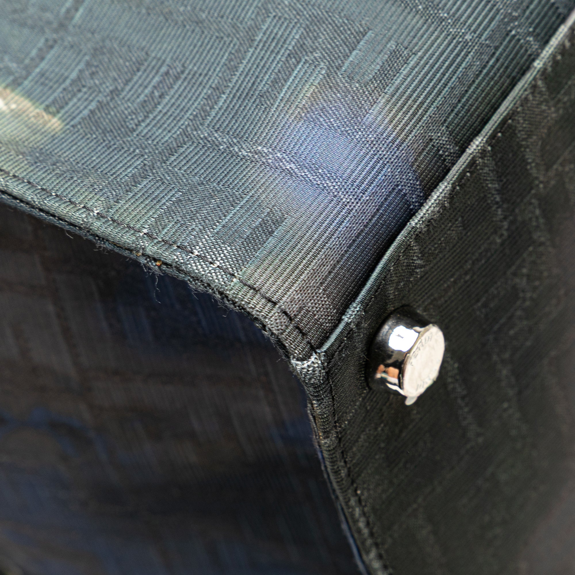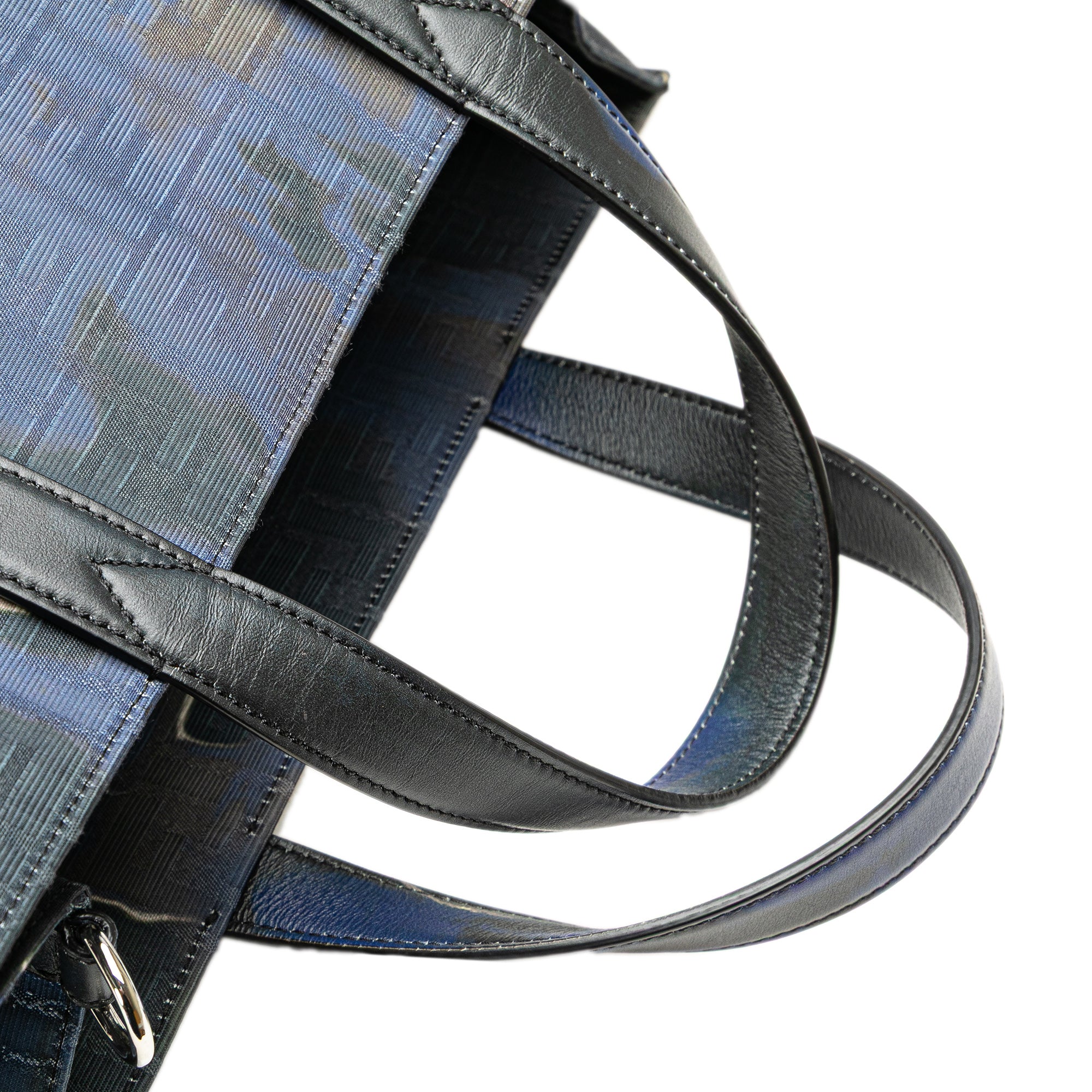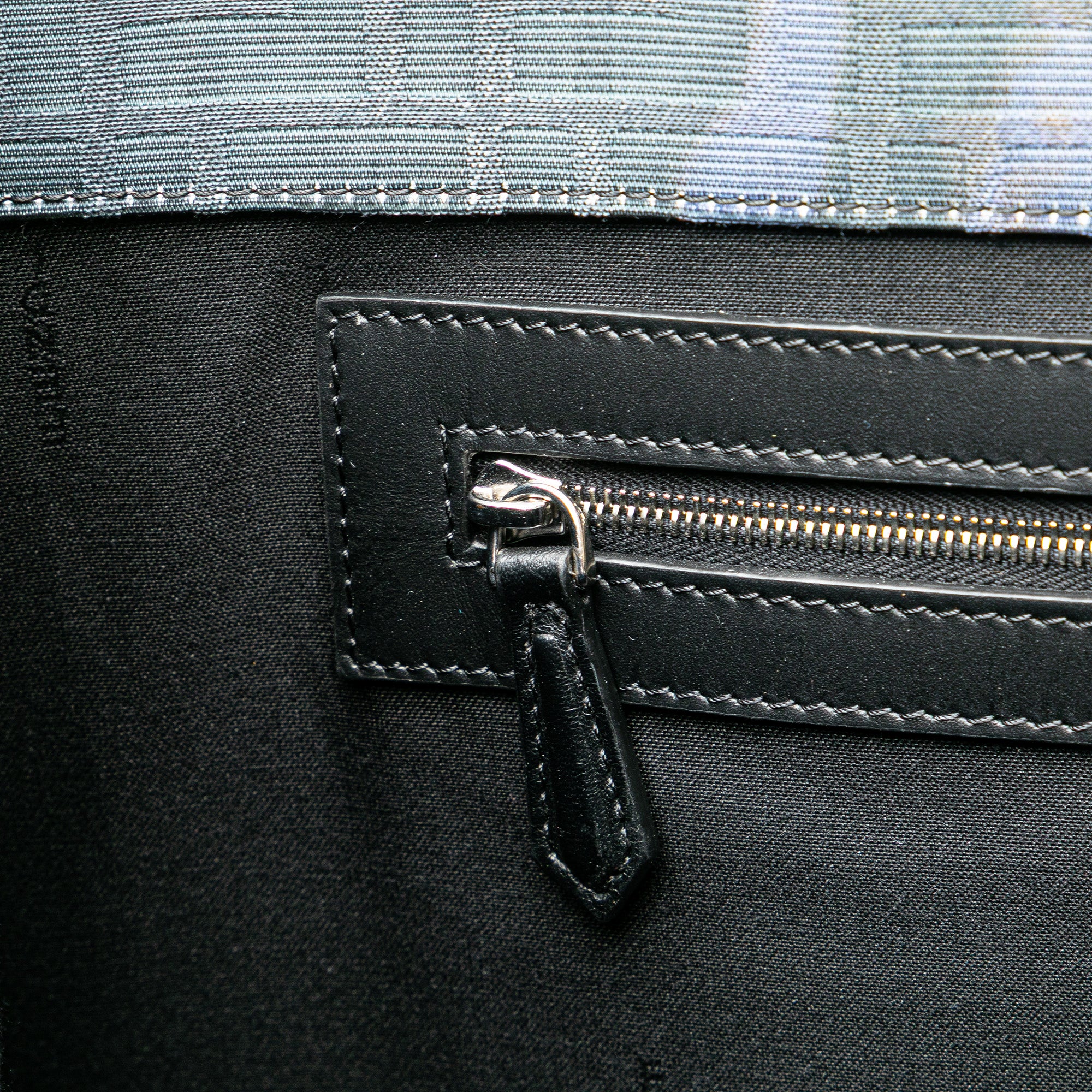 This satchel features a jacquard body with leather trim, flat leather handles, an adjustable and detachable flat leather strap, an open top, and an interior zip pocket. Retail Price: 2150.00